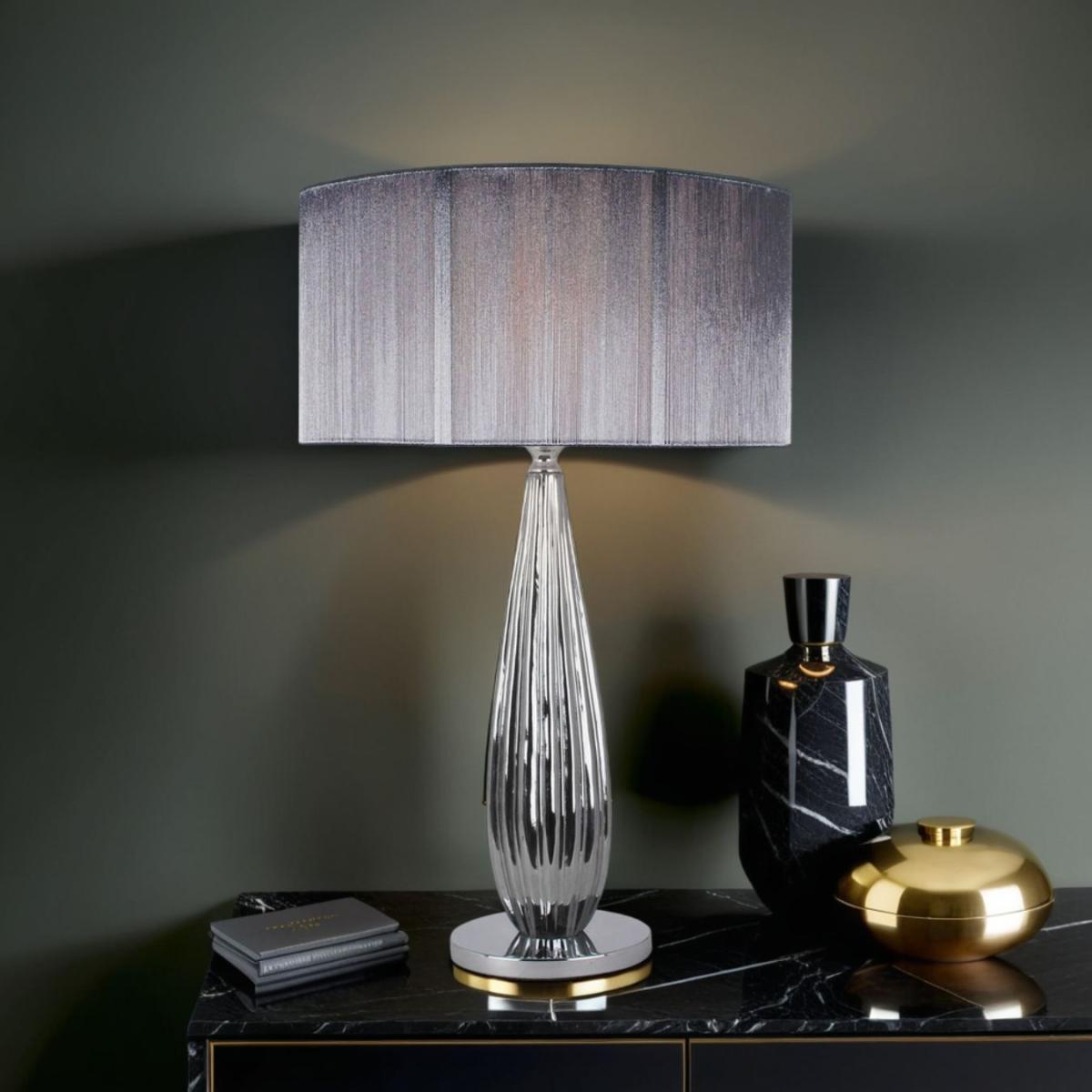 Conemporary table lamp boasting a polished chrome finish, complete with a silver lamp shade. A stylish addition to your home, the Slinky Table Lamp is a gorgeous piece from Pagazzi Lighting. Finished in polished chrome, the lamp boasts an extravagant base which has been paired with a luxurious metallic silver threaded shade. Operated by an in-line switch, it is perfect for use in lounges, hallways and bedrooms. Conemporary table lamp boasting a polished chrome finish, complete with a silver lamp shade. A stylish addition to your home, the Slinky Table Lamp is a gorgeous piece from Pagazzi Lighting. Finished in polished chrome, the lamp boasts an extravagant base which has been paired with a luxurious metallic silver threaded shade. Operated by an in-line switch, it is perfect for use in lounges, hallways and bedrooms.