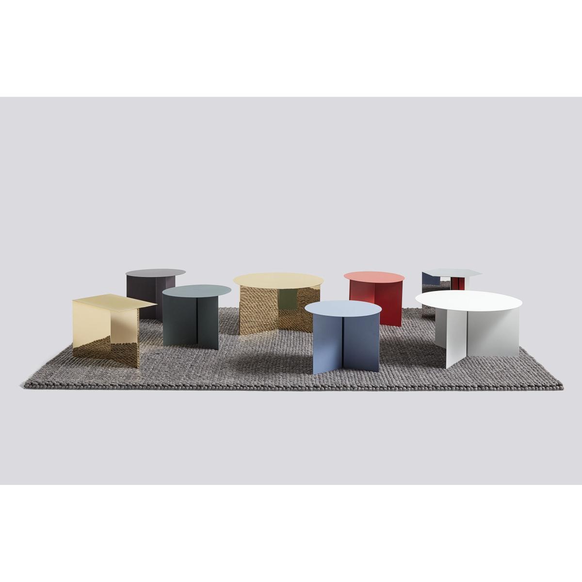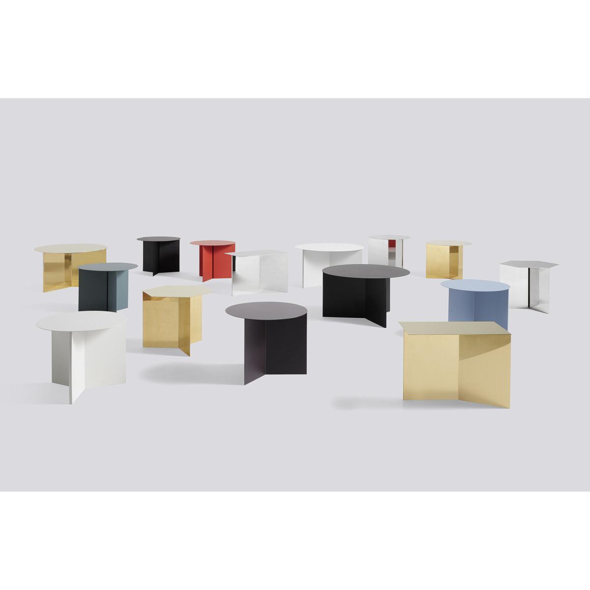 HAY's Slit Table is a simple metal side table in three shapes: round, rectangular and hexagonal. Slit Table is best described as paper origami translated into a metal universe, named after the slit that emerges when the plate frame is folded underneath the table top. The Slit Table is available in a variety of contemporary colours and finishes in many different combinations. Use them on their own or arrange in pairs or clusters.