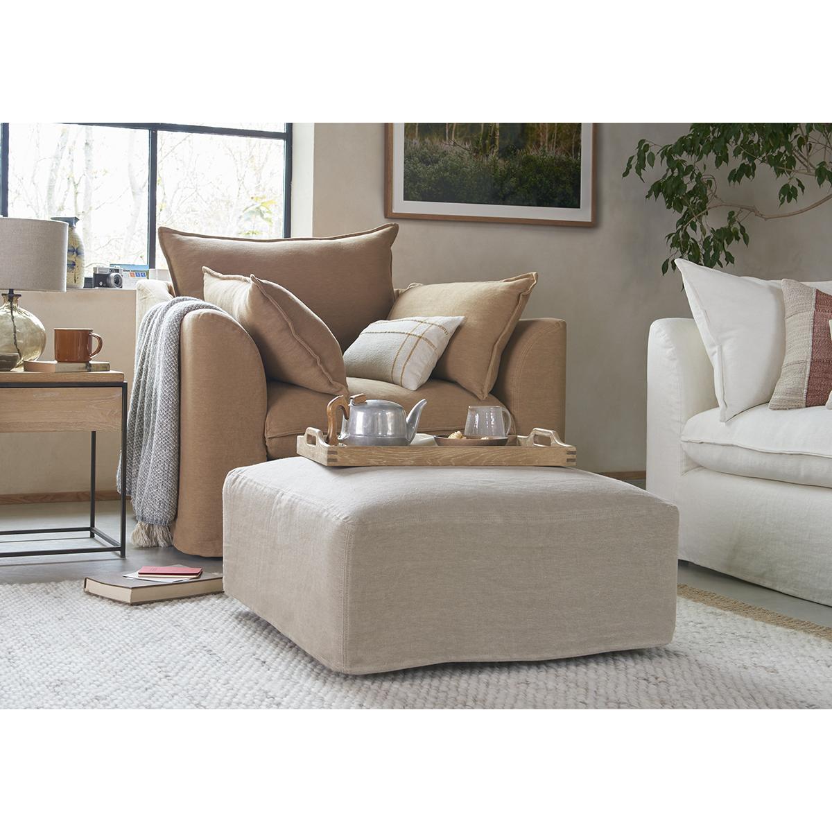 I love this footstool because of its versatility and understated style. It works particularly well in casual or contemporary interiors, adding a practical yet relaxed element to living rooms, bedrooms, or even cosy reading nooks. The slipcover design makes it easy to update or spot clean, which is ideal for busy households. For styling tips, consider pairing it with layered textiles like soft throws and leather or woven cushions for a welcoming vibe. It also works beautifully with a variety of colour schemes; a neutral like this can serve as a subtle anchor or a blank canvas for more vibrant accents. Overall, it’s a practical piece that enhances comfort without compromising on style.