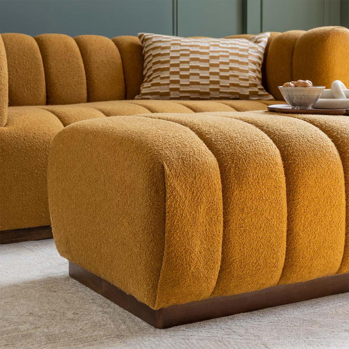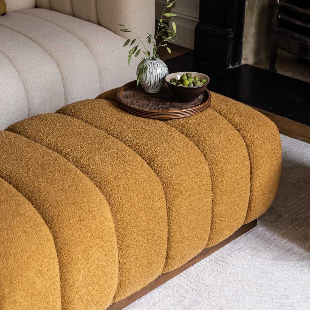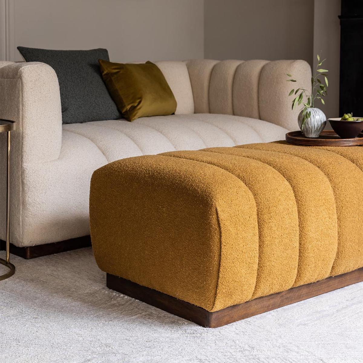 This modern yellow ottoman is perfect for placing in front of the other pieces in the Sloane collection. Position at the bottom of your bed for a handy place to sit when getting undressed or use for putting your feet up when sitting on the sofa. Comprising fluted details and soft curves upholstered in mustard bouclé – a fashionable looped yarn – Sloane taps into the on trend ‘cloud’ aesthetic. A wooden plinth in a warm mango finish completes the look. The elegant bench-like shape makes it perfect for putting your feet up or accessorising with coffee table books. Or why not bump up the ottoman so it is touching the sofa to create a daybed. The mustard ottoman is also available in a natural bouclé.