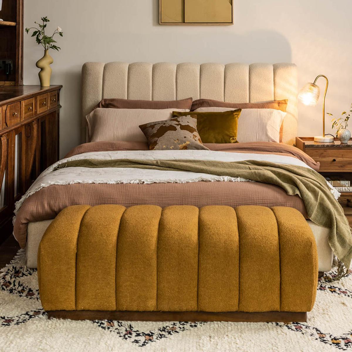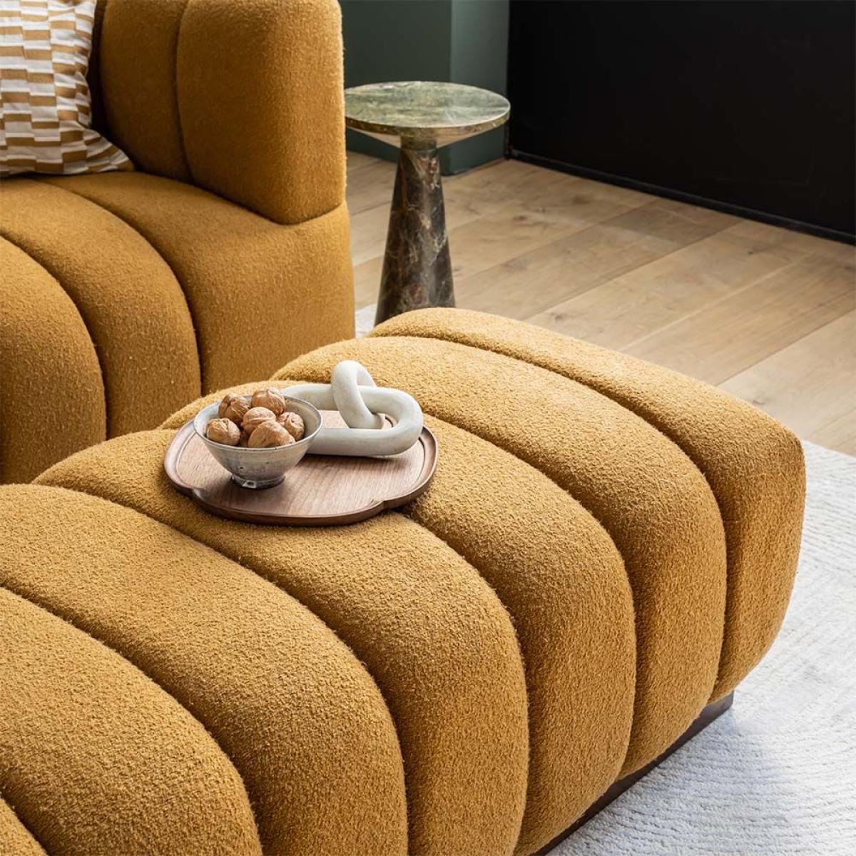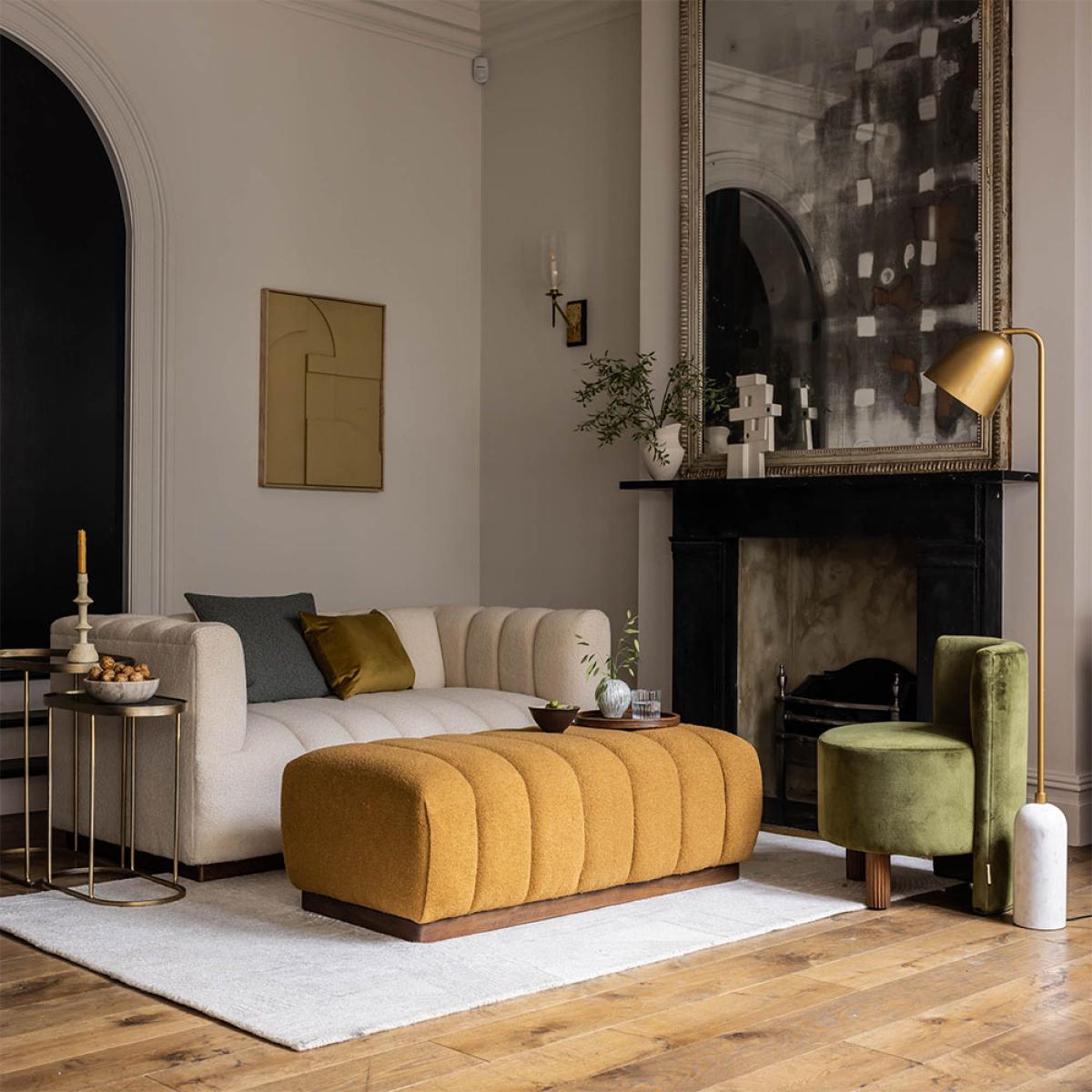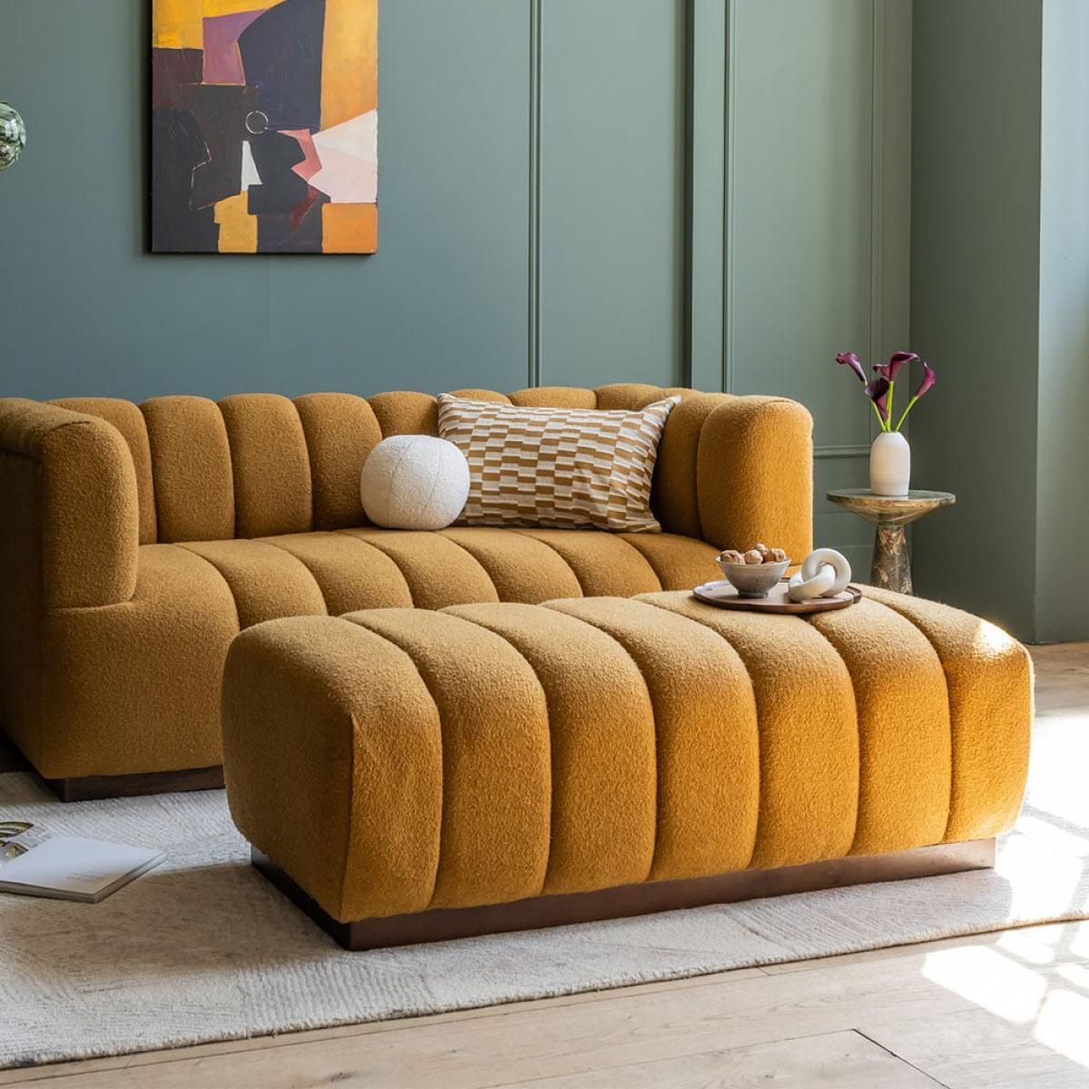 This modern yellow ottoman is perfect for placing in front of the other pieces in the Sloane collection. Position at the bottom of your bed for a handy place to sit when getting undressed or use for putting your feet up when sitting on the sofa. Comprising fluted details and soft curves upholstered in mustard bouclé – a fashionable looped yarn – Sloane taps into the on trend ‘cloud’ aesthetic. A wooden plinth in a warm mango finish completes the look. The elegant bench-like shape makes it perfect for putting your feet up or accessorising with coffee table books. Or why not bump up the ottoman so it is touching the sofa to create a daybed. The mustard ottoman is also available in a natural bouclé.