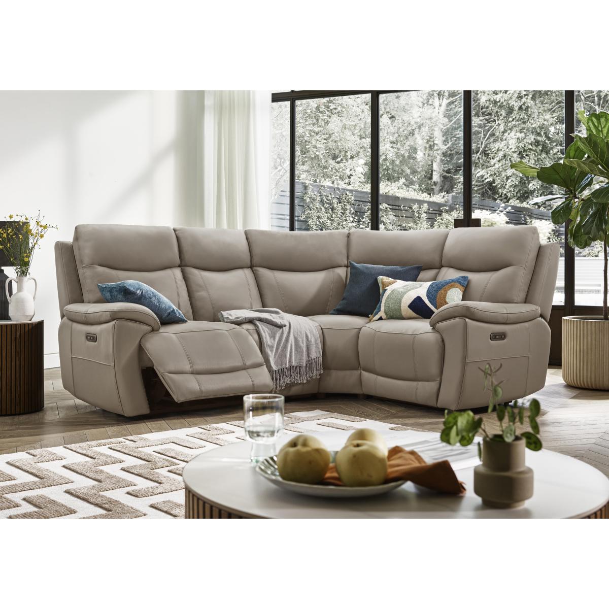 Comfort, style and value – our Sloane range is the original triple threat. With power recliners, pocket sprung seat interiors, fibre-filled back cushions and wide well-padded arms, you’ll enjoy superb comfort and excellent support. Contemporary in style with generous curves and invitingly deep seats, the range’s sofas, armchairs and footstools fit effortlessly into all design and decor schemes, plus they’re available in your choice of 100% leather upholstery and soft fabric in a selection of colours. And all that for a really incredible price. The Sloane range is handmade exclusively for Furniture Village. Corner sofas are made for relaxing especially if, like this one, they come with power recliners and pocket spring seat cushioning. Handcrafted. Why you'll love it Comfort, style and value – what more could you wish for? This small leather corner sofa has smooth power recliners for effortless relaxation. Seat cushions are filled with pocket springs for the ultimate in comfort and support. USB device charging built in. Available with the corner on either the left- or the right-hand side. In a wide choice of on-trend colours for the 100% leather upholstery. No handy power source? You can have this corner sofa without power recliners. Handmade exclusively for Furniture Village. This small power recliner leather corner sofa is part of our Sloane range. What you need to know Medium comfort level. Seat suspension: sinuous spring. Seat cushioning: pocket spring. Cushioning is fixed. Back support: webbing. Back cushioning: fibre. Cushioning is fixed. Arm cushioning: foam and Dacron. Cushioning is fixed. To smooth and straighten fixed cushions, punch the back cushion’s top two corners and the seat cushion’s outer two corners, and pinch outwards. Please allow time for new recliners to ease. Minor gaps are necessary to ensure ease of recliner motion and may be exaggerated depending on floor type. The non-power recliner version of this sofa does not have USB device charging. Leather has unique marks and characteristics with variation in colour and texture. Leather softens with use. To smooth and straighten fixed cushions, punch the back cushion’s top two corners and the seat cushion’s outer two corners, and pinch outwards. Please read our upholstery care guide for more advice. Item code: SLOALCP-LTH-008