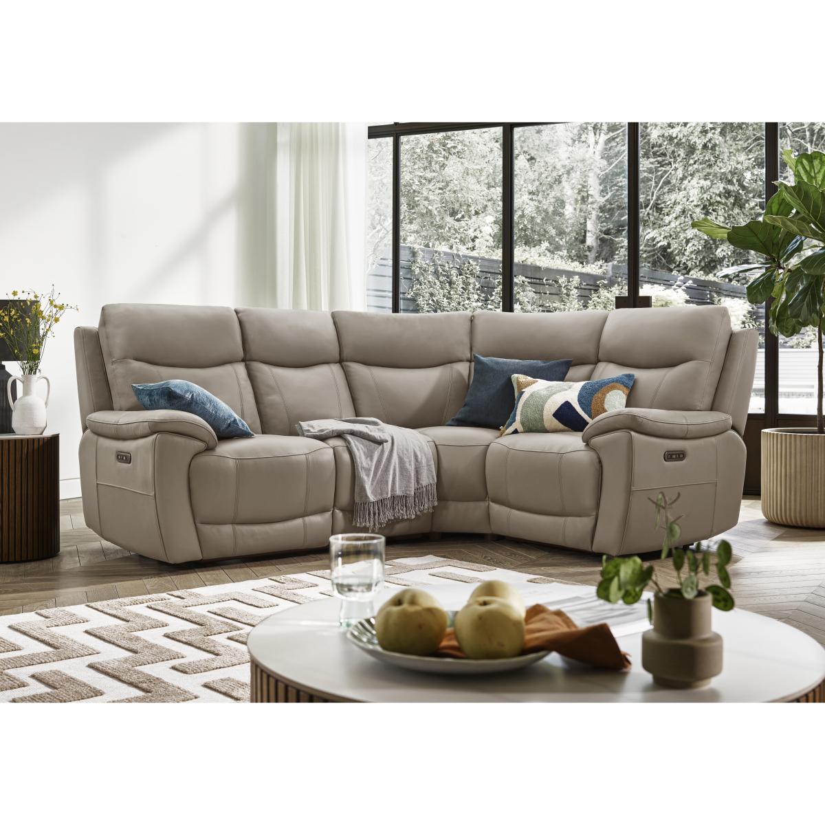 Comfort, style and value – our Sloane range is the original triple threat. With power recliners, pocket sprung seat interiors, fibre-filled back cushions and wide well-padded arms, you’ll enjoy superb comfort and excellent support. Contemporary in style with generous curves and invitingly deep seats, the range’s sofas, armchairs and footstools fit effortlessly into all design and decor schemes, plus they’re available in your choice of 100% leather upholstery and soft fabric in a selection of colours. And all that for a really incredible price. The Sloane range is handmade exclusively for Furniture Village. Here’s the perfect leather corner sofa for a smaller living space. This one has power headrests, power recliners and pocket spring seat cushions. Why you'll love it Comfort, style and value – what more could you wish for? This small leather corner sofa has both power recliners and power headrests. Seat cushions are filled with pocket springs for the ultimate in comfort and support. USB device charging built in. Available with the corner on either the left- or the right-hand side. In a wide choice of on-trend colours for the 100% leather upholstery. Handmade exclusively for Furniture Village. This small power recliner leather corner sofa is part of our Sloane range. What you need to know Medium comfort level. Seat suspension: sinuous spring. Seat cushioning: pocket spring. Cushioning is fixed. Back support: webbing. Back cushioning: fibre. Cushioning is fixed. Arm cushioning: foam and Dacron. Cushioning is fixed. To smooth and straighten fixed cushions, punch the back cushion’s top two corners and the seat cushion’s outer two corners, and pinch outwards. Please allow time for new recliners to ease. Minor gaps are necessary to ensure ease of recliner motion and may be exaggerated depending on floor type. Leather has unique marks and characteristics with variation in colour and texture. Leather softens with use. To smooth and straighten fixed cushions, punch the back cushion’s top two corners and the seat cushion’s outer two corners, and pinch outwards. Please read our upholstery care guide for more advice. Item code: SLOARCPPLTH-008