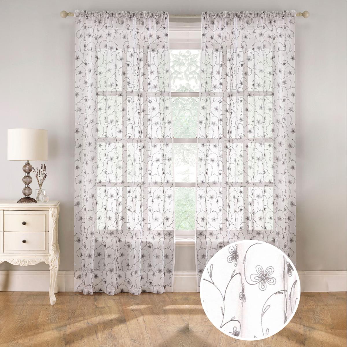 Slot Top Sheer Linen Look Voile Panels with Floral Print and sequins - Pair - Grey / 122cm