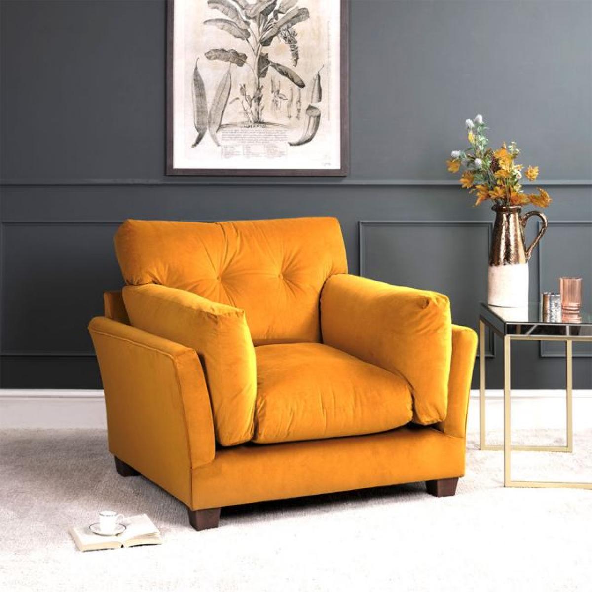 The slouch armchair is beautifully inviting in a fabulous ochre yellow velvet with plush cushions ready for you to relax. Proudly hand crafted in the UK the Slouch armchair offers a deep and cosy design and will perfectly compliment the rest of the Slouch range of 2 and 3 seater sofas. Dimensions: W120cm x H92cm x D99cm Hand crafted with pride in the UKSolid hardwood feet. Simple self assembly