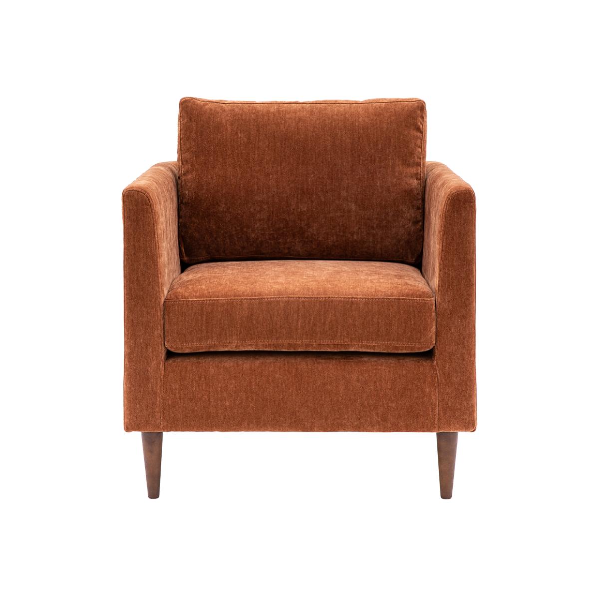 I’m a fan of this rust armchair for its warm, adaptable hue and the soft corduroy-style upholstery that adds just the right amount of texture. Its clean lines and slim arms suit mid-century modern, industrial lofts or relaxed boho spaces, especially when set against neutral walls or deep jewel-toned backdrops. For styling, pop a patterned cushion or a knitted throw in complimentary shades of ochre or teal over the back. Tuck it beside a slender metal-leg side table or a minimalist floor lamp to keep the look balanced and uncluttered.