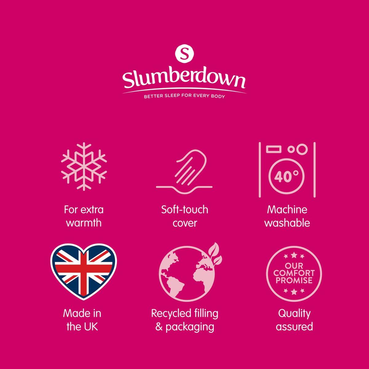At Slumberdown, we believe every body deserves a better night sleep. The Slumberdown Extra Warm 15 Tog Duvet has been created for those cold nights or those that like to be super warm and cosy in bed. The soft touch cover is wonderfully soft ensuring you stay perfectly comfortable and cosy all night. What's more, the product is Easy Care which means its machine washable and can be tumble dried. Super king duvet. 15 tog duvet. Cover made from 100% polyester. Filling made from 100% recycled polyester. Size L260, W220cm. Machine washable. Suitable for washing in a standard size washing machine. Suitable for tumble drying. Non-allergenic. Manufacturer's 1 year guarantee.