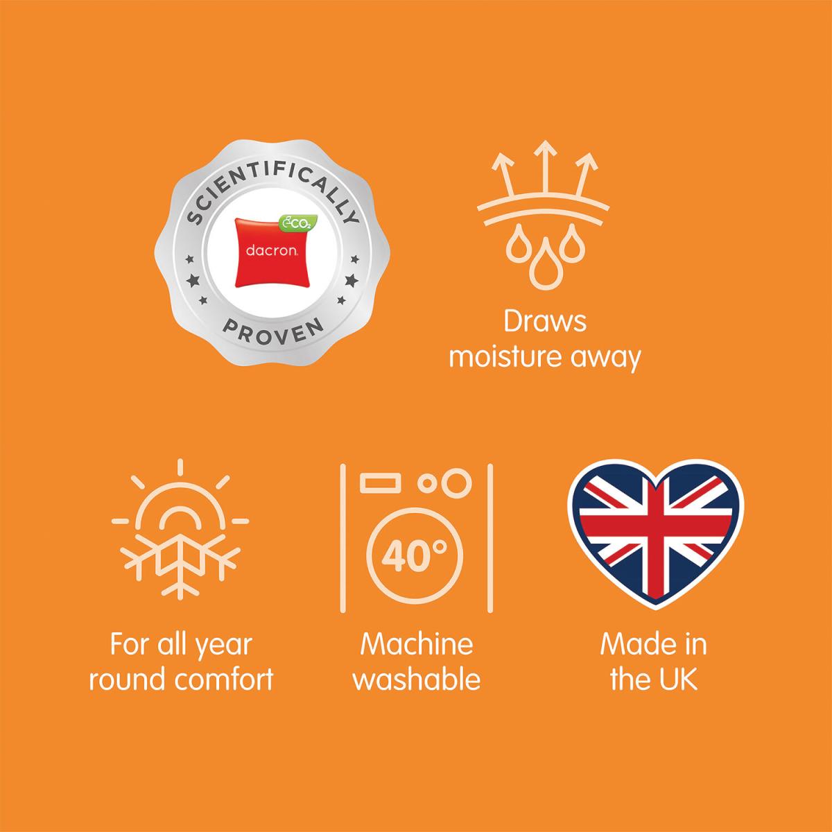 No matter the season, this sustainable Slumberdown 10.5 Tog Climate Control Duvet is specially designed to help you maintain a comfortable temperature at night thanks to the 100% recycled polyester filling. Its unique fibres draw moisture into the outer layer where it is quickly evaporated to maintain the perfect temperature whilst you sleep. Its built in temperature control prevents you from overheating whilst keeping you warm and comfortable, providing a relaxing and rejuvenating rest.