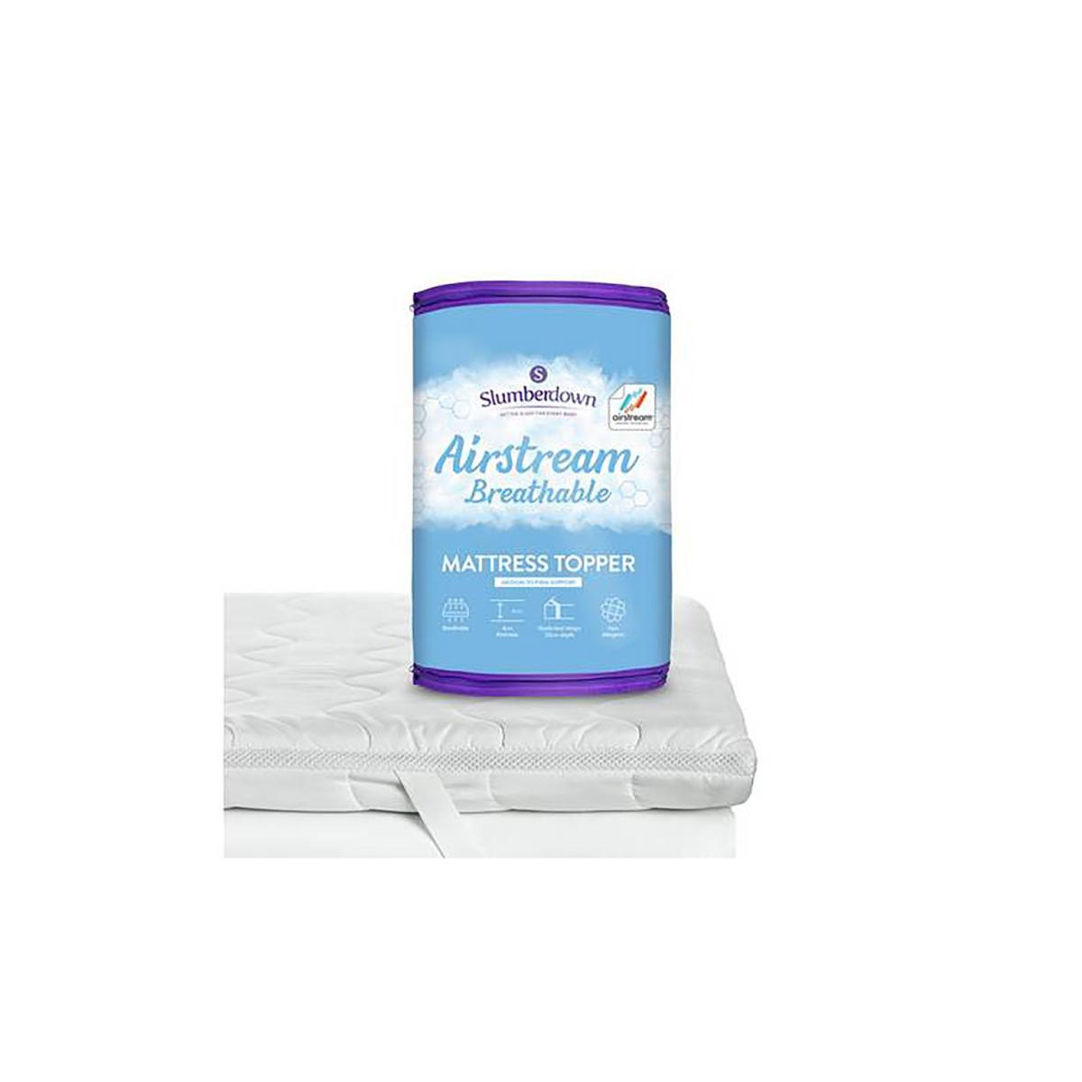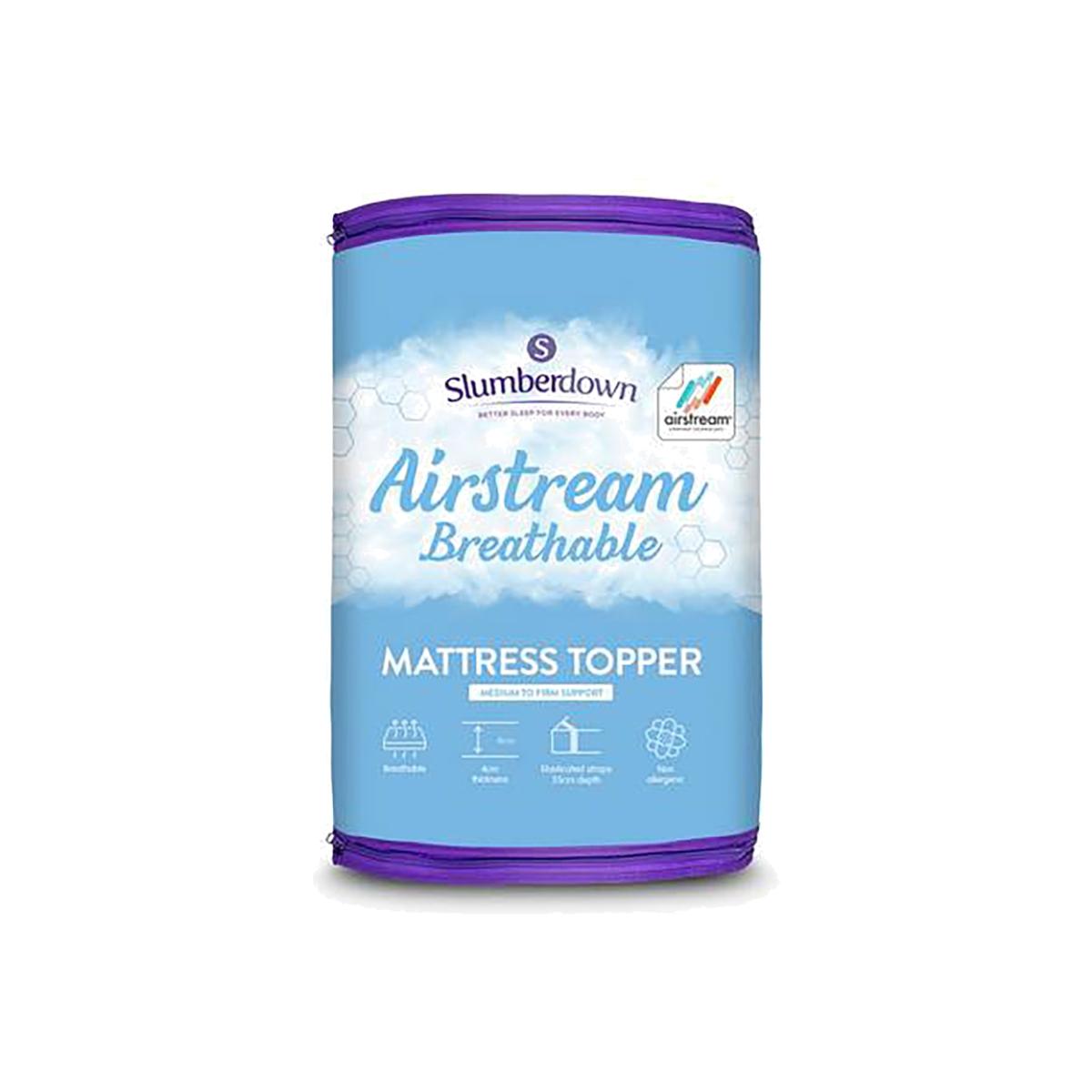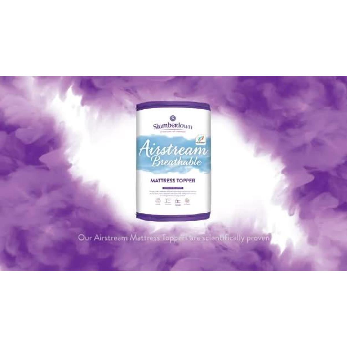Amazingly comfy & cooler than memory foam, the Airstream Topper will revolutionise your mattress comfort. The topper is 4.5cm thick so it's deep enough to support your contours keeping you spine nice and straight. What's more, it's proven to be significantly cooler than memory foam thanks to Slumberdown's clever Airstream technology. Please note this product has been vac-sealed to reduce its carbon footprint. Upon opening, please shake the topper and lie it flat to allow the topper to recover fully. Suitable for king size beds. Cover made from 100% polyester microfibre. 100% polyester reverse. 100% polyester filling. Secured by elasticated corner straps. Non-allergenic. Cover is machine washable covers at 40 C.