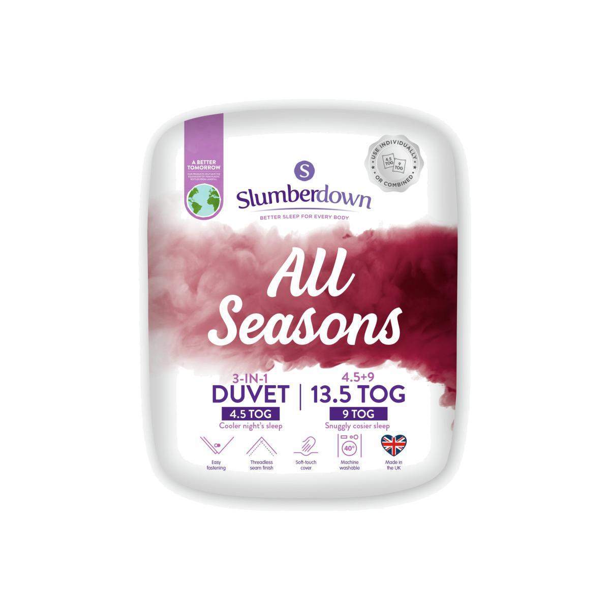 At Slumberdown, we believe every body deserves a better night sleep. The All Seasons Duvet is perfect for all year round use. The 4.5 Tog duvet keeps you cool on warmer nights and the 9 Tog is perfect as temperatures drop. The duvets can be combined with corner poppers to create a 13.5 Tog duvet, which will ensure you stay warm on the cold nights. What's more, the product is Easy Care which means its machine washable and can be tumble dried.
