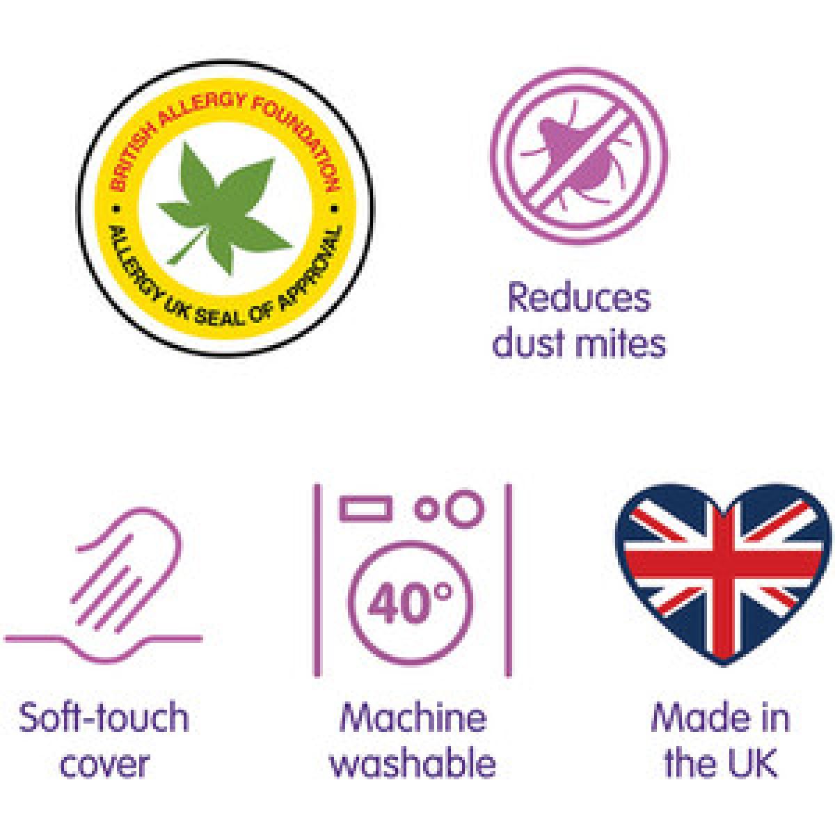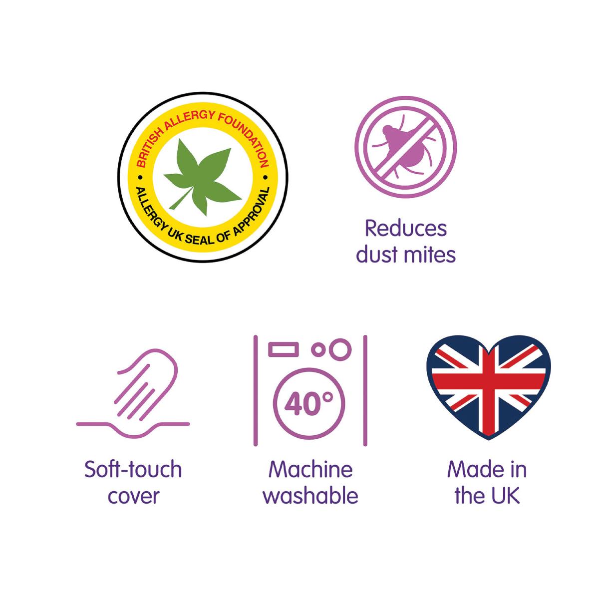 A family favourite, this machine washable Slumberdown Anti Allergy 10.5 Tog Duvet is ideal for allergy sufferers and the perfect quilt to keep you warm and toasty. With a light and fluffy 100% recycled polyester hollowfibre filling and soft touch cover, this sustainable duvet has anti-bacterial and anti-fungal properties, offering protection from dust mites, bacteria and fungus for a better night's sleep.