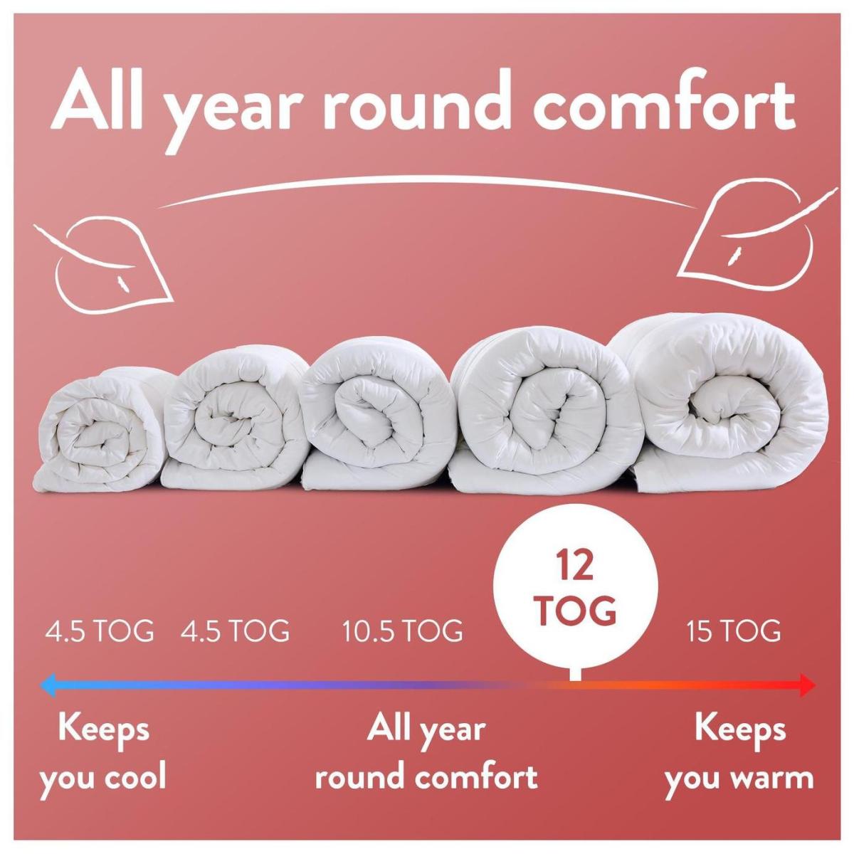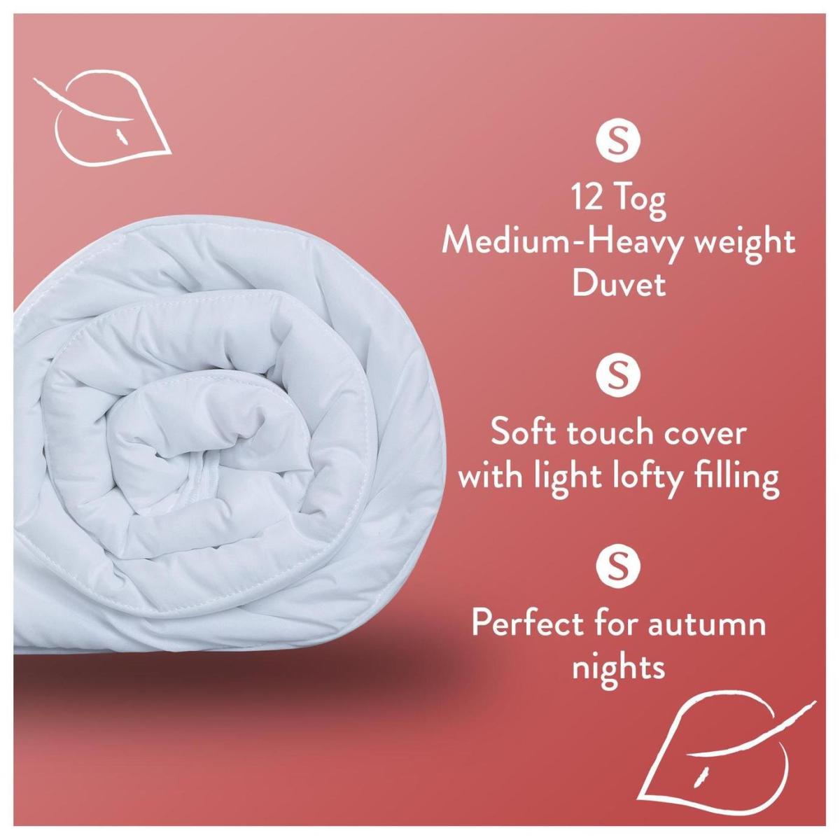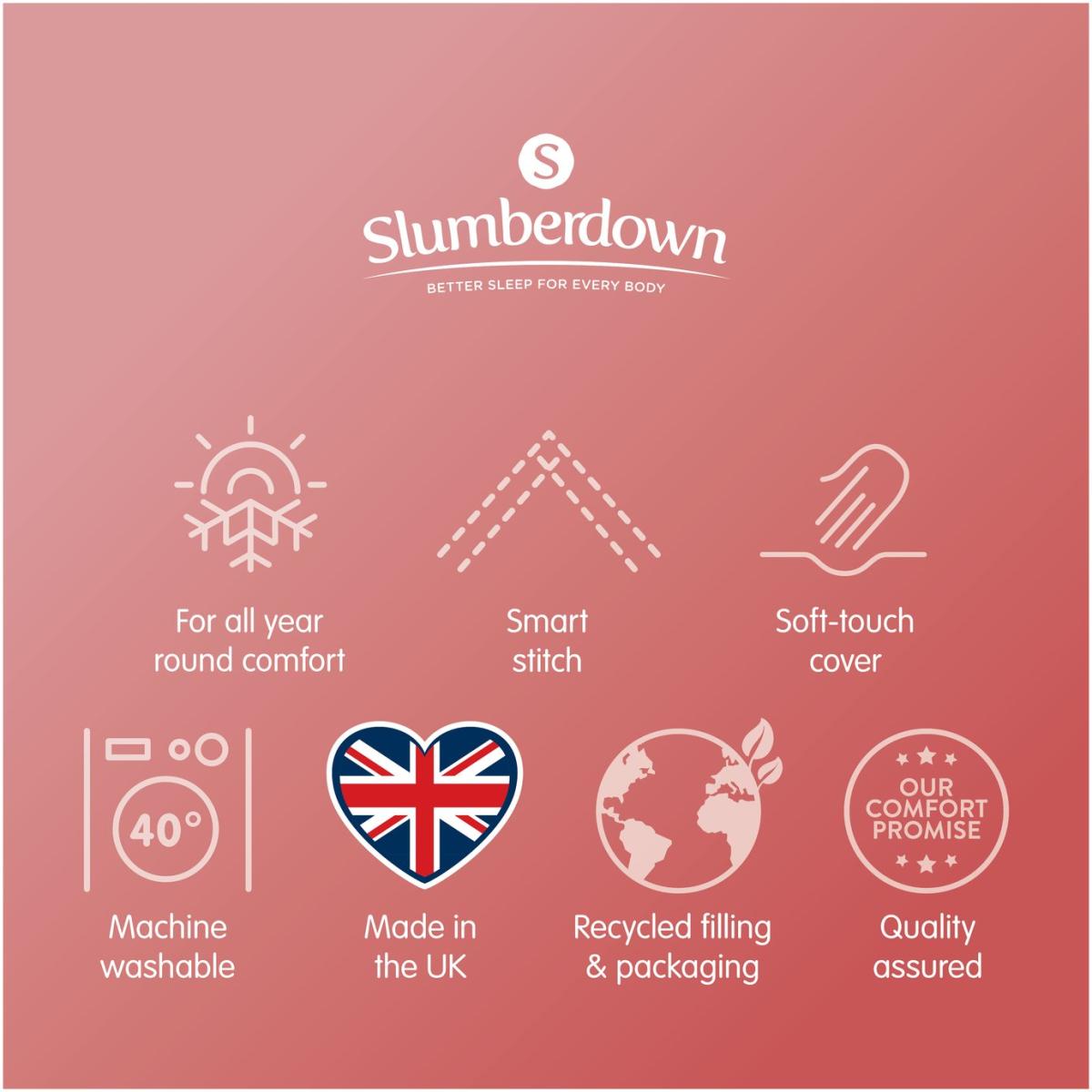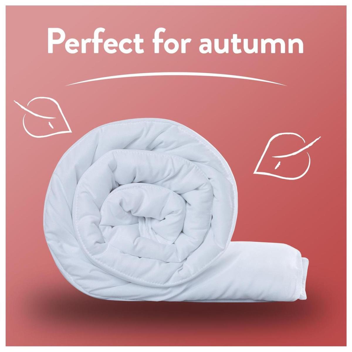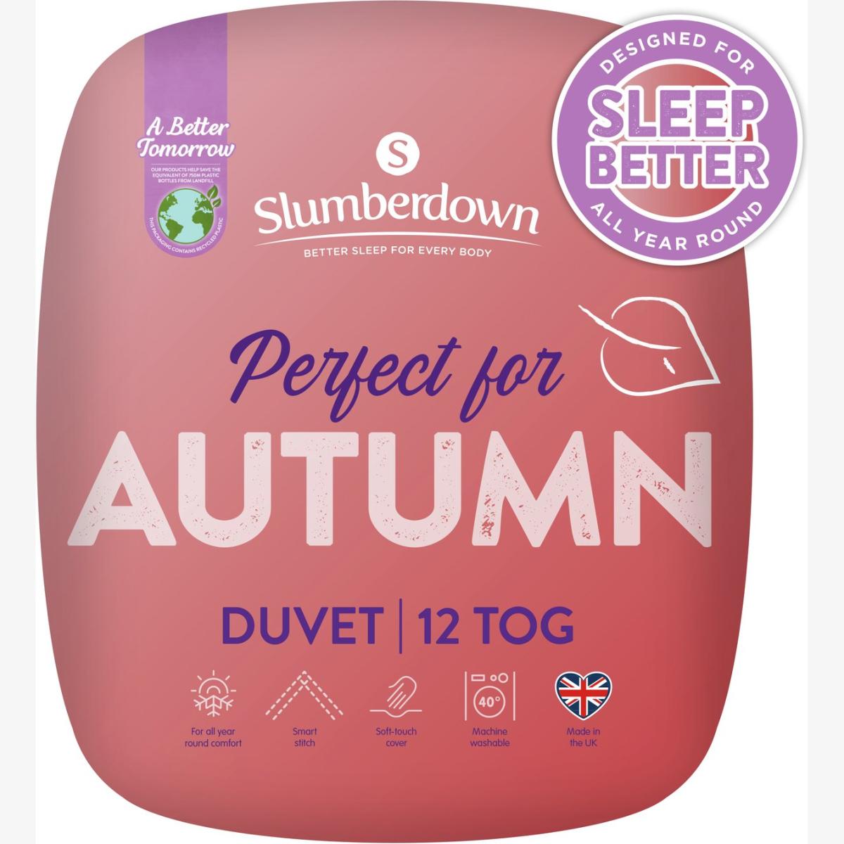 At Slumberdown, we believe every body deserves a better night sleep. The Slumberdown Autumn 12 Tog Duvet is a medium weight duvet ideal for those Autumnal nights or for those that like to be warmer in bed all year round. This product has our unique smart stitch finish which gives a square corner making it easier to make your bed. What's more, the product is Easy Care which means its machine washable and can be tumble dried. Double duvet. 12 tog duvet. Cover made from 100% polyester. Filling made from 100% recycled polyester. Size L200, W200cm. Machine washable. Suitable for washing in a standard size washing machine. Suitable for tumble drying. Non-allergenic. Manufacturer's 1 year guarantee.