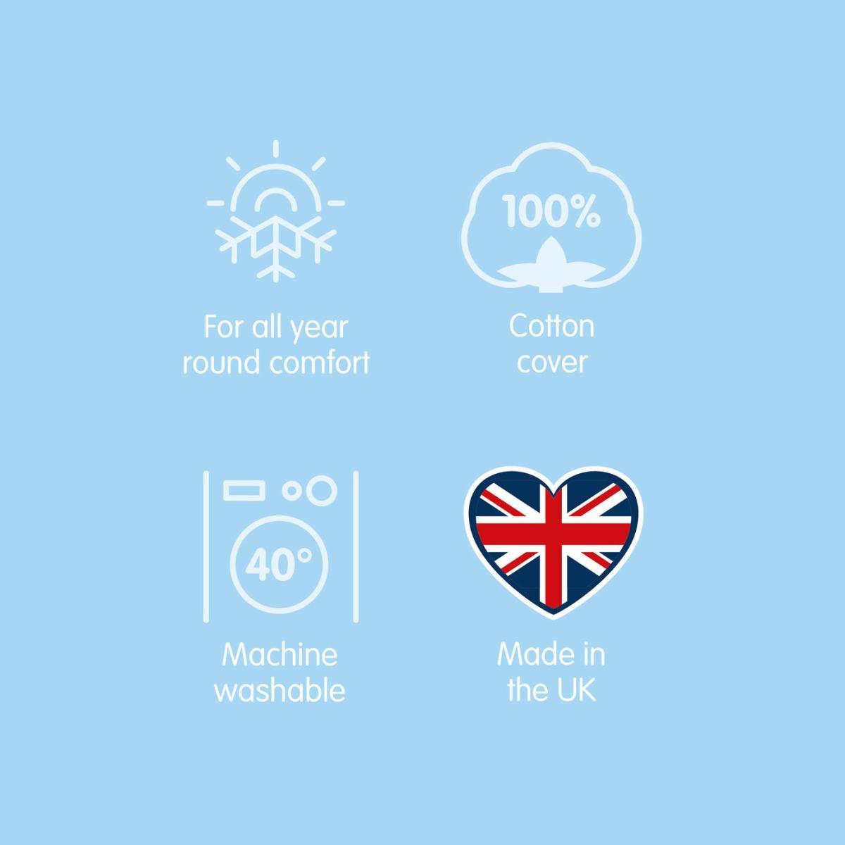 At Slumberdown, we believe every body deserves a better night sleep. The Slumberdown Cotton Comfort 10.5 Tog Duvet duvet is ideal for all round use. The cool soft touch cotton cover and lightweight fibre making it perfect for anytime of the year. What's more, the product is Easy Care which means its machine washable and can be tumble dried.