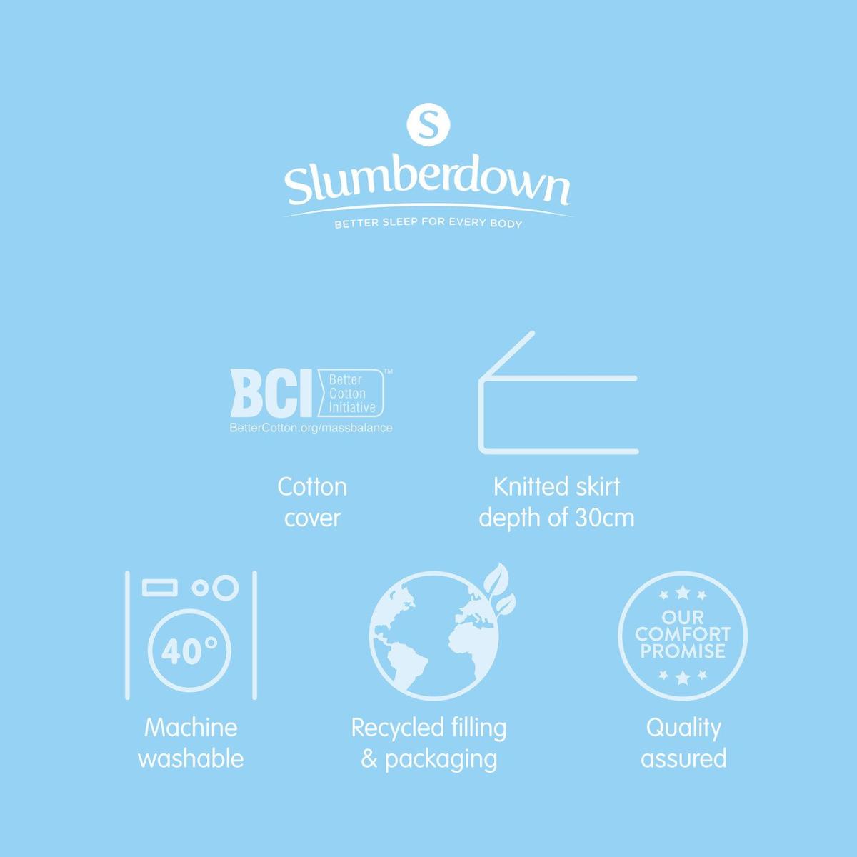 At Slumberdown we believe everybody deserves a better night's sleep. The Slumberdown Cotton Comfort mattress protector has been designed to provide extra protection for your mattress. The soft touch cotton cover protects your mattress from sweat and stains extending the life of your mattress. This quilted mattress protector fits to your bed with a knitted skirt suitable for a mattress depth up to 30cm. What's more its easy care which means its machine washable. Suitable for king size beds. Non-allergenic. 100% BCI Cotton cover. 100% Polyester filling. Secured by elasticated skirt. Size L200, W150cm. Machine washable. Line dry.