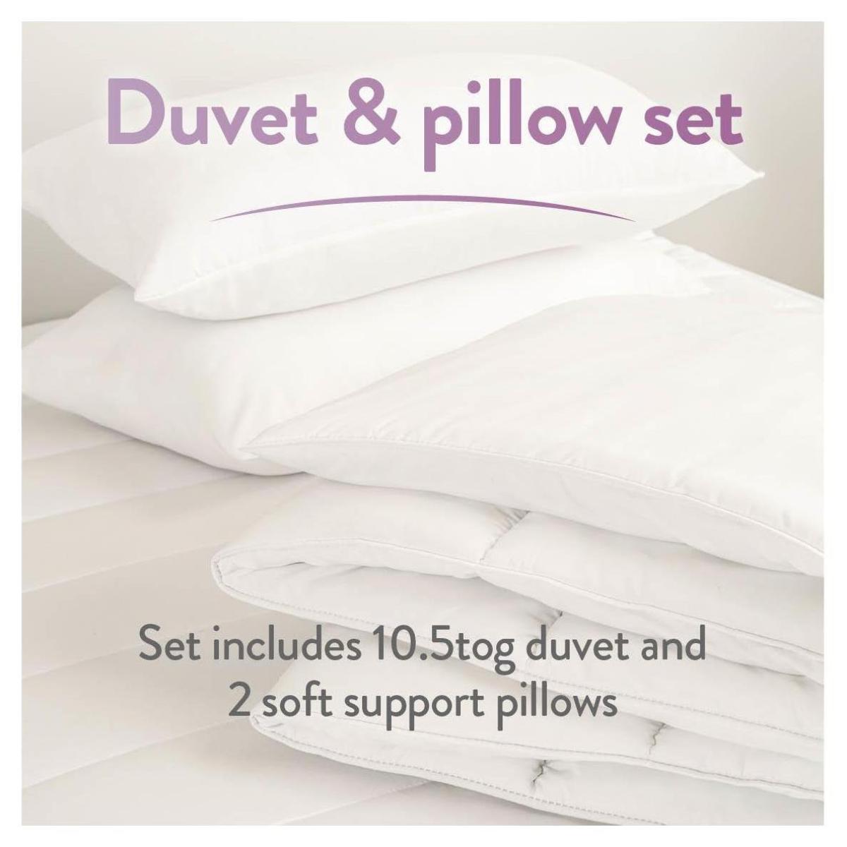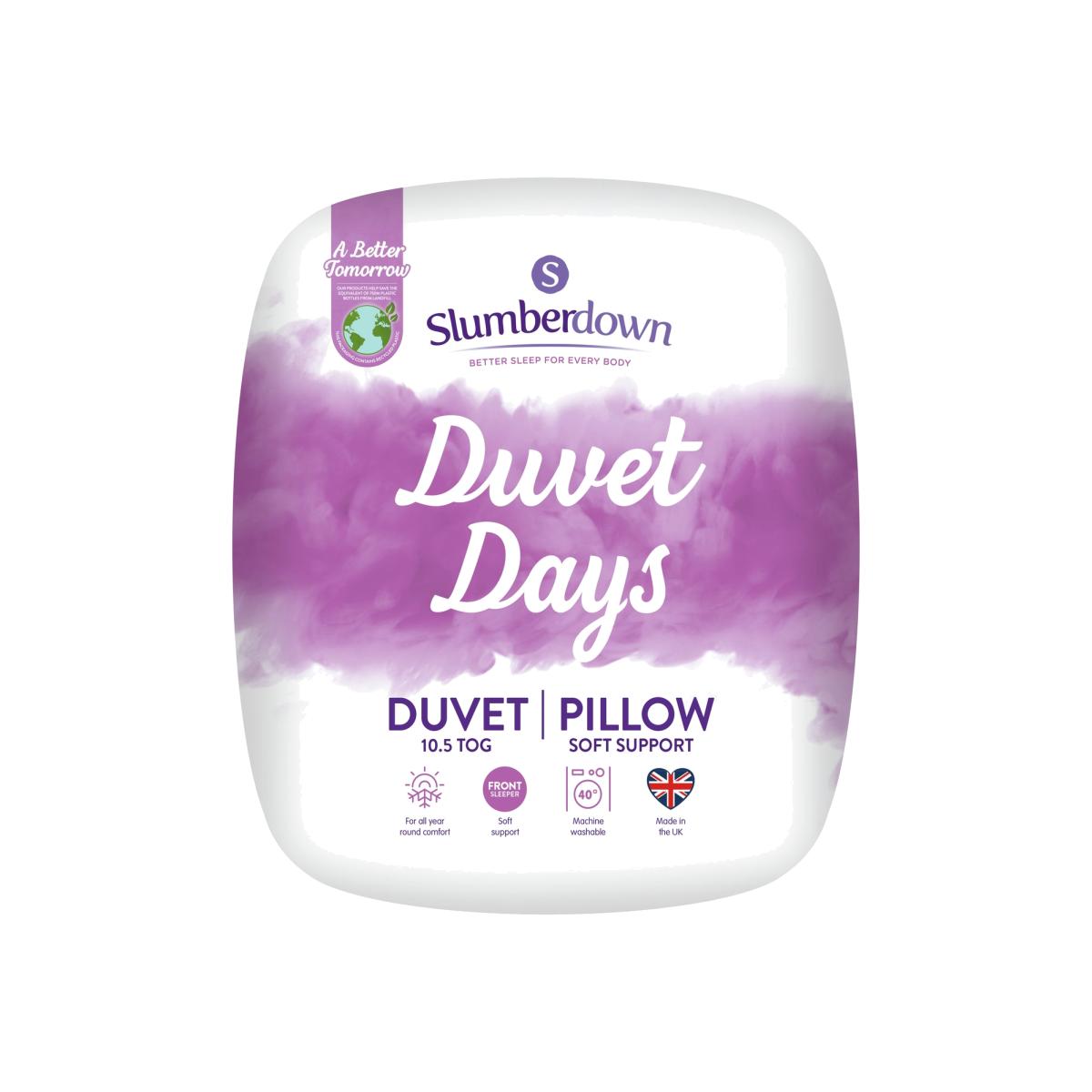 The Slumberdown Duvet Days Bedset comprises of a 10.5 Tog duvet and 2 x Medium support pillow (74x48cm). The soft touch covers and lovely recycled soft fibres are designed to provide the optimum level of warmth and support. The duvet is perfect for all year round use and the pillow is ideal for Back Sleepers, as it ensures your neck and head are supported so that you have a great nights sleep. What's more this product is Easy Care so can be machine washed and tumble dried. Made in the UK. Bedset consists of Duvet + Pillow(s), Filling 100% Recycled Polyester, Soft Touch Cover, Perfect for all year round use. Double duvet. 10.5 tog duvet. Cover made from 100% polyester. Filling made from 100% recycled polyester. Size L200, W200cm. Machine washable. Suitable for washing in a standard size washing machine. Suitable for tumble drying. Non-allergenic.