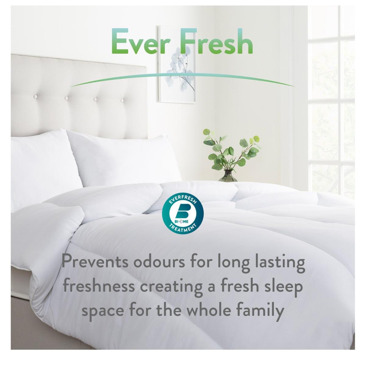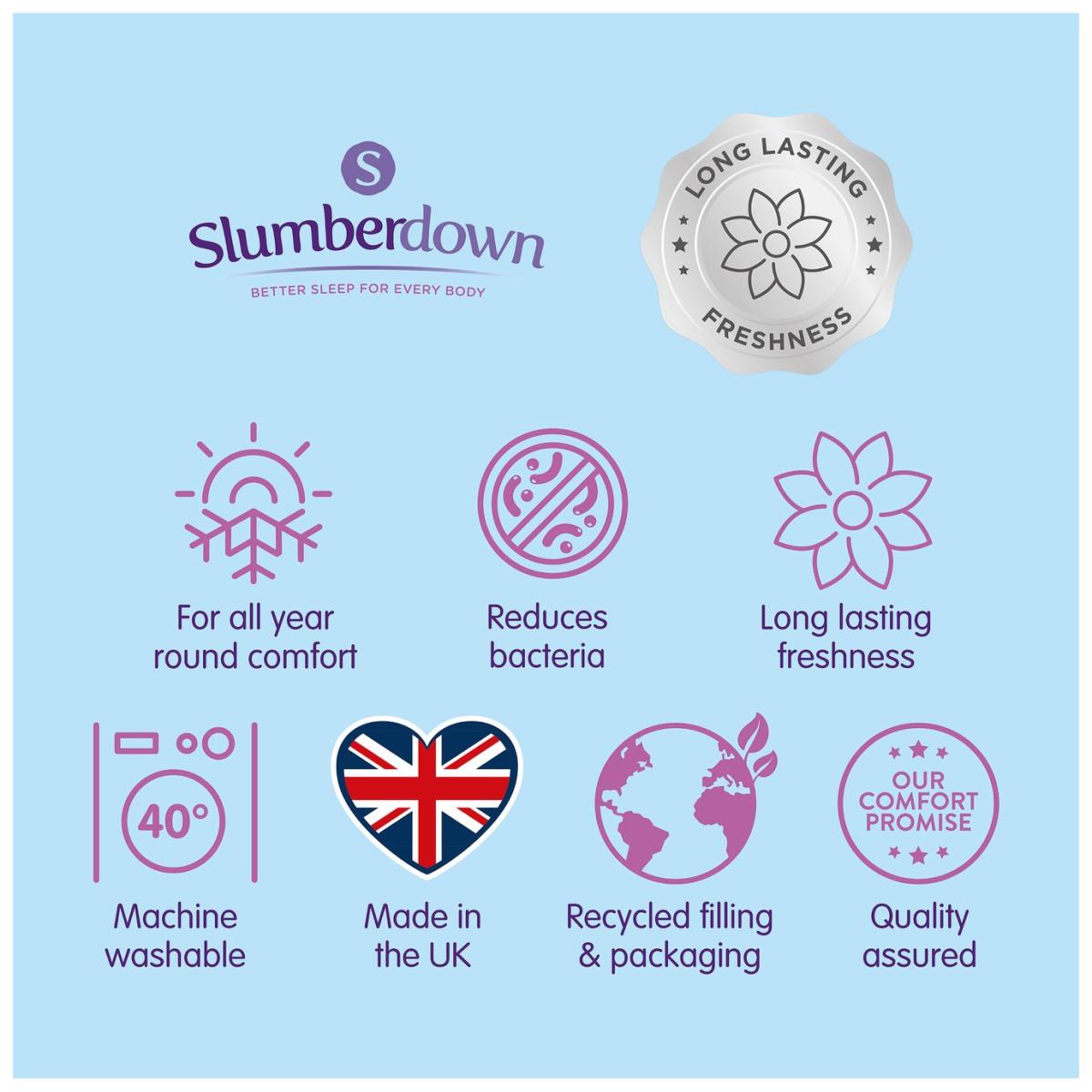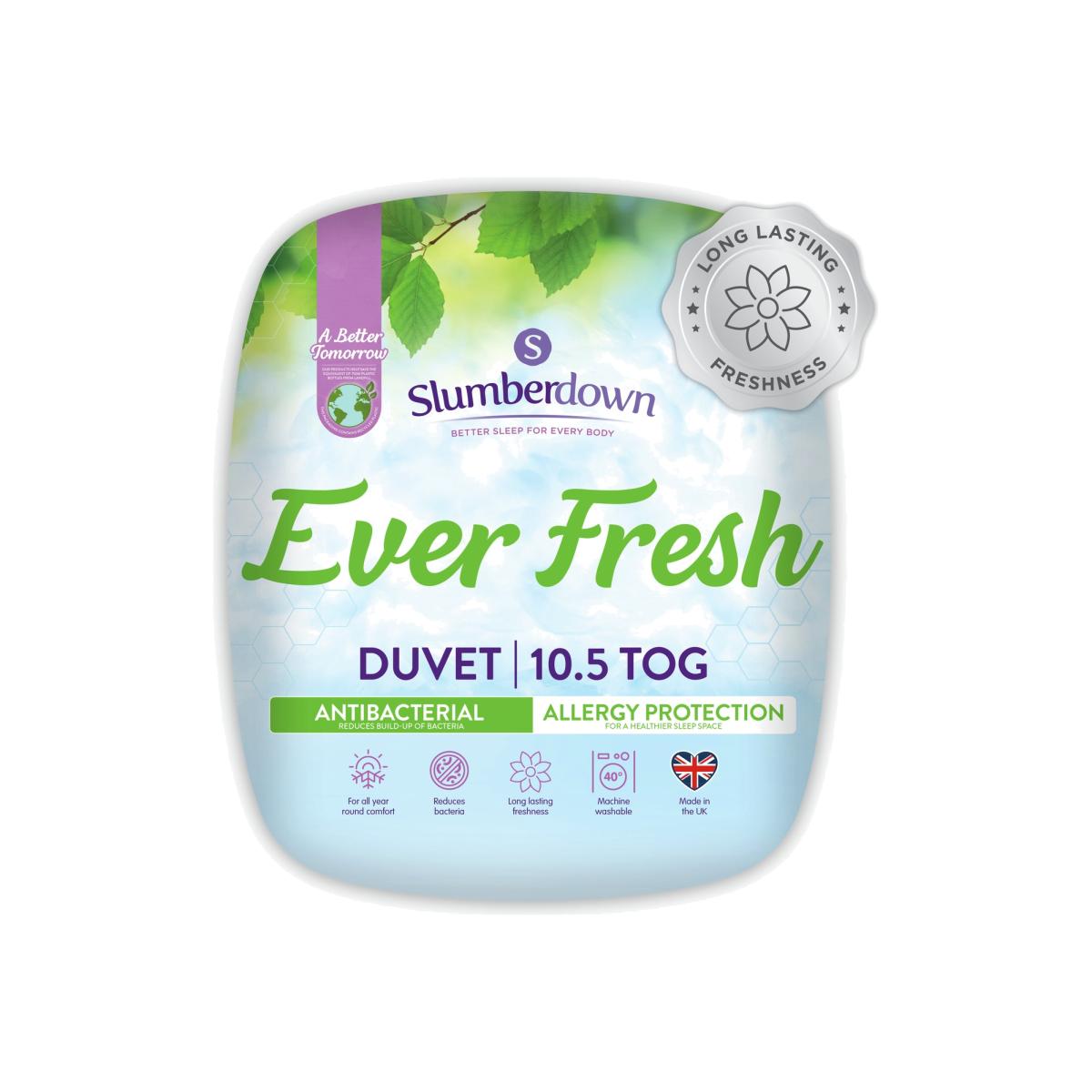 At Slumberdown, we believe everybody deserves a better night sleep. The Slumberdown Ever-Fresh 10.5 Tog Duvet range has been created especially for all year round use. Soft touch cover is designed to provide protection against the build-up & cross contamination of harmful, odour causing bacteria & allergens, so you can have a fresh & healthy sleep space. The light & lofty recycled fibre provide optimum level of warmth, ensuring you have a Good Night's Sleep. What's more the product is Easy Care which means it's machine washable. King size duvet. 10.5 tog duvet. Cover made from 100% polyester. Filling made from 100% recycled polyester. Size L220, W225cm. Machine washable. Suitable for washing in a standard size washing machine. Suitable for tumble drying. Non-allergenic.
