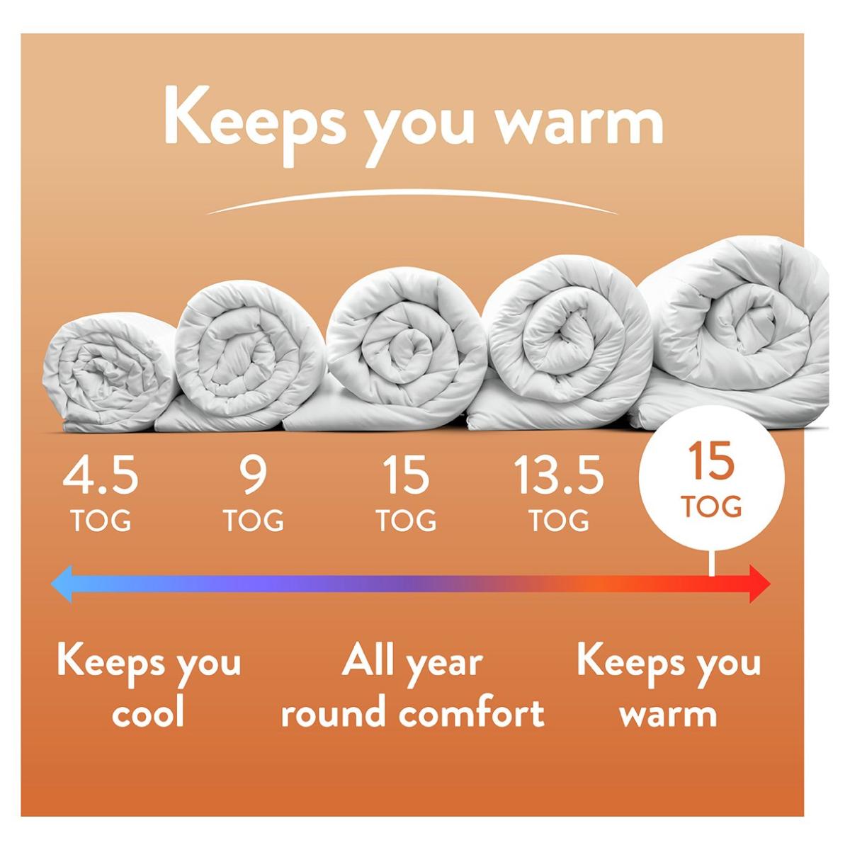 At Slumberdown, we believe every body deserves a better night sleep. The Slumberdown Extra Warm 15 Tog duvet is ideal for those cold nights or for those that like to be extra warm in bed. What's more, the product is Easy Care which means its machine washable and can be tumble dried. 100% polyester cover. 100% hollowfibre filling. Machine washable at 40 degrees. Suitable for tumble drying. Tog rating 15. King size duvet. 15 tog duvet. Cover made from 100% polyester. Filling made from 100% polyester. Size L220, W225cm. Machine washable at 40 C. Suitable for washing in a standard size washing machine. Suitable for tumble drying. Manufacturer's 1 year guarantee.