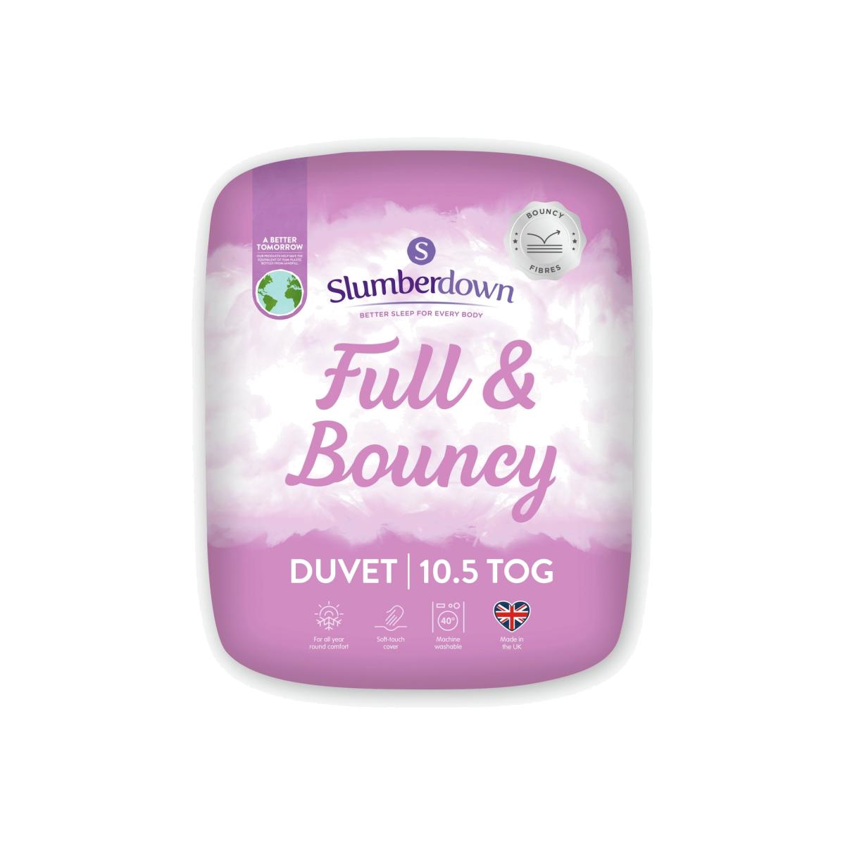 The Slumberdown Full and Bouncy 10.5 Tog Duvet has a super soft cover and is filled with bouncy fibre which allows it to bounce back each night, making it look as plump as the day you bought it. The Full and Bouncy duvet is 10.5 Tog which means its perfect for all year round use. Whats more the duvet is Easy Care meaning it can be machine washed and tumble dried. King size duvet. 10.5 tog duvet. Cover made from 100% polyester. Filling made from 100% polyester. Size L230, W220cm. 2.65kg. Machine washable. Suitable for washing in a standard size washing machine. Suitable for tumble drying. Non-allergenic.