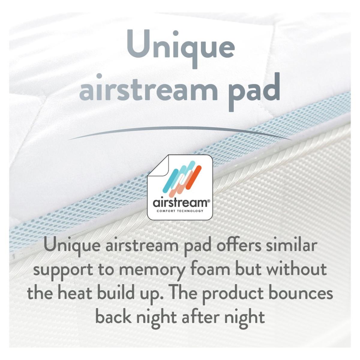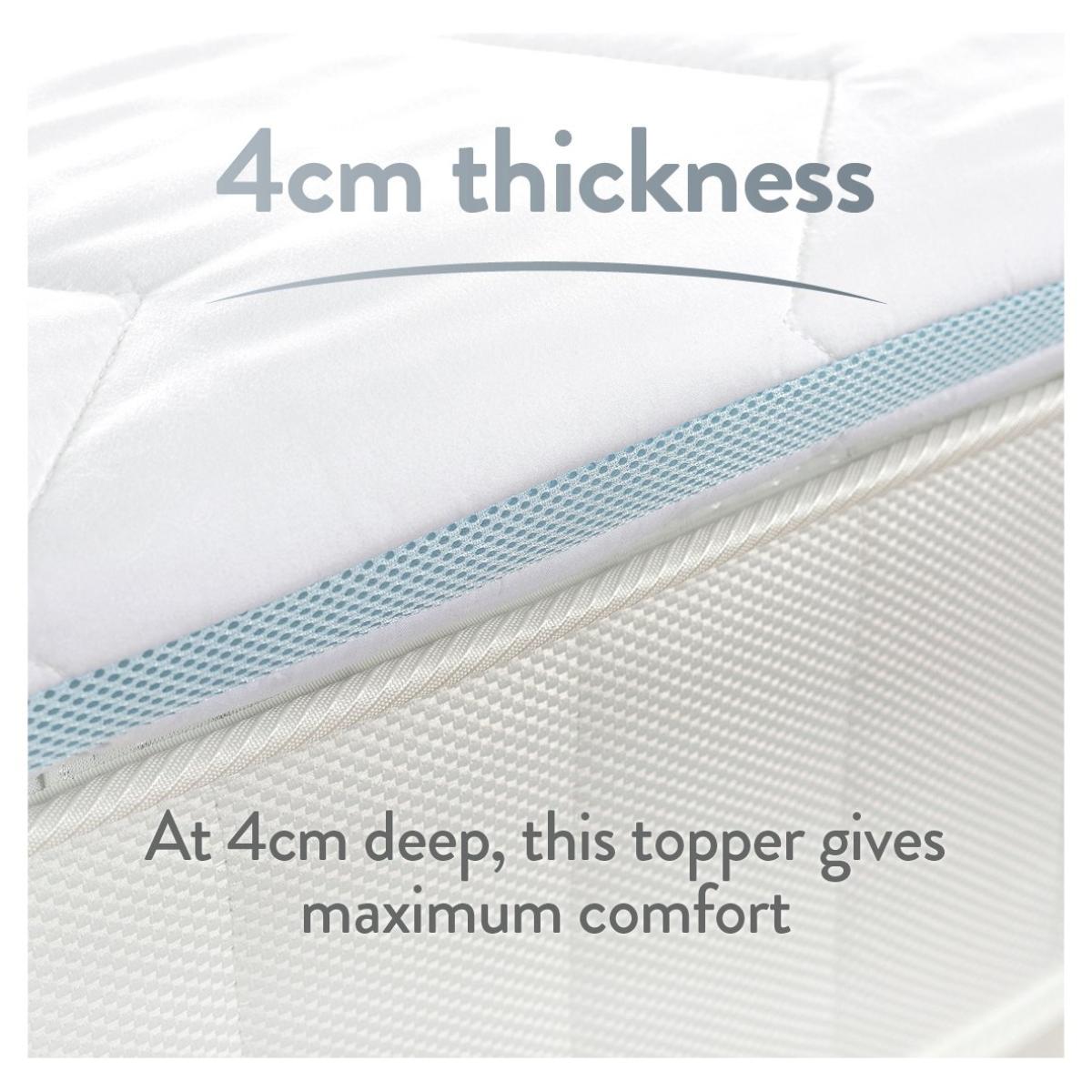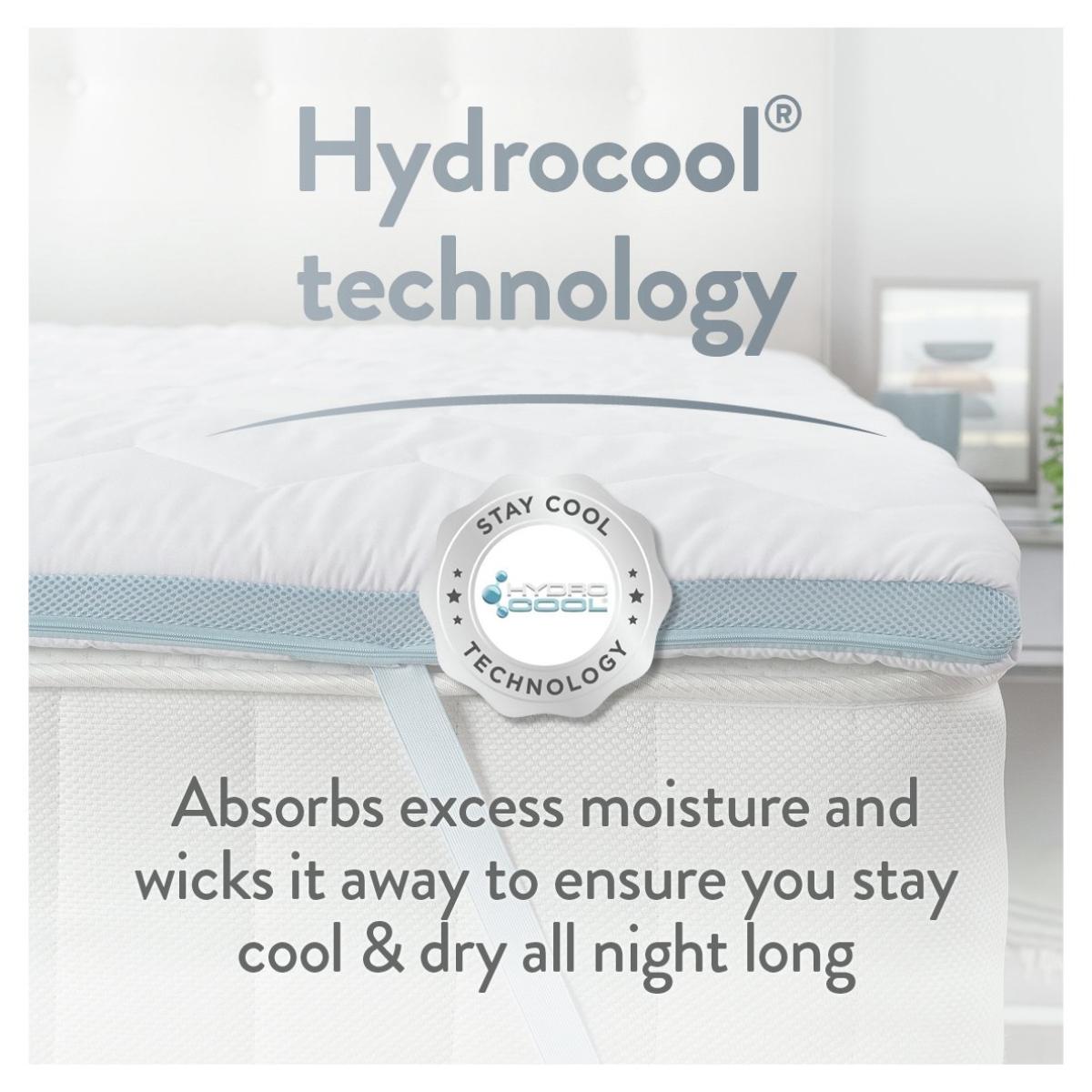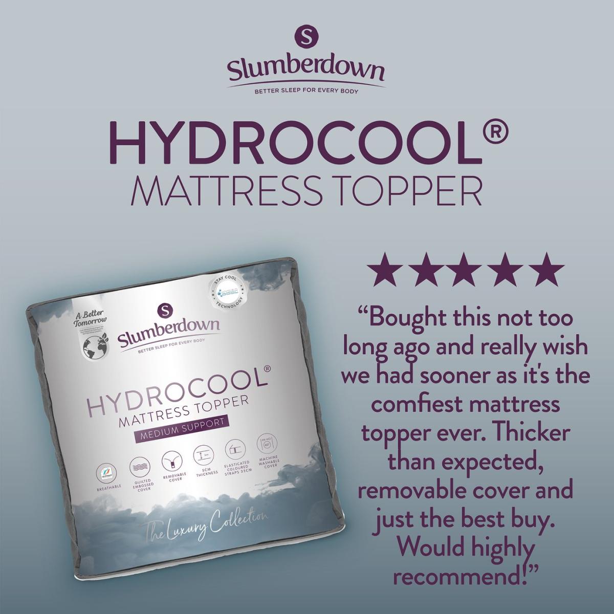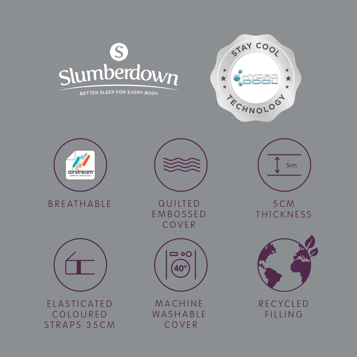 The Slumberdown Hydro Cool Topper has a soft touch quilted cover which features the intelligent Hydra Cool technology. The moisture management technology works by absorbing moisture created by body heat, to create a dry, cool and comfortable sleeping environment. The Airstream medium support, breathable 4cm pad enhances the comfort of your mattress. The topper fits the mattress with re-enforced elasticated straps which will fit a mattress depth up to 35cm. What's more its easy care as the cover is removable and can be machine washed. Set includes: Hydro Cool Topper. Suitable for single beds. Size L190, W90, D5cm. Cover made from 100 Polyester. 100 Polyester reverse. 100 Polyester filling. Secured by elasticated corner straps. Non-allergenic. Cover is machine washable and suitable for tumble drying.