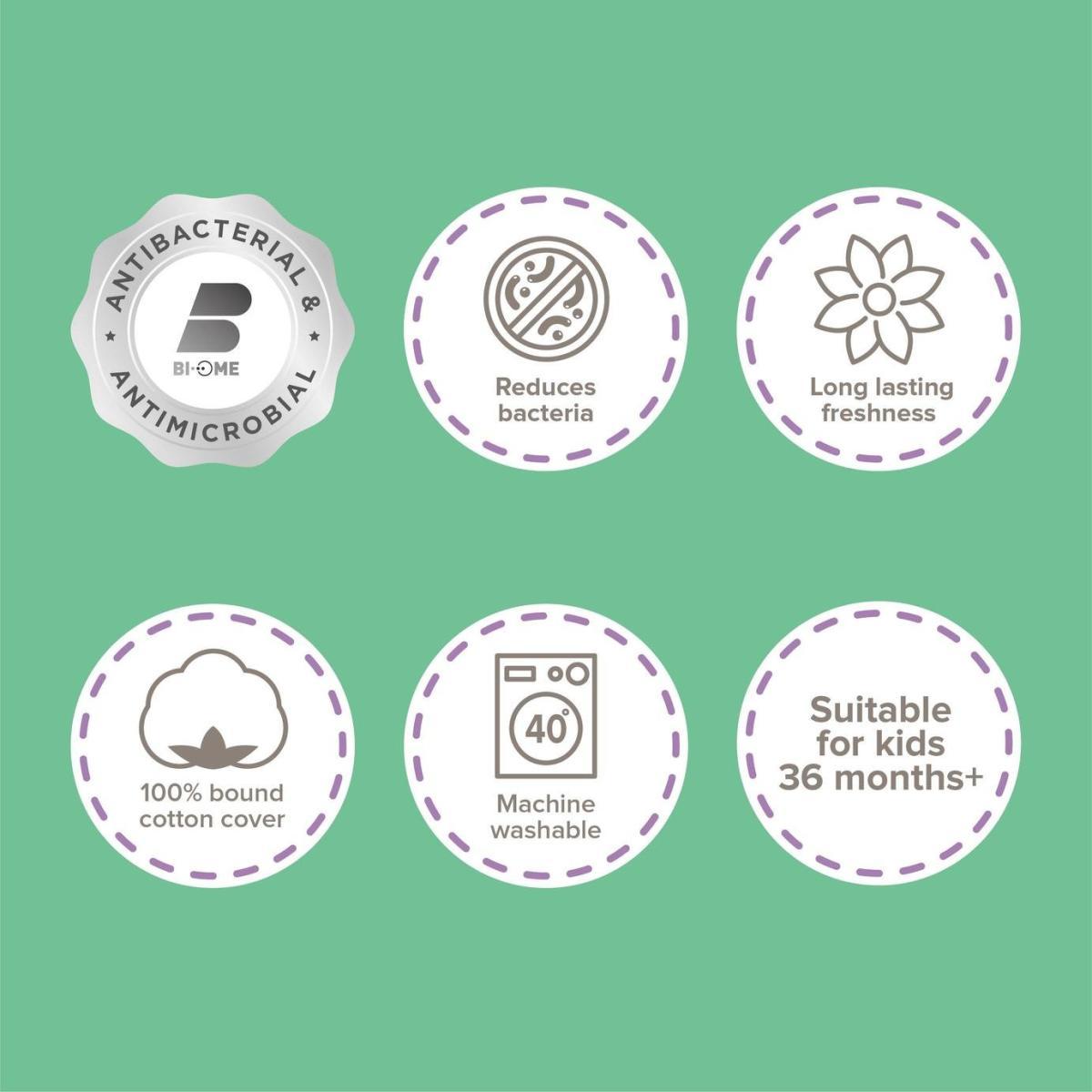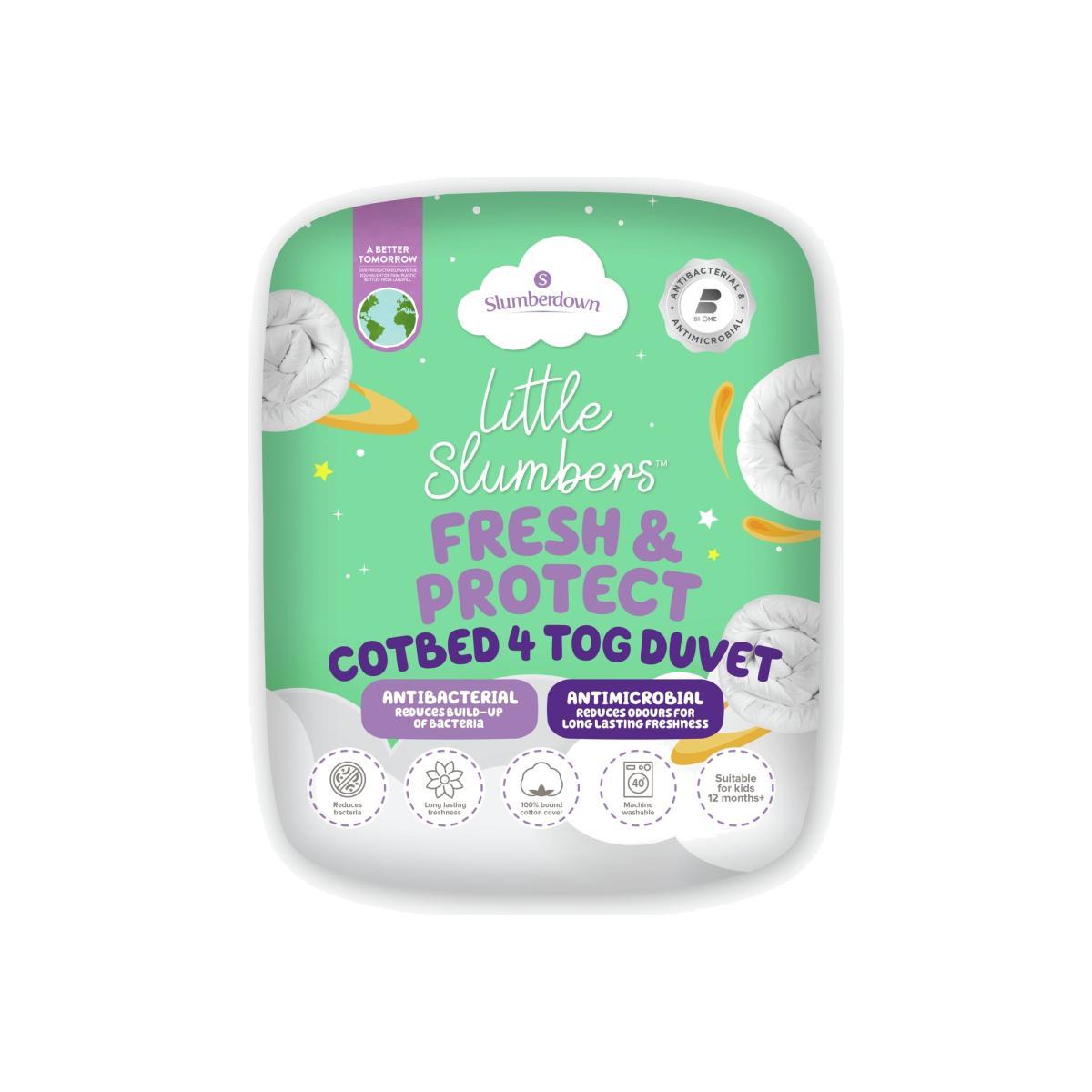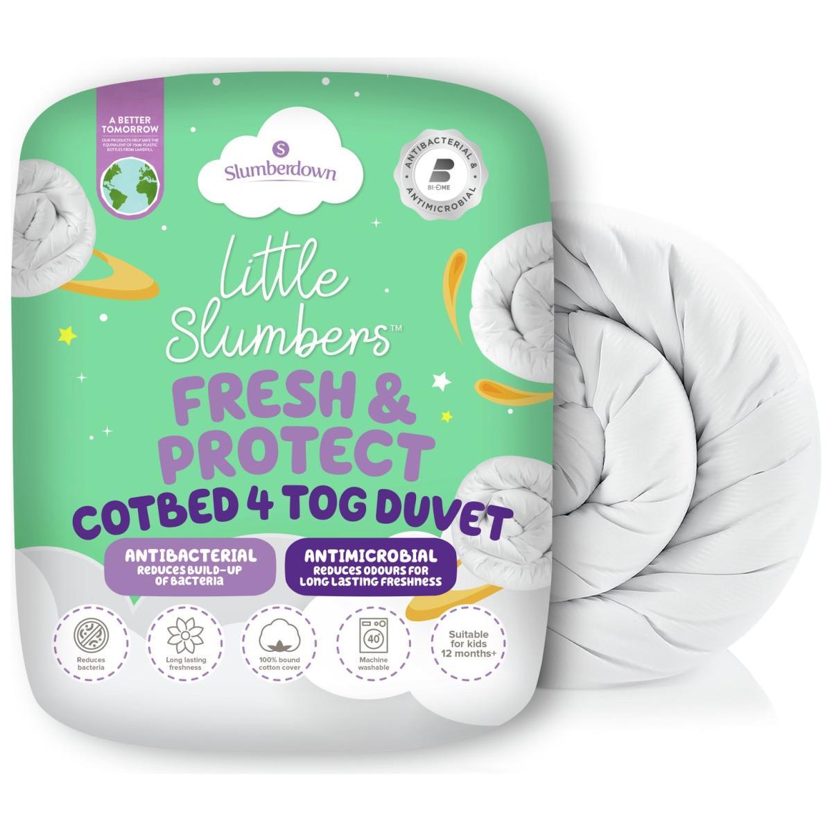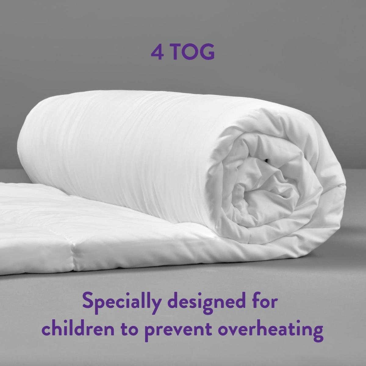The Slumberdown Little Slumbers Anti Bacterial Cotton duvet has been designed for children. It is carefully formulated with a permanent, antibacterial, antimicrobial, non-harmful odour control treatment, BI-OME® which protects textiles from the build-up of dustmites and odour causing bacteria. The reduced fill ensures your little one won't overheat at night. Independently tested by experts, so your little ones can enjoy a comfier, fresher and healthier sleep space. What's more this is Easy Care so can be machine washed and tumble dried. Toddler duvet. 4 tog duvet. Cover made from 100% cotton percale. Filling made from 100% polyester. Size L120, W150cm. Machine washable. Suitable for washing in a standard size washing machine. Anti-allergy. Manufacturer's 1 year guarantee.