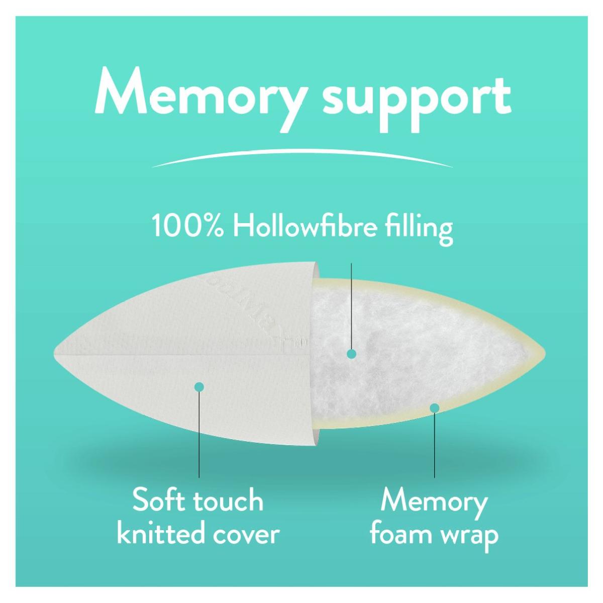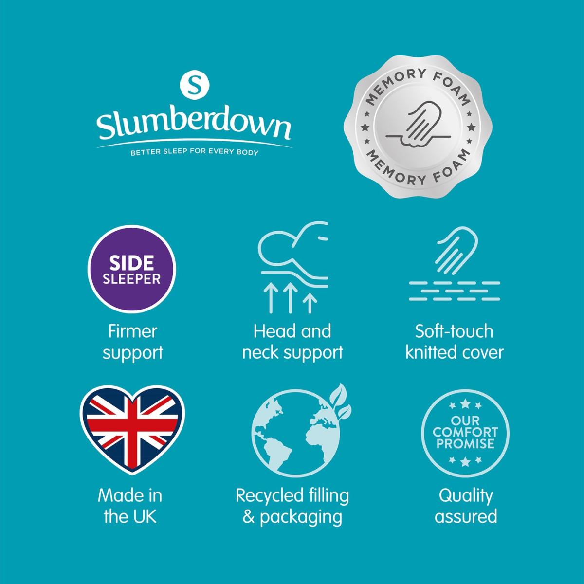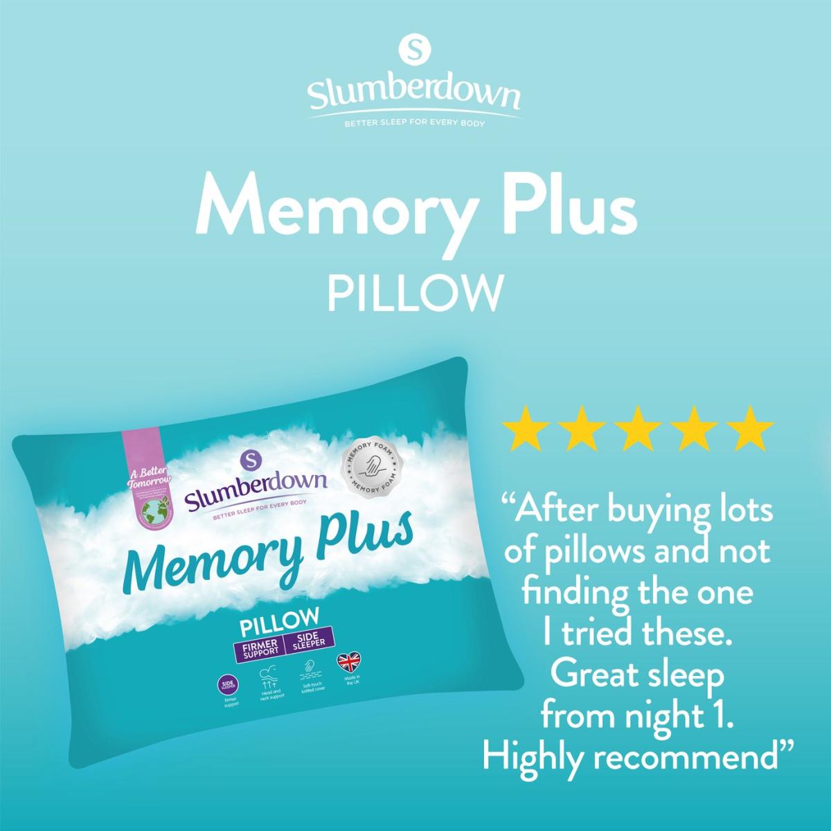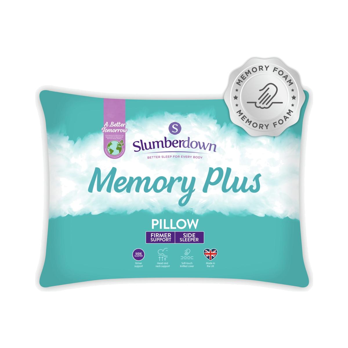 New for 2019, the Slumberdown Memory Plus Pillow offers maximum support for your head and neck. The soft touch quilted cover has a unique memory foam wrap that gently moulds around your head and neck which relieves pressure and helps minimise any neck or back pain. Provides firm support. Perfect for those that sleep on their sides or backs. Memory foam wrap provides additional support to hold the head and neck in place. Wipe clean only. Not suitable for tumble drying. Made in the UK. Pack quantity: 1. Cover made from 100% polyester. Filling made from 100% memory foam. Memory foam. Firm pillow. Suitable for back sleepers. Wipe clean. Line dry only. Non-allergenic.