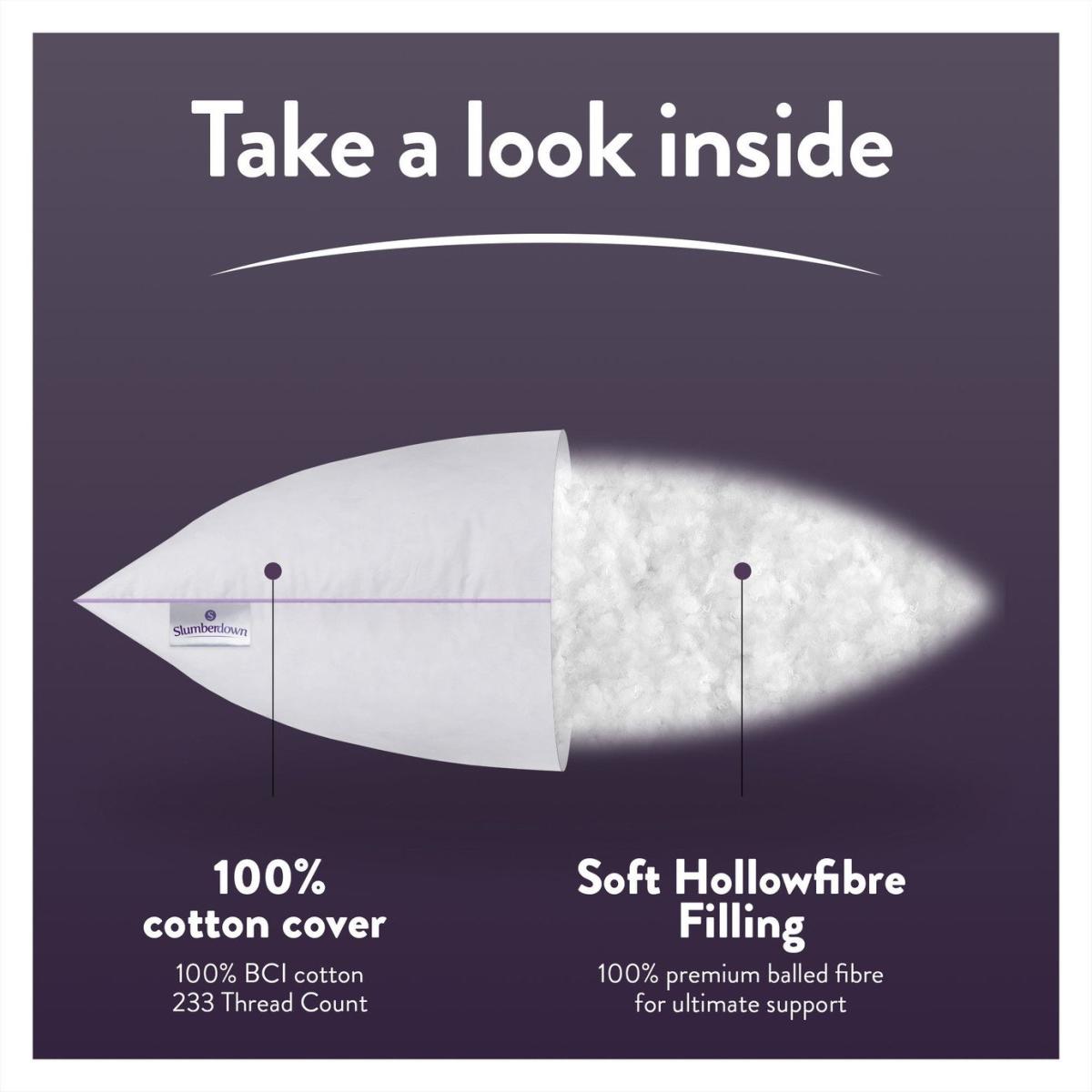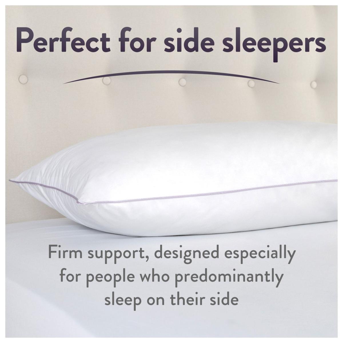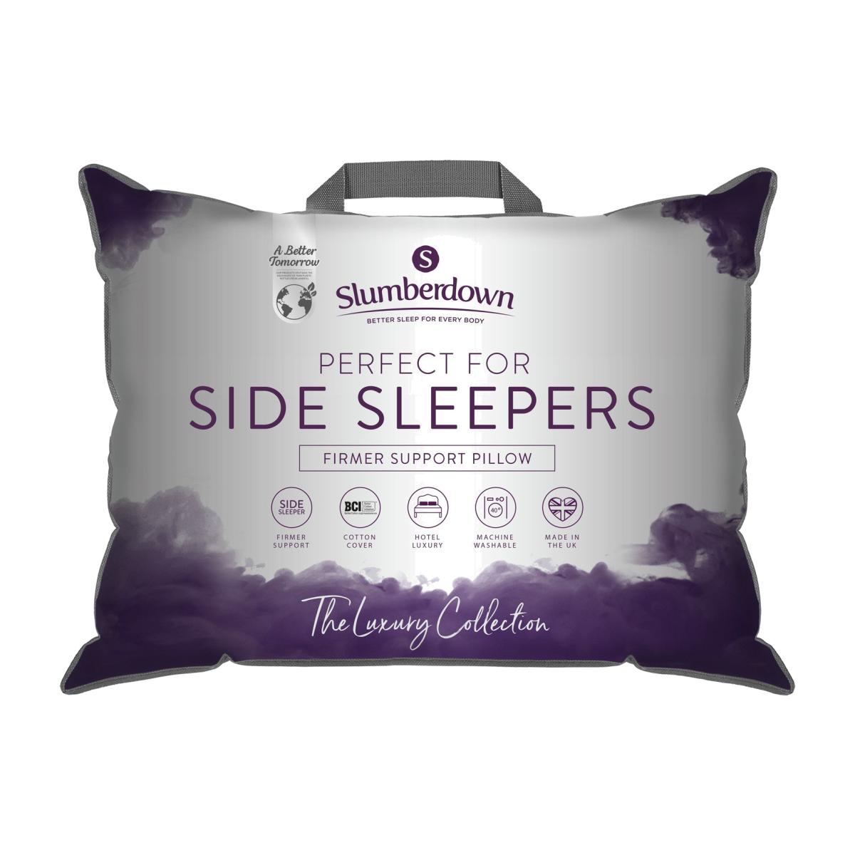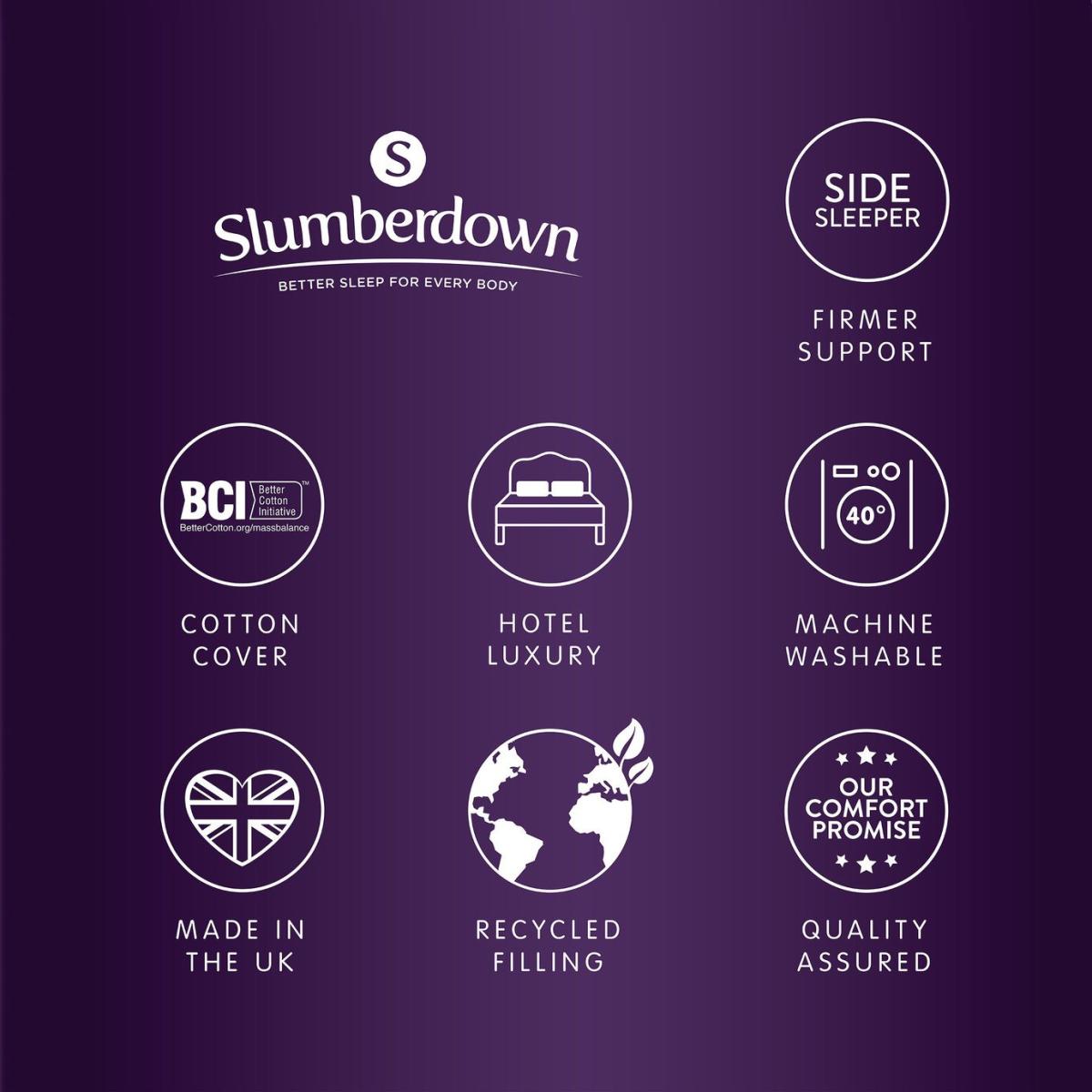 At Slumberdown, we believe everybody deserves a better night's sleep. The Slumberdown Perfect for Side Sleepers Pillow has been designed to ensure you get the right level of support for the way you sleep. This pillow offers firmer support and has an increased fill perfect for those that sleep on their side. The 100% cotton 233 thread count cover has a delicate piped edge and is filled with lovely soft fibres to ensure your head/neck is fully supported. Pack quantity: 1. Cover made from 100% cotton percale. Filling made from 100% polyester. Firm pillow. Suitable for side sleepers. Size L74, W48cm. Machine washable. Non-allergenic.