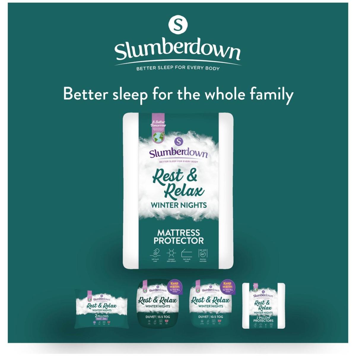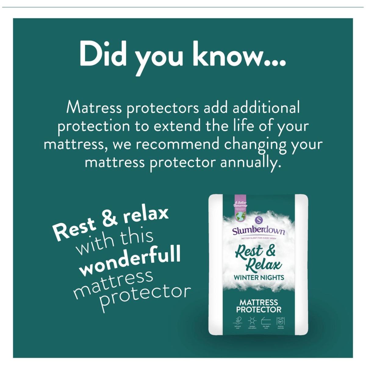 At Slumberdown we believe everybody deserves a better night's sleep. The Slumberdown Rest & Relax mattress protector has been designed for all the family to provide extra protection for your mattress. The soft touch cotton cover protects your mattress from sweat and stains extending the life of your mattress. This quilted mattress protector fits to your bed with a knitted skirt suitable for a mattress depth up to 30cm. What's more its easy care which means its machine washable. Suitable for double beds. Non-allergenic. 100% Polyester cover. 100% Recycled Polyester filling. Secured by elasticated skirt. Size L200, W200cm. Machine washable. Line dry.