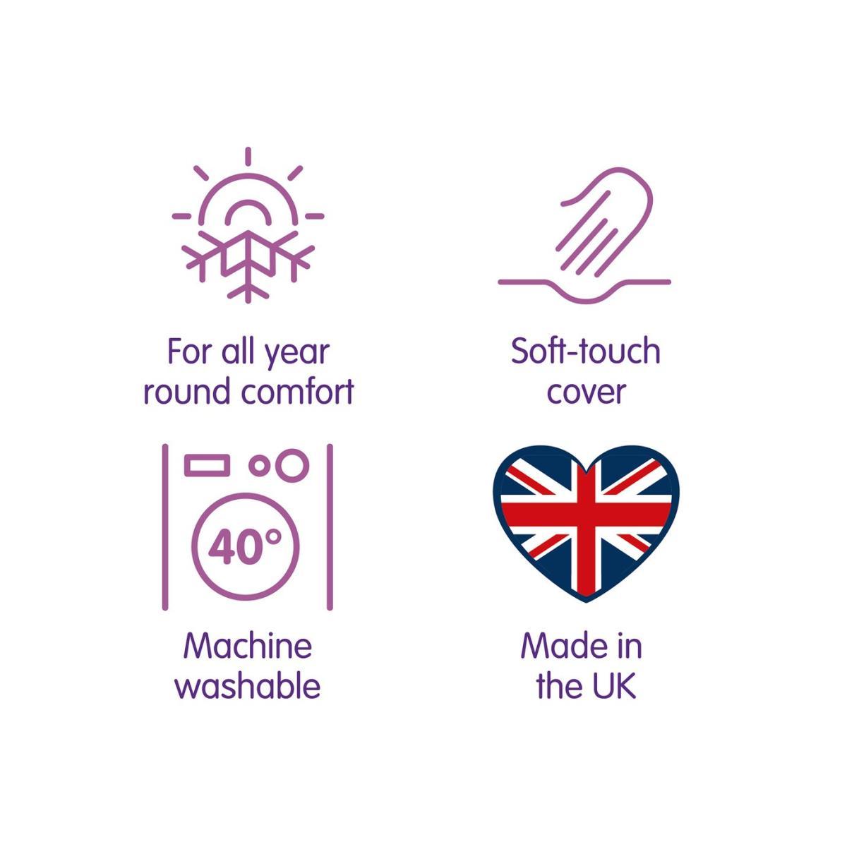 At Slumberdown, we believe every body deserves a better night sleep. The Slumberdown Soft and Huggable range has been created especially for everyday use. The soft touch cover is wonderfully huggable ensuring you stay perfectly cosy all night. What's more, the product is Easy Care which means its machine washable and can be tumble dried. Light lofty soft touch 10.5 Tog. Easy Care. Single duvet. 10.5 tog duvet. Cover made from 100% polyester. Filling made from 100% polyester. Size L90, W190cm. Machine washable. Suitable for washing in a standard size washing machine. Suitable for tumble drying. Non-allergenic.