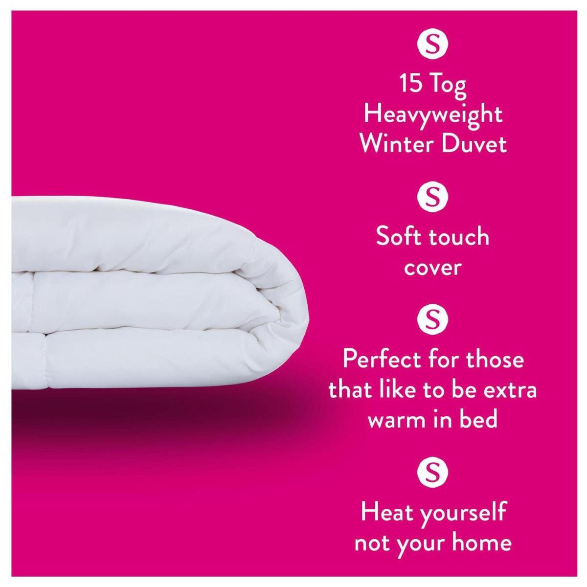 At Slumberdown, we believe every body deserves a better night sleep. The Slumberdown Soft and Huggable range has been created especially for everyday use. This 15 Tog Duvet is perfect for winter nights and is designed for those that like to be super toasty in bed. The soft touch cover is wonderfully huggable ensuring you stay perfectly cosy all night. What's more, the product is Easy Care which means its machine washable and can be tumble dried. King size duvet. 15 tog duvet. Cover made from 100% polyester. Filling made from 100% recycled polyester. Size L220, W230cm. Machine washable. Suitable for washing in a standard size washing machine. Suitable for tumble drying. Non-allergenic. Manufacturer's 1 year guarantee.