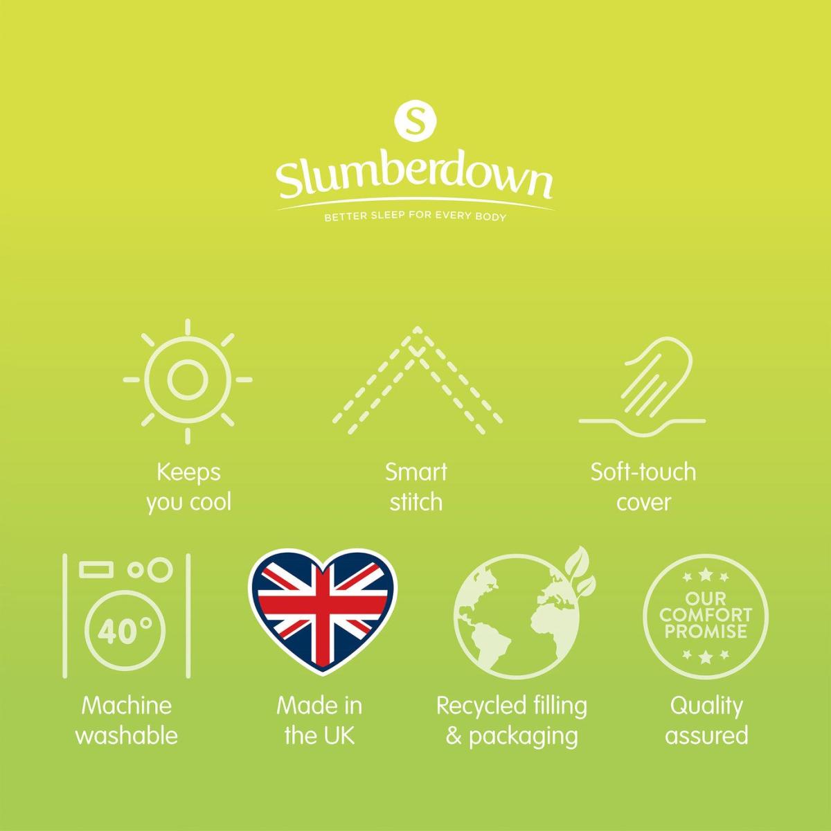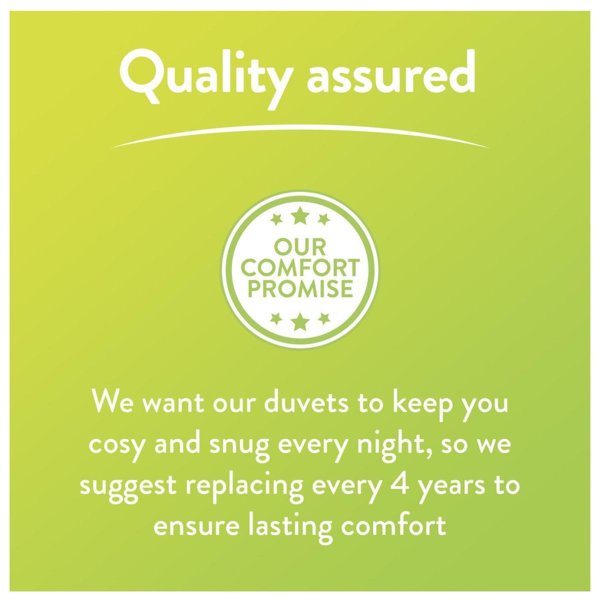 At Slumberdown, we believe everybody deserves a better night sleep. The Slumberdown Spring 7.5 Tog Duvet duvet is lightweight making it ideal for transitioning between the colder and warmer nights. The product has our unique smart stitch premium finish which gives a square corner making it easier to make your bed. What's more, the product is Easy Care which means its machine washable and can be tumble dried. Single duvet. 7.5 tog duvet. Cover made from 100% polyester. Filling made from 100% polyester. Size L200, W135cm. Machine washable. Suitable for washing in a standard size washing machine. Suitable for tumble drying. Non-allergenic.