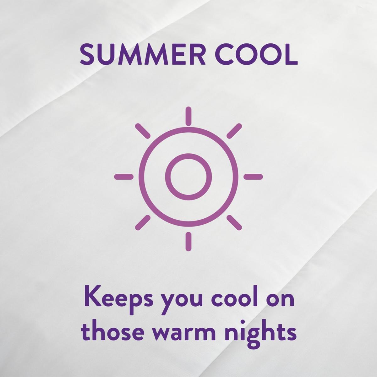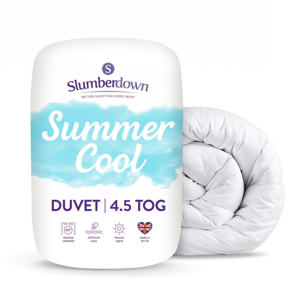 At Slumberdown, we believe every body deserves a better night sleep. The Slumberdown Summer Cool 4.5 Tog duvet is light and lofty making it ideal for Summer nights or for those that like to be cooler in bed. What's more, the product is Easy Care which means its machine washable and can be tumble dried. Supersoft cover Light and soft filling 4.5 tog - light weight duvet perfect for those warmer nights. Made in the UK. King size duvet. 4.5 tog duvet. Cover made from 100% polyester. Filling made from 100% polyester. Size L220, W225cm. Machine washable at 40 C. Suitable for washing in a standard size washing machine. Suitable for tumble drying. Non-allergenic.