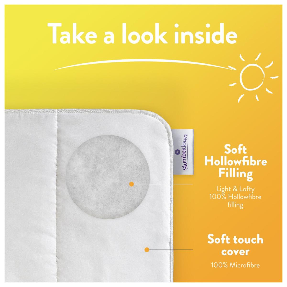At Slumberdown, we believe everybody deserves a better night sleep. The Slumberdown Summer 4.5 Tog Duvet duvet is lightweight making it ideal for Summer nights or for those that like to be cool in bed all year round. The product has our unique smart stitch premium finish which gives a square corner making it easier to make your bed. What's more, the product is Easy Care which means its machine washable and can be tumble dried. King size duvet. 4.5 tog duvet. Cover made from 100% polyester. Filling made from 100% polyester. Size L220, W225cm. Machine washable. Suitable for washing in a standard size washing machine. Suitable for tumble drying. Non-allergenic.