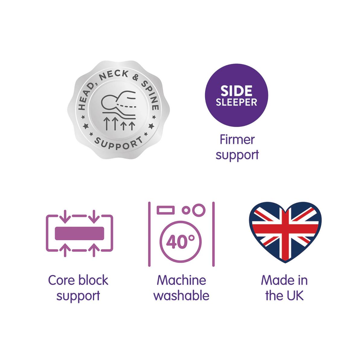 Designed with a firm core block that supports the head and straightens the spine, this Slumberdown Super Support Pillow Pair has a 100% recycled polyester filling, relieves pressure, helps to reduce neck ache, and is ideal for those that sleep on their side. These easy-care, sustainable pillows are machine washable and tumble dryer safe for long-lasting comfort and freshness.