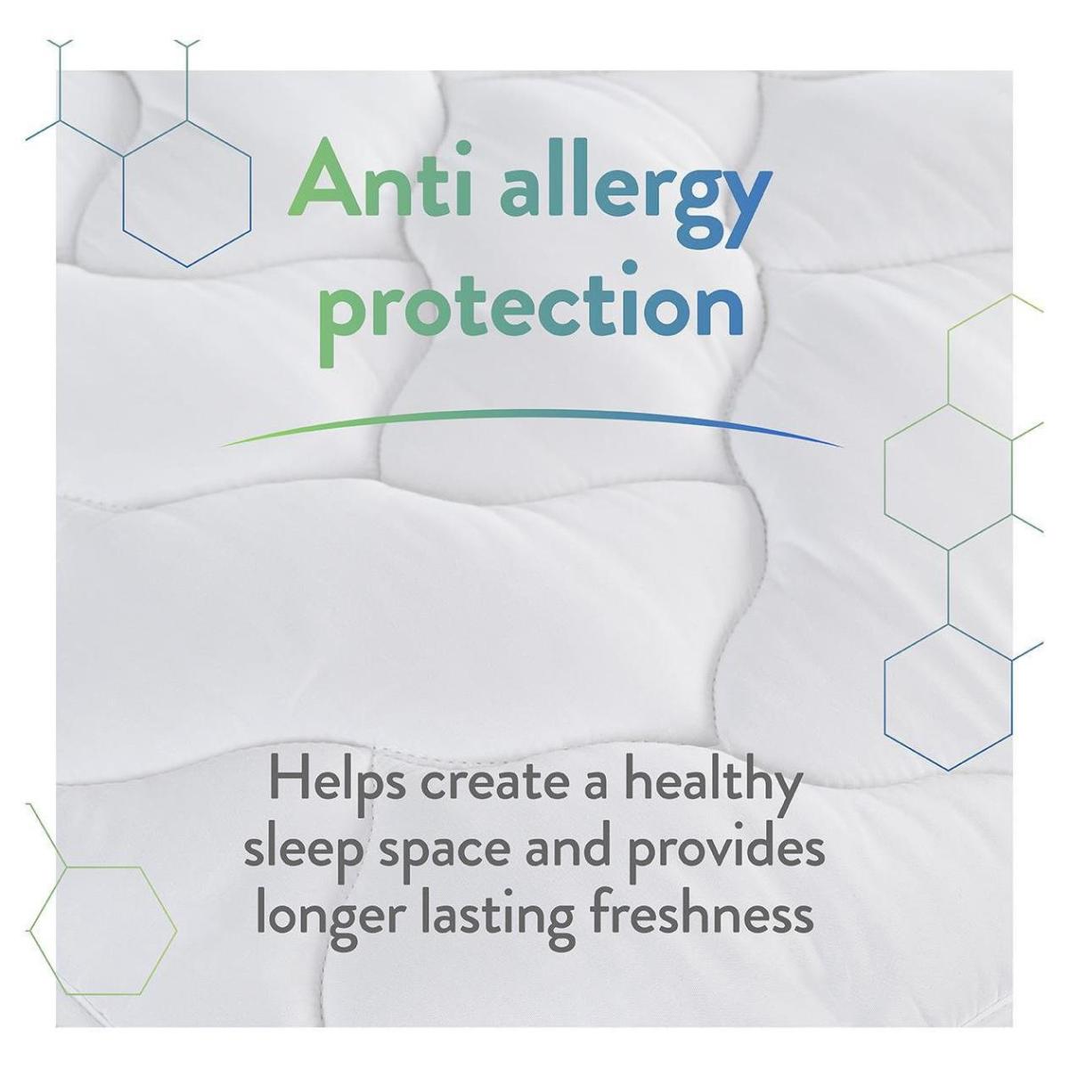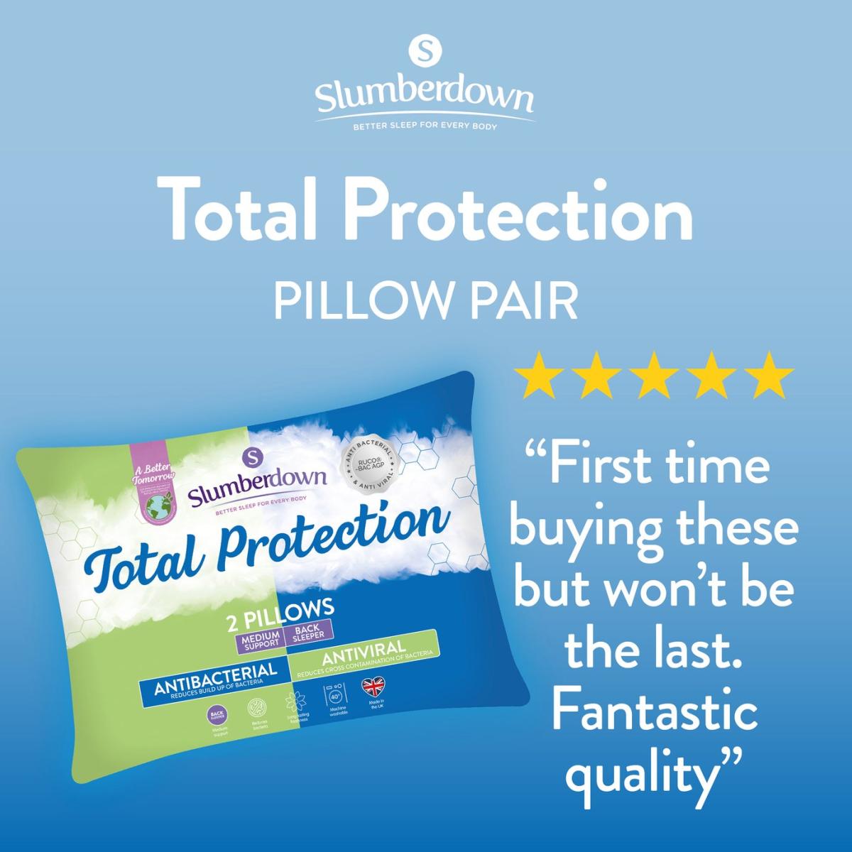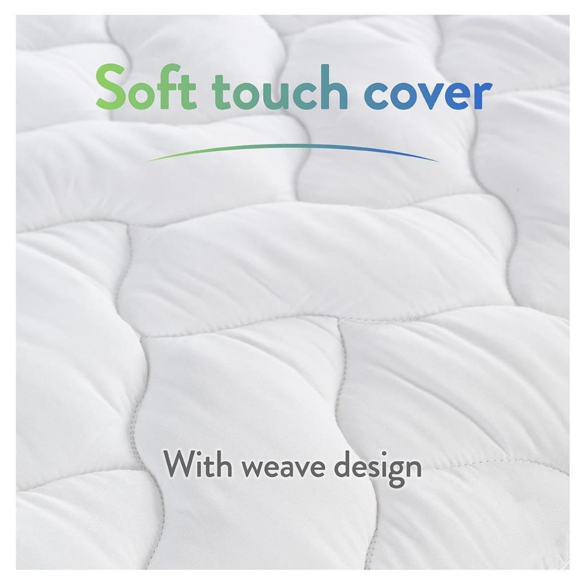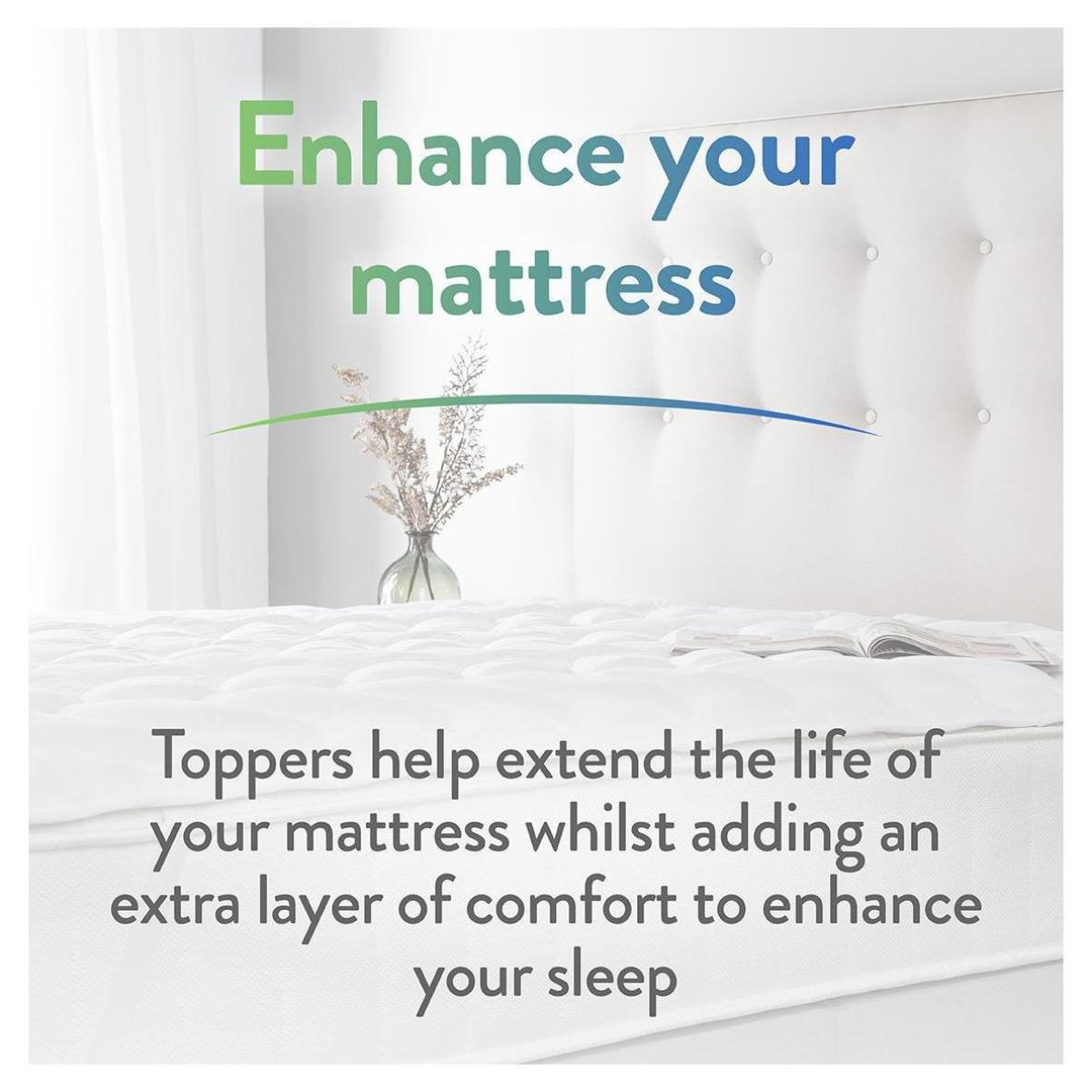 At Slumberdown we believe everybody deserves a better night's sleep. The Slumberdown Total Protection Topper offers total protection for you and your family. The soft touch cover with fast acting anti allergy, anti viral, anti bacterial treatment not only protects your mattress from sweat and stains, but gives added protection against dust-mites, odours, bacteria and viral infections, ensuring your mattress stays protected night after night, extending the life of your mattress, whilst adding additional comfort. This quilted topper is 2.5cm deep and fits to your bed using reinforced elasticated straps which fits a mattress depth up to 30cm. What's more our products are Easy Care which means they can be machine washed to ensure a clean and fresh sleep space. Suitable for double beds. Size L190, W135, D2.5cm. Cover made from 100% Polyester. 100% Polyester reverse. 100% Recycled Polyester filling. Fitted. Secured by elasticated corner straps. Non-allergenic. Cover is machine washable.