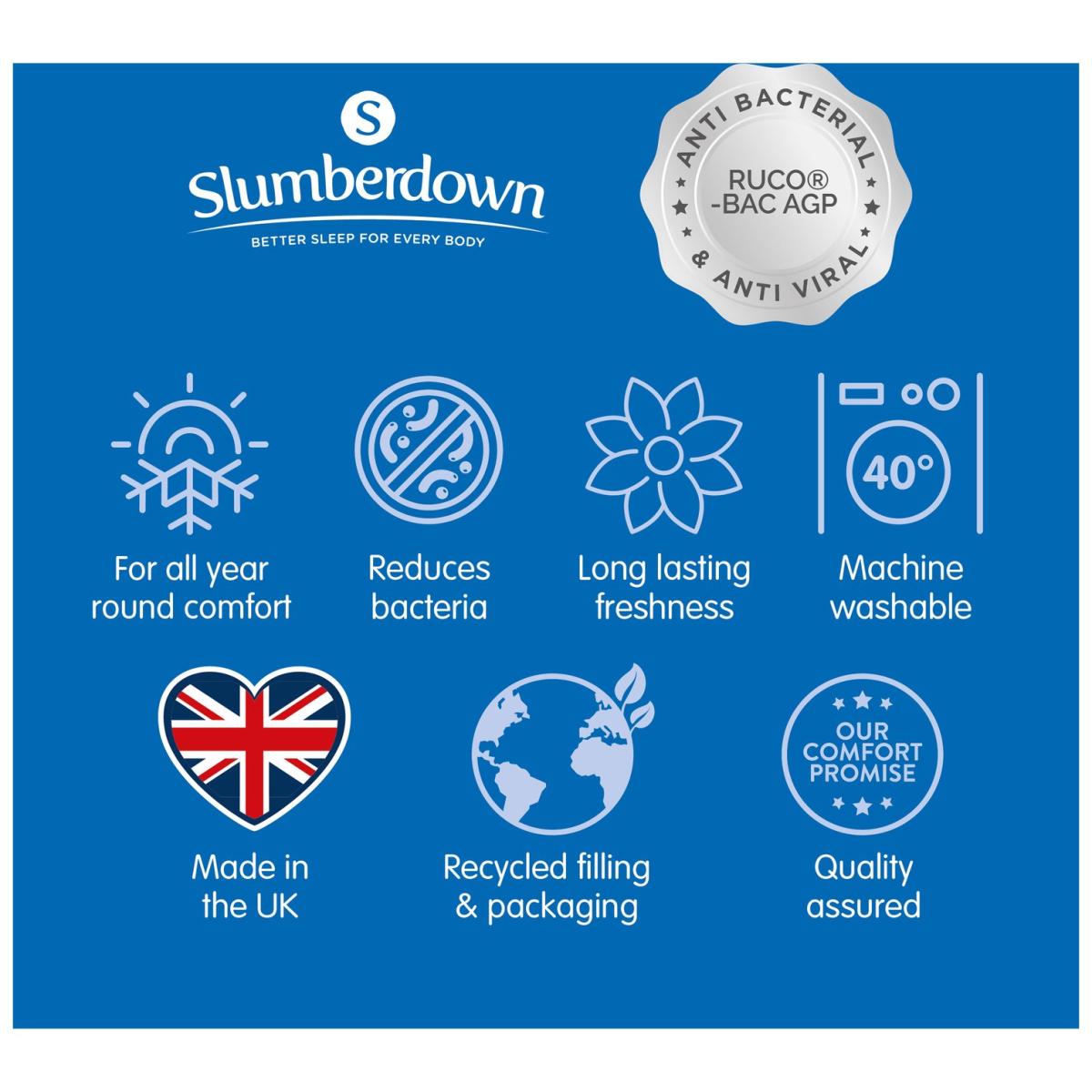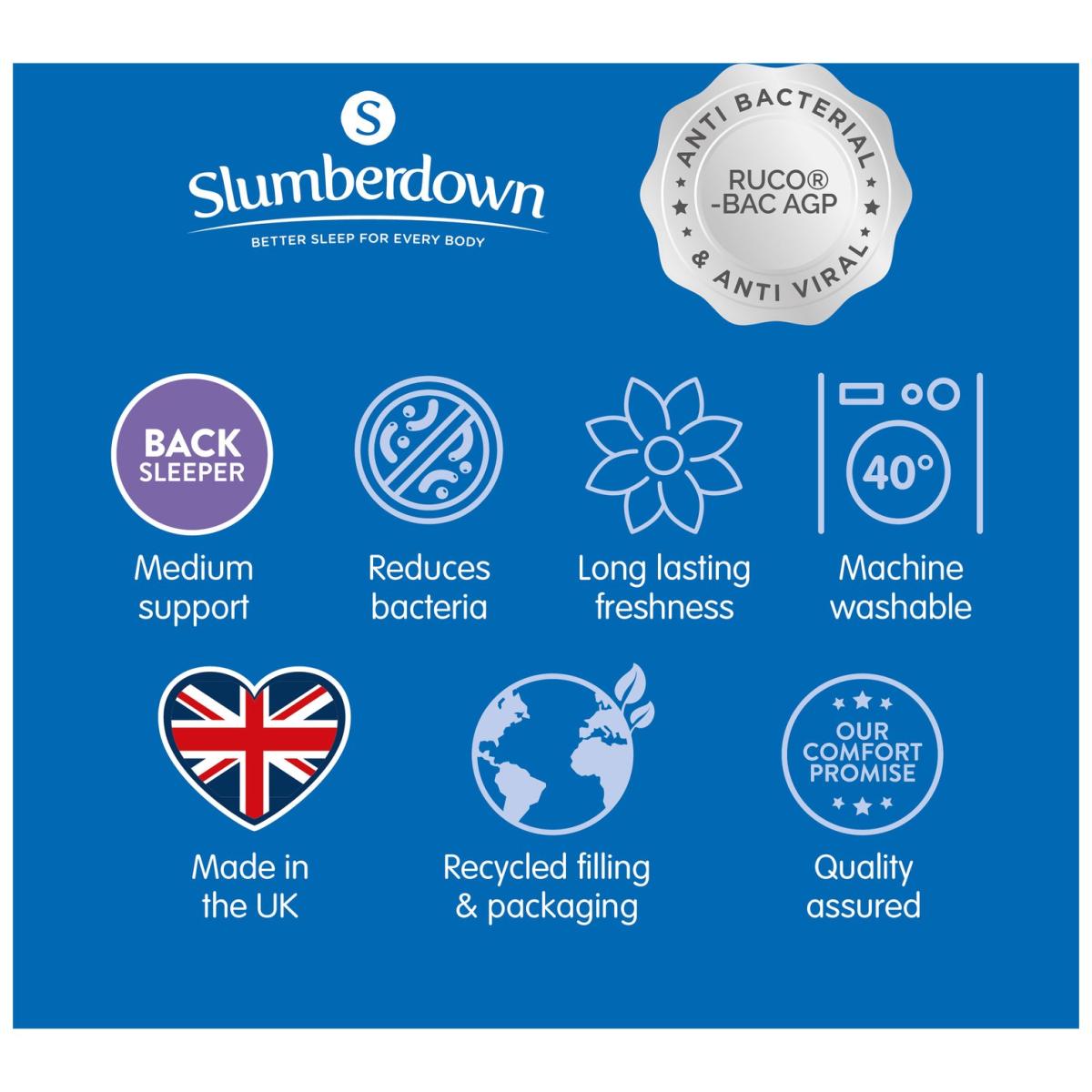 The Slumberdown total protection range has been formulated using a fast acting anti bacterial and anti viral treatment, allowing you to have all the benefits of an anti allergy product with the added anti viral protection, resulting in a fresher and healthier sleep space. The soft touch cover offers great support for your head and neck, ensuring you wake up refreshed, the pillow offers Medium support which is ideal if you sleep on your front or back. What's more the product is easy care which means its machine washable and can be tumble dried.