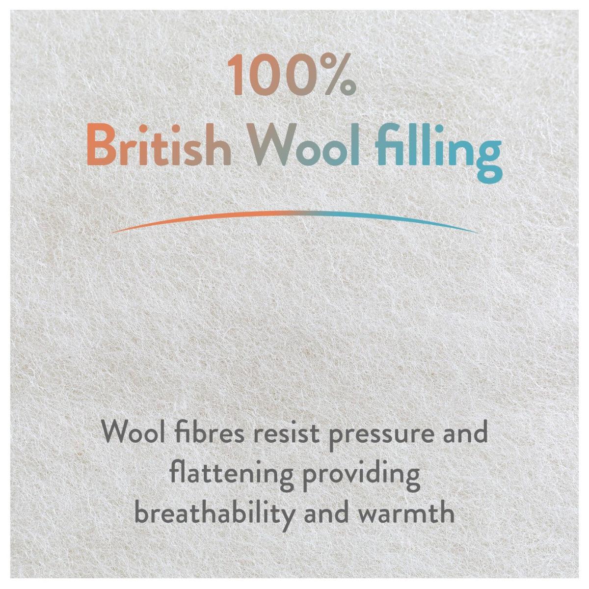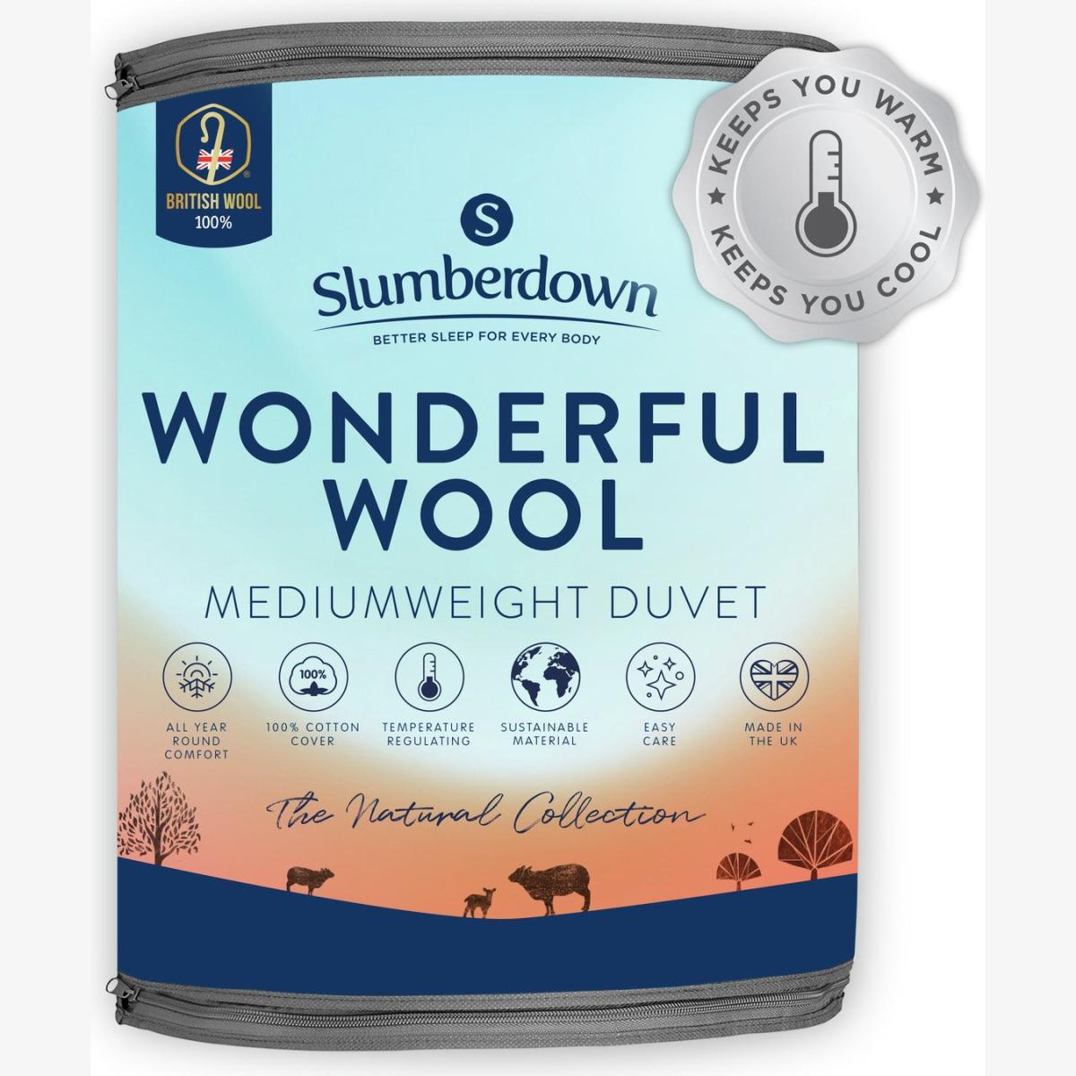 At Slumberdown we believe everybody deserves a good nights sleep. The Slumberdown Wonderful Wool medium weight duvet has a soft 233 thread count cotton cover and is filled with our beautifully soft 100% British wool. Wool is temperature regulating allowing you stay cool in the summer and warm in the winter, making it perfect for any season. The duvet is fully breathable, offers anti allergy, anti bacterial protection and its hypoallergenic. What's more the duvet is self-cleaning so a regular airing will keep it fresh. Made in the UK. King size duvet. Cover made from 100% cotton percale. Filling made from 100% wool. Size L230, W220cm. Anti-allergy.