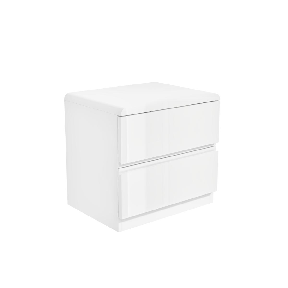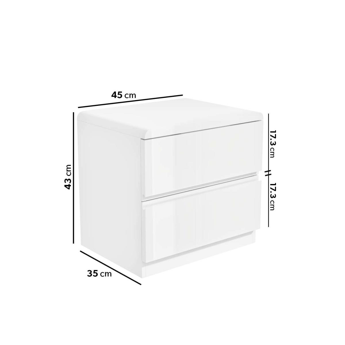 Features we love White high gloss bedside table with 2 drawers. Narrow proportions make it easy to fit into any room Modern and seamless design with integrated handles. Adds a classy and luxurious feel to your space. From our Lyra space-saving bedroom furniture range All about me. The perfect piece for creating a contemporary abode this slim bedside table would make a stylish addition to any bedroom. The white high gloss finish gives it a natural shine and it'll coordinate well with any décor. It'll look fresh and modern for years to come. It features two drawers with integrated handles which give it a seamless look; for keeping your bedside essentials close at hand yet clutter-free. The curved top provides plenty of room too perfect for setting down your bedtime read as well as standing a lamp and an alarm clock within easy reach. The full Lyra compact bedroom furniture collection is available to complete the look and comes in grey too. Need to know. Overall dimensions. W45 x D35 x H43 cm Each internal drawer dimensions. W45 x D32.5 x H11.5 cm Colour. White Finish. High gloss Material. MDF Number of drawers. 2 Weight. 12.5kg Assembly required. Yes.