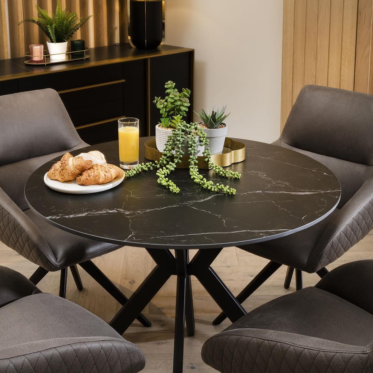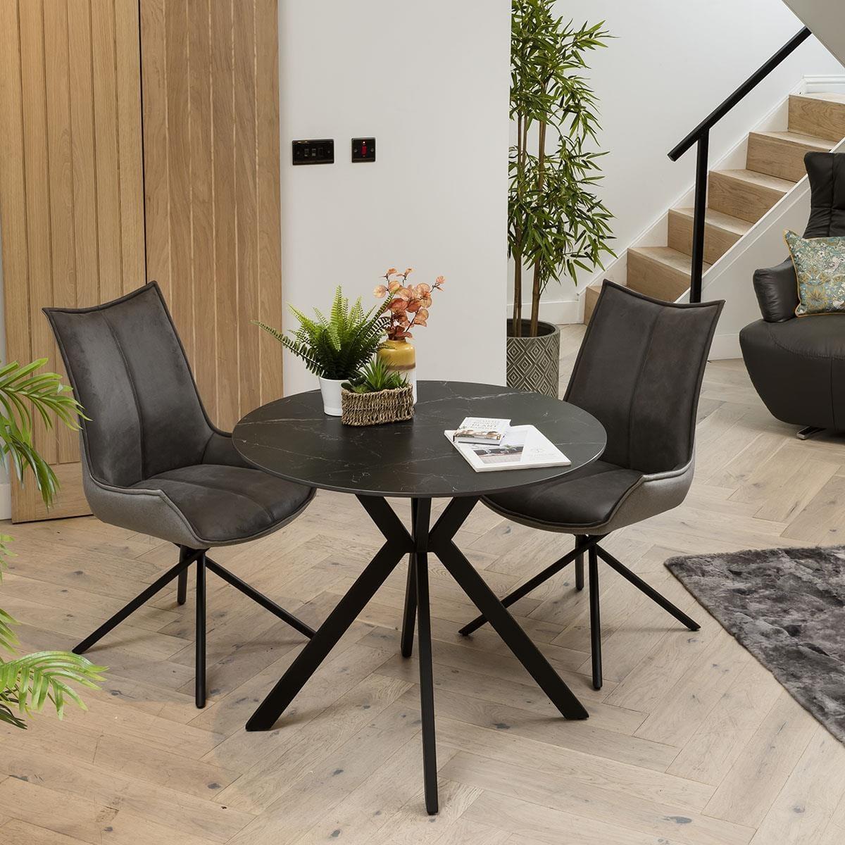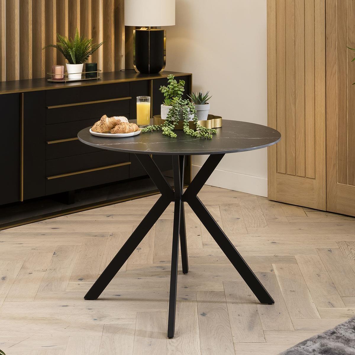 This 4-seater dining table is thoughtfully designed to elevate your dining space while ensuring a comfortable and intimate gathering for you and your loved ones. The 90cm diameter matte finish of the black ceramic marble round dining table combined with its modern metal leg design blends into any contemporary setting. At 90cm in diameter, this compact dining table is the epitome of space-efficient design, making it an ideal choice for cosy dining areas or apartments. The luxurious marble effect ceramic top in sleek black adds an air of timeless opulence to your space. Crafted with meticulous attention to detail, the ceramic surface boasts remarkable scratch, stain, and heat resistance, ensuring your table remains pristine and beautiful even through everyday use. Gently run your fingers across the matte finish of the ceramic top, and you'll instantly feel the premium quality of our dining table. The minimalist yet striking design is anchored by a sturdy 4-point black metal base, providing both stability and a captivating visual contrast. This table seamlessly blends into any contemporary setting, making it an ideal centerpiece for modern homes seeking a touch of understated luxury. Elevate your dining experience with the allure of our Small Round Dining Table. It's not just a piece of furniture; it's a statement of refined taste and practicality. Create unforgettable moments with friends and family around this captivating masterpiece, and indulge in the joy of fine dining without compromising on style. Upgrade your living space today with this exceptional dining table that effortlessly marries form and function. W90cm D90cm H75cm 4 Seater Round Ceramic Marble Dining Table Ceramic is scratch, stain and heat resistant