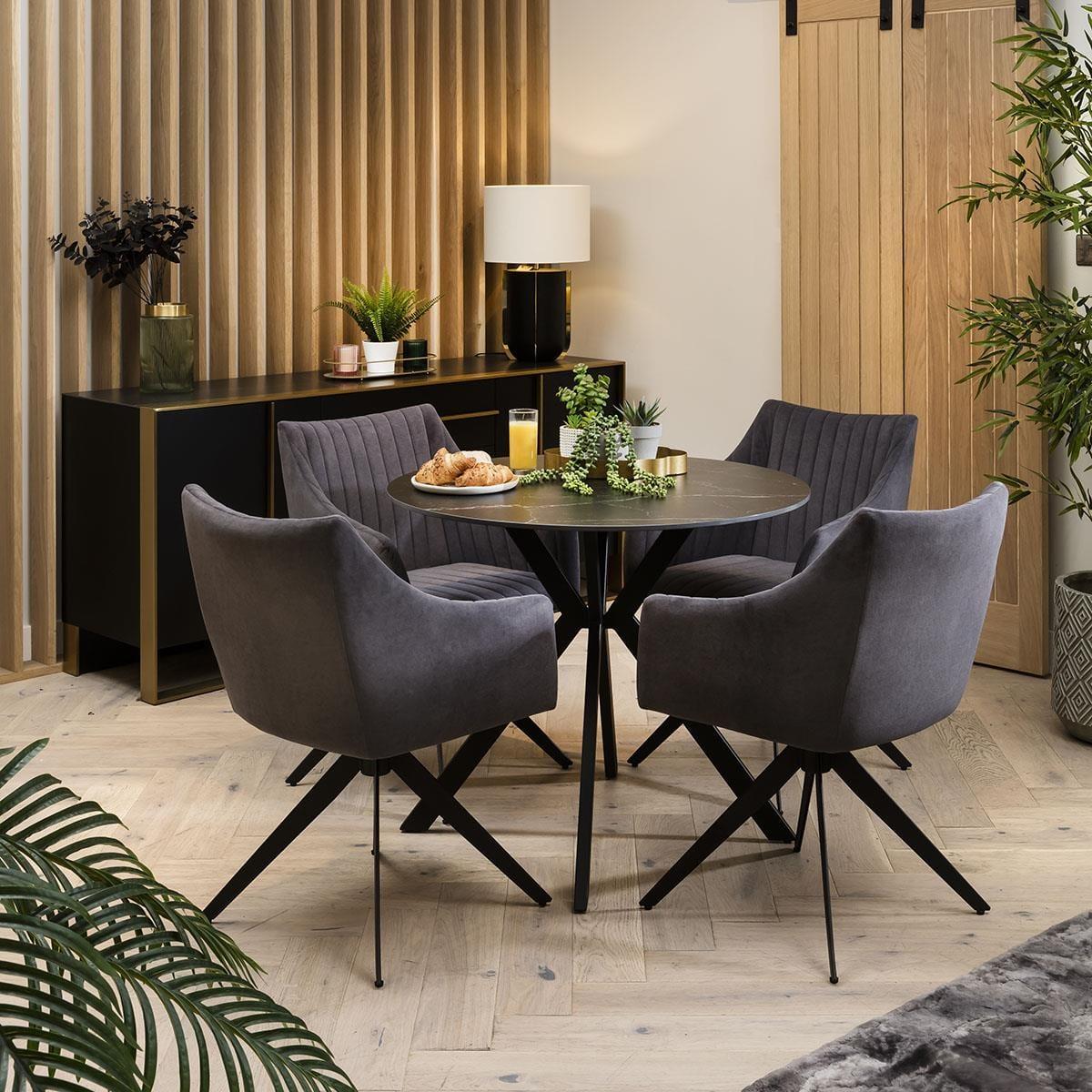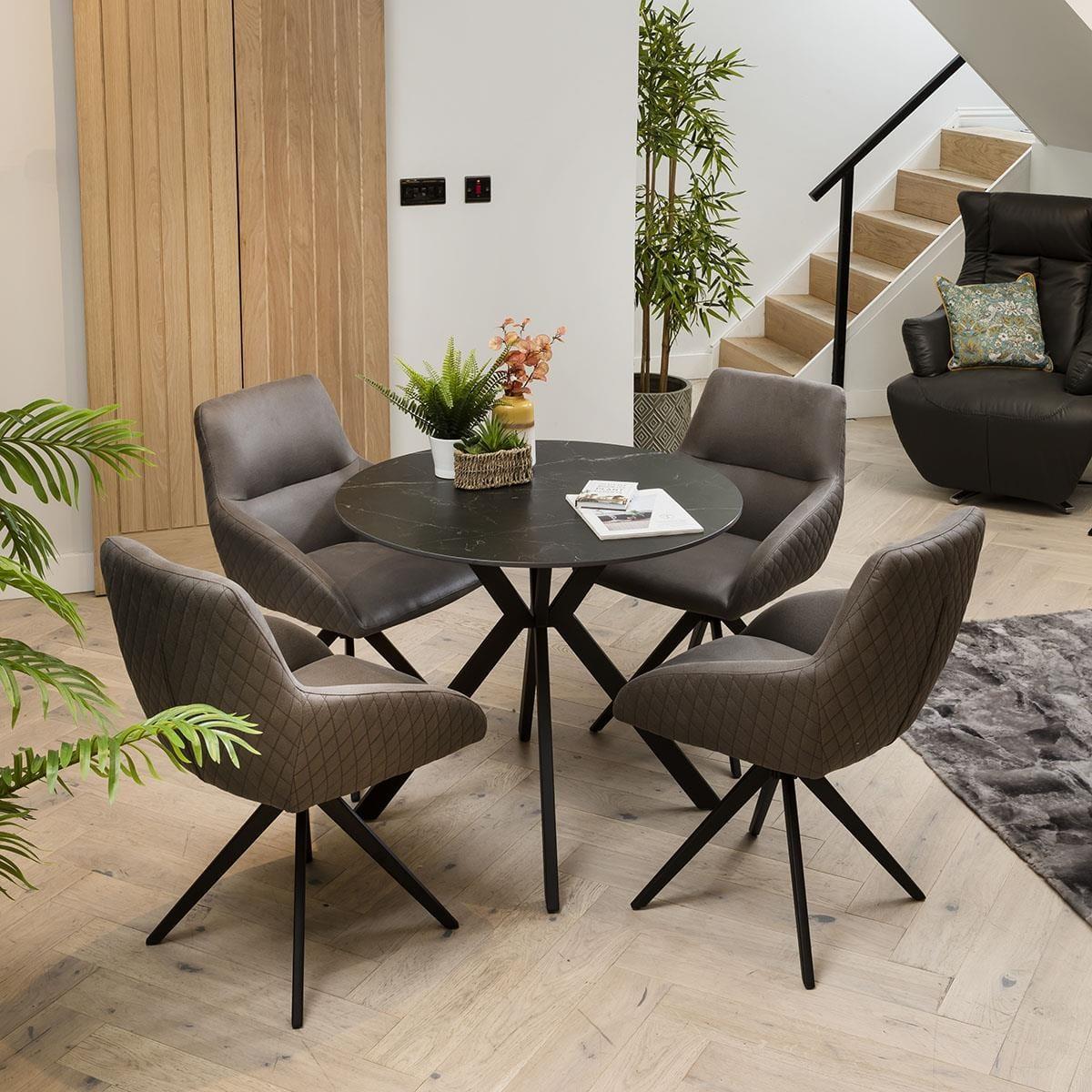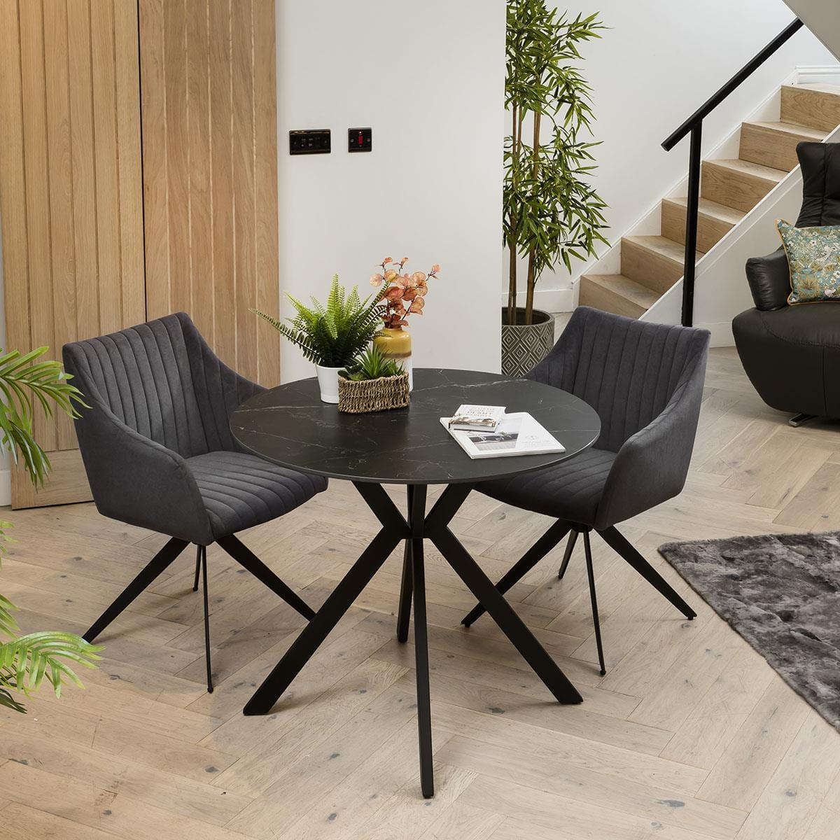 This 4-seater dining table is thoughtfully designed to elevate your dining space while ensuring a comfortable and intimate gathering for you and your loved ones. The 90cm diameter matte finish of the black ceramic marble round dining table combined with its modern metal leg design blends into any contemporary setting. At 90cm in diameter, this compact dining table is the epitome of space-efficient design, making it an ideal choice for cosy dining areas or apartments. The luxurious marble effect ceramic top in sleek black adds an air of timeless opulence to your space. Crafted with meticulous attention to detail, the ceramic surface boasts remarkable scratch, stain, and heat resistance, ensuring your table remains pristine and beautiful even through everyday use. Gently run your fingers across the matte finish of the ceramic top, and you'll instantly feel the premium quality of our dining table. The minimalist yet striking design is anchored by a sturdy 4-point black metal base, providing both stability and a captivating visual contrast. This table seamlessly blends into any contemporary setting, making it an ideal centerpiece for modern homes seeking a touch of understated luxury. Elevate your dining experience with the allure of our Small Round Dining Table. It's not just a piece of furniture; it's a statement of refined taste and practicality. Create unforgettable moments with friends and family around this captivating masterpiece, and indulge in the joy of fine dining without compromising on style. Upgrade your living space today with this exceptional dining table that effortlessly marries form and function. W90cm D90cm H75cm 4 Seater Round Ceramic Marble Dining Table Ceramic is scratch, stain and heat resistant