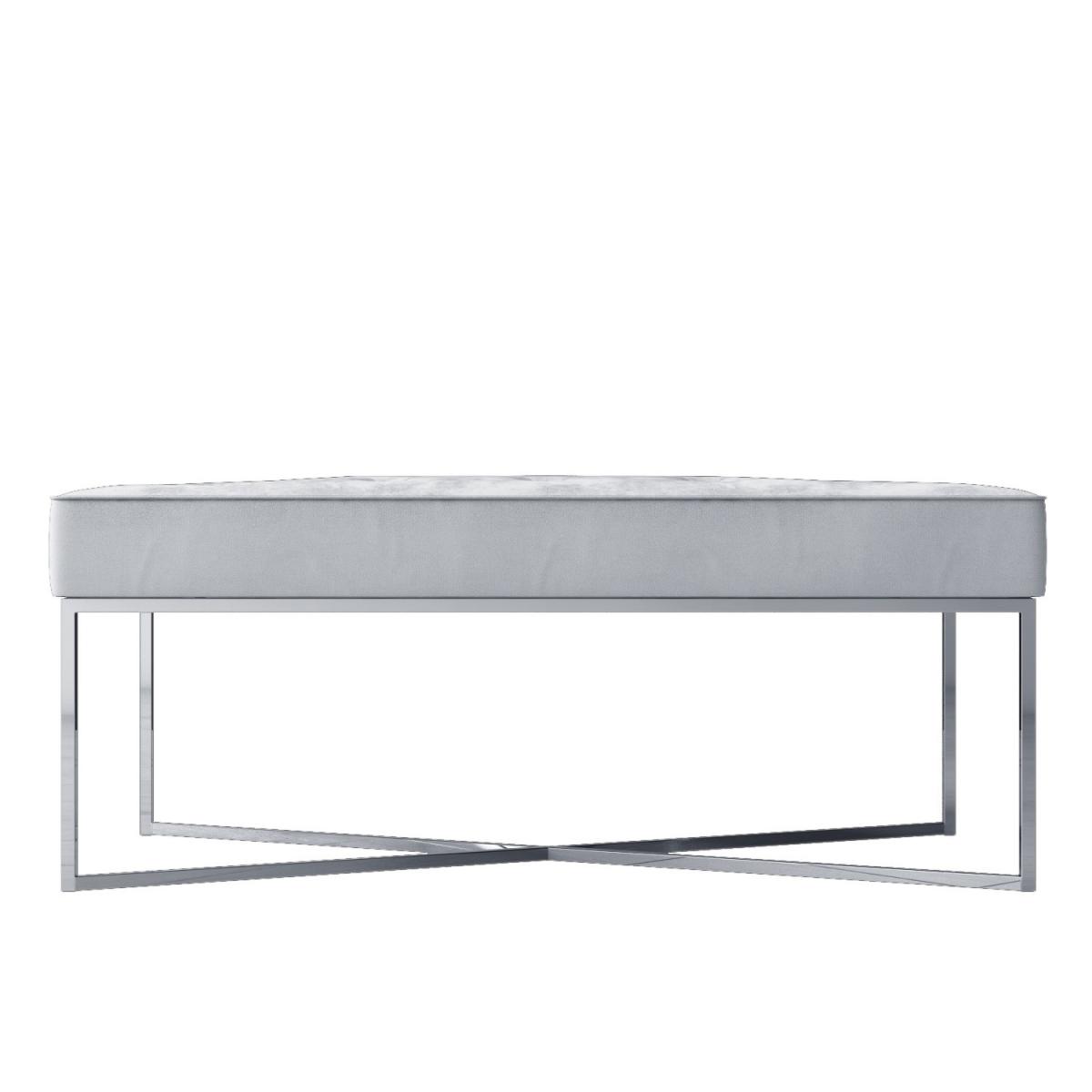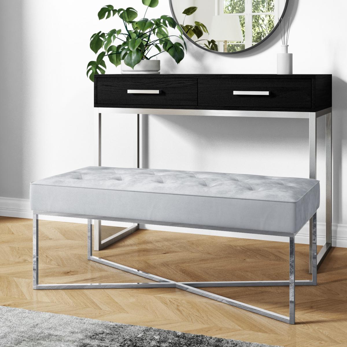 Features we love Perfectly fitting for a bedroom living room or hallway. It's right on-trend with its irresistible soft plush velvet finish. Sturdy silver open frame contrasts beautifully with the silver-grey upholstery Thick buttoned quilted top gives it a neat luxurious touch. Available in two other colours – baby pink and anthracite grey All about me. Add a hint of glam with this Esme bench. Beautifully upholstered in a plush silver-grey velvet fabric it features a quilted button top to give it an elegant and stylish finish. A shiny silver open frame base in a criss-cross design completes the look while also creating an illusion of space. It's perfect as additional seating and serves as a stylish footstool too. Position it in the hallway for practicality in the hub of your living room or bedroom at the end of your bed for an immediate focal point. There's no assembly either so can use it right away. Need to know. Overall dimensions. H38 x W100 x D46 cm Number of hinges. 2 Colour. Silver-grey Finish. Velvet and shiny legs Material. Velvet and metal Weight. 10kg Assembly required. No.