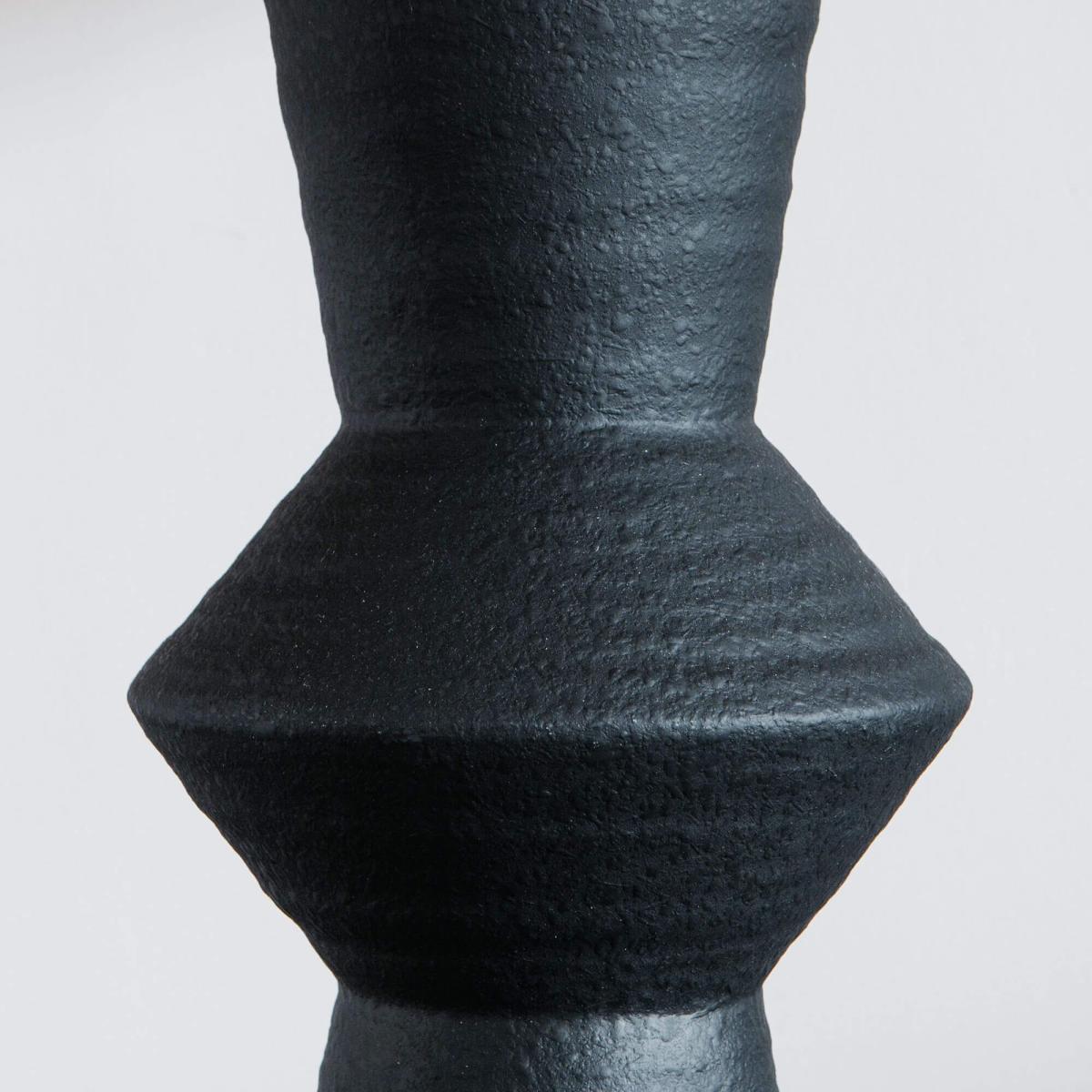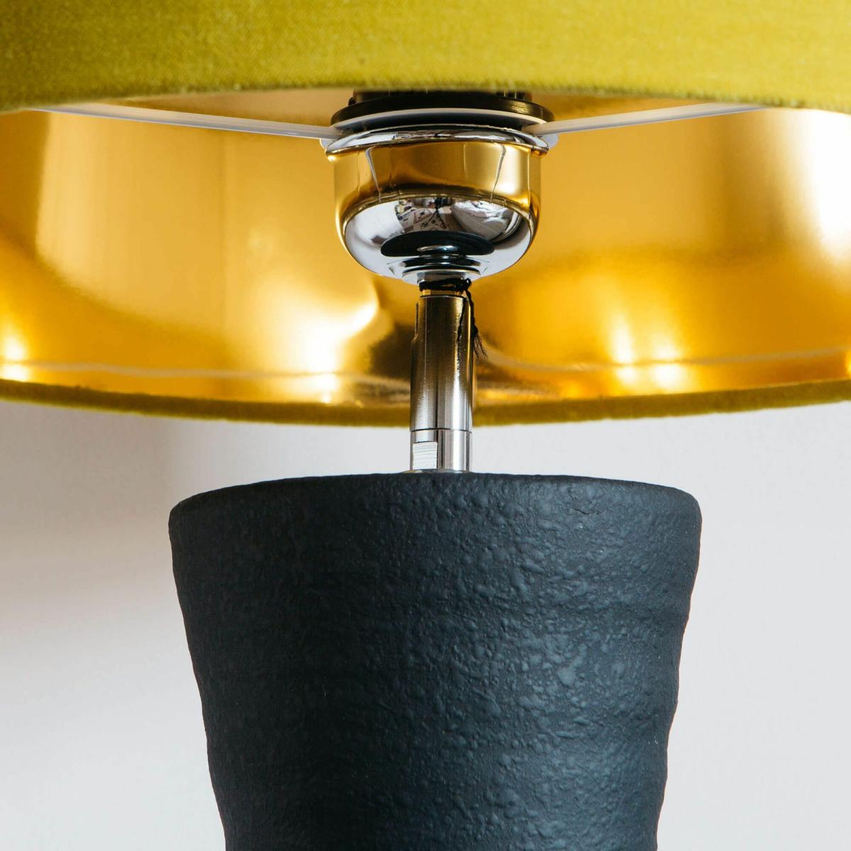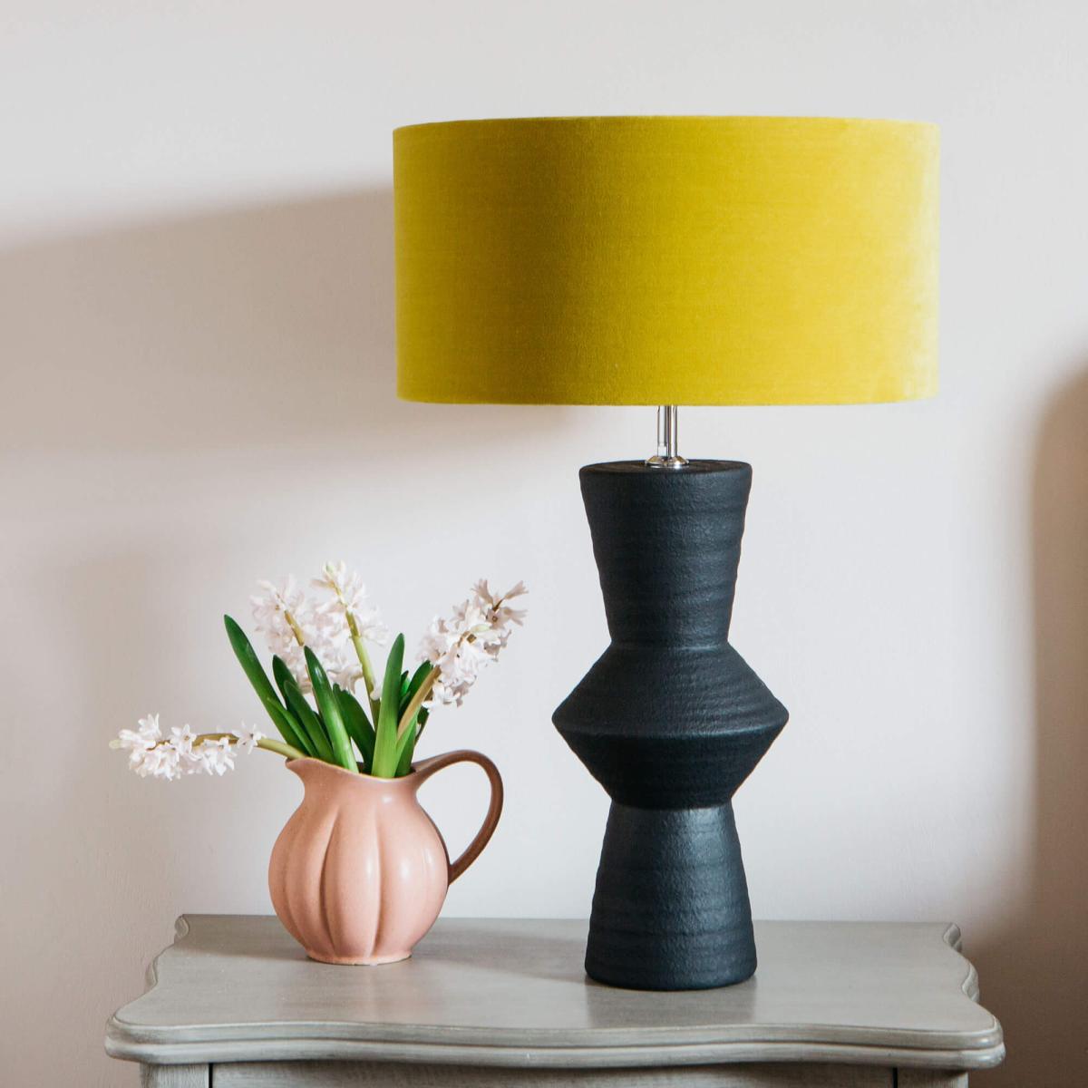 A matte black ceramic lamp with a sculptural silhouette, top with a textural lampshade in a brightly coloured shade to complement the minimalist look.