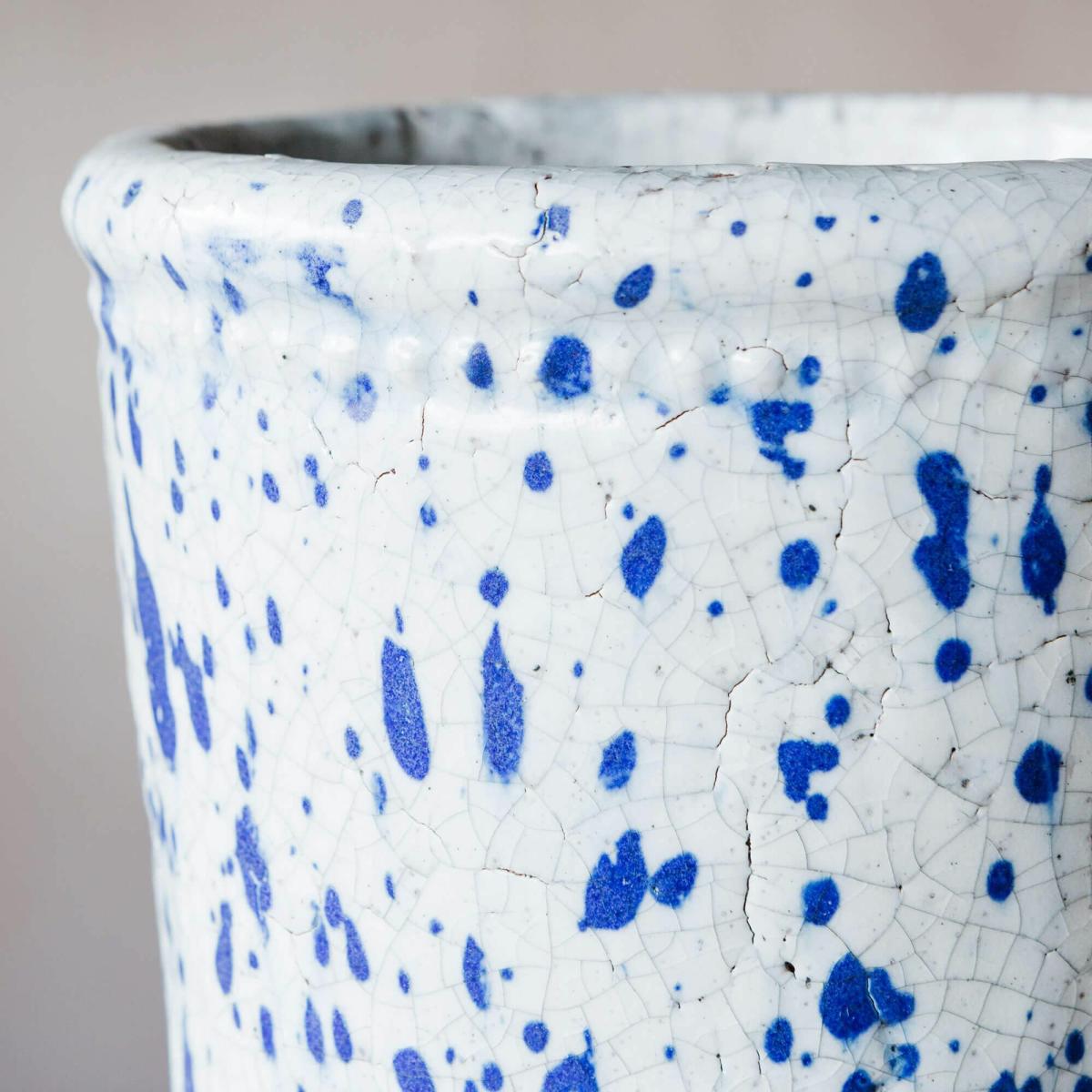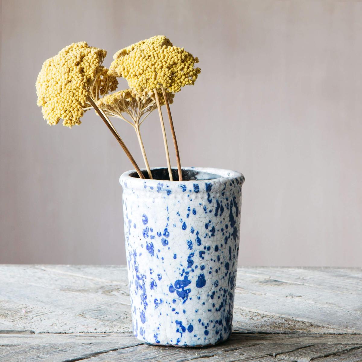 Fill this small painterly vase with dried flowers that complement the splattered blue colour and unusual crackle finish.