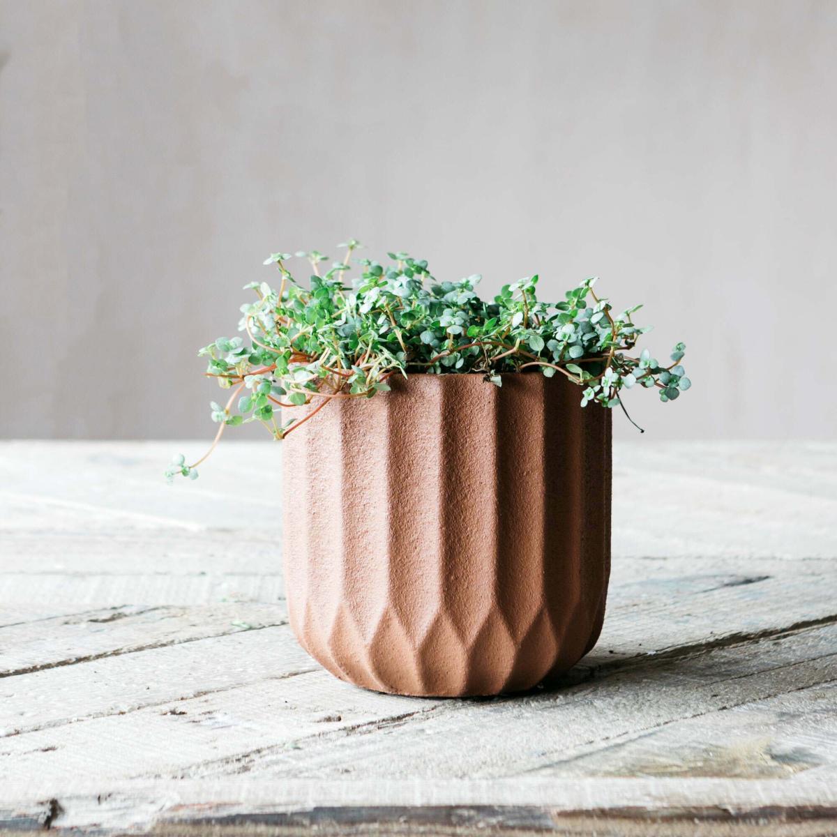 The colour of warm brown terracotta and with a defined geometric design, this ribbed cement planter becomes the ideal home for your small-sized plants, cacti and succulents so your budding passion can flourish along with them.