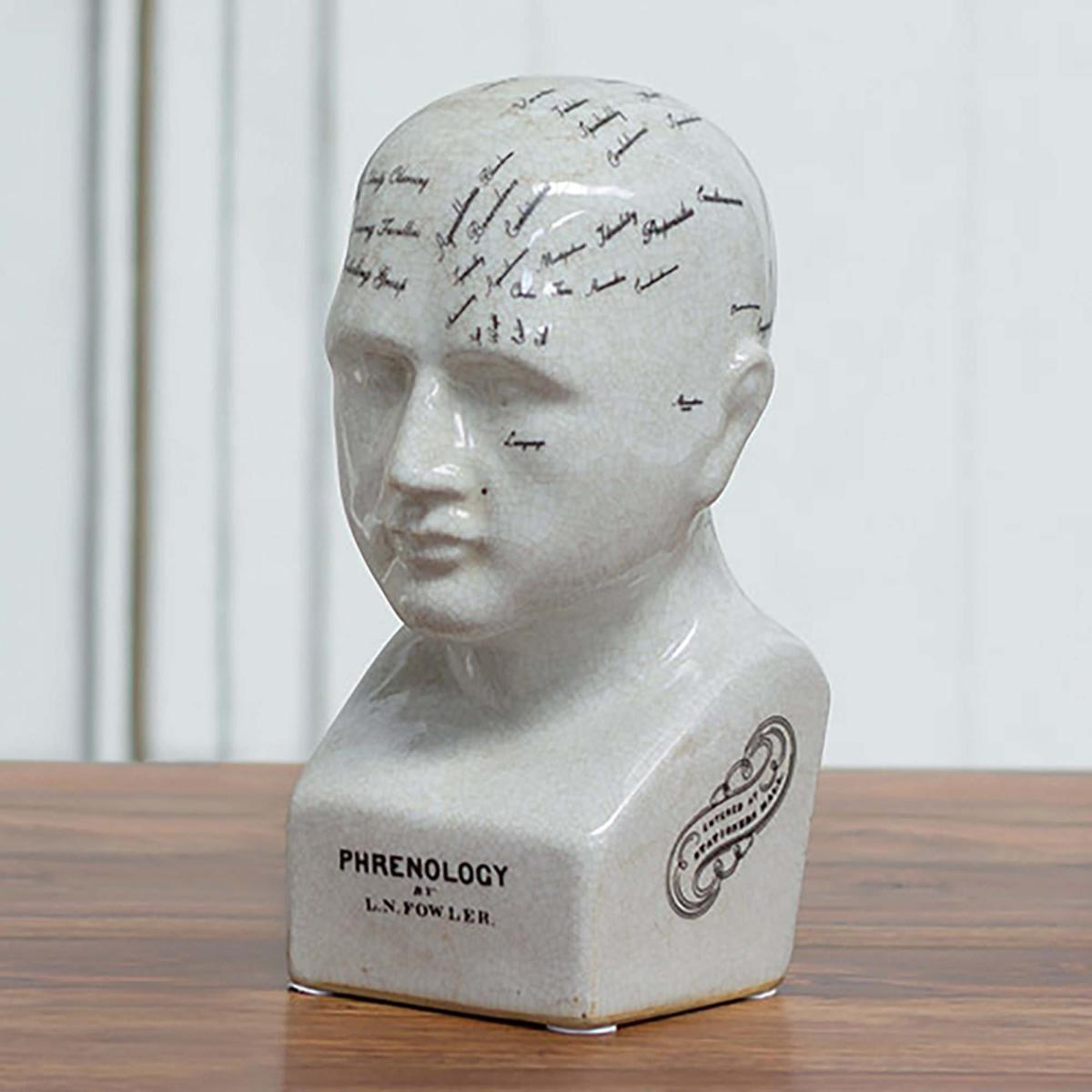 A wonderfully unusual phrenology head once used to map the regions of the mind. Made of ceramic with a grey crackle glazed finish with hand-painted black writing.