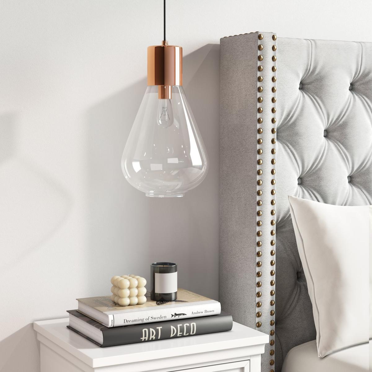 Features we love Understated yet contemporary on-trend ceiling light. With contrasting and stunning copper metal finish. An all-round design that looks good alone or in multiples. Height adjustable cable between 50 and 120cm. The clear shade is perfect for a striking filament bulb All about me. Give any room in your home an instant style update with this simplistic Sorrento ceiling light. With a clear glass shade similar to an oversized contemporary bulb and contrasting polished copper details it’s easy to style thanks to its understated yet elegant design. As the bulb is exposed an attractive filament bulb would give it that final touch. It’s dimmable and LED compatible too so you’re free to add your own lighting effect. It would look great as hallway lighting or even be installed in two’s or three’s above your dining space or kitchen island. Need to know. Overall dimensions. W23 x D23 x H50 (min) 120 (max) cm Shade dimensions. W23 x D23 x H28 cm Ceiling rose dimensions. W10 x D10 x H2.5 cm Exposed wire length. 78cm Range. Sorrento Style. Modern Fixture design. Ceiling pendant Switch type. On-Off Number of lights. 1 Bulb type. E27 Maximum wattage. 40W IP rating. IP20 Colour. Clear and copper Finish. Clear glass and ancient brass metal (shade top and ceiling rose) Material. Glass metal and PVC (cable) LED compatible. Yes Dimmer compatible. Yes Bulb included. No Weight. 1.47kg Fixings supplied. Yes Assembly required. Yes height adjustable upon installation Warranty. 1 year.