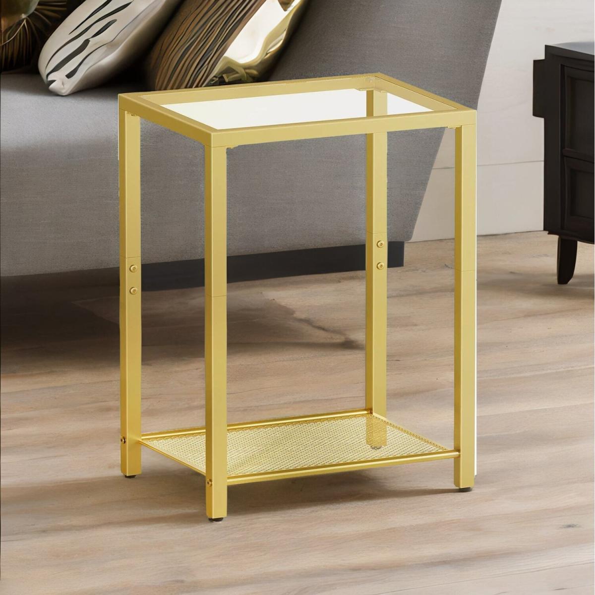 The interplay of transparent glass and a golden frame yields warm, translucent tones that exude both fashion and artistry. The pure color combination embodies the essence of minimalist art, infusing your home with a distinct style and refined taste. This gold glass side table thrives in small spaces, offering dual storage capabilities. Coffee, snacks, magazines, and your remote control find a convenient place within arm's reach. The amalgamation of 4 mm thick tempered glass, a gold metal frame, and a bottom iron mesh results in steadfast support for this small coffee table. The tabletop boasts a weight capacity of 20 kg, while the mesh accommodates up to 5 kg, ensuring the safety of your belongings. The transparent tempered glass surface simplifies daily cleaning, effortlessly handling minor stains and light dust. A quick wipe with a damp cloth restores this small side table to its pristine condition in no time. With its uncomplicated design, detailed instructions, labeled components, and the necessary tools provided, you can assemble this side table in just 20 minutes. Follow the steps and securely connect each part using the included wrench.
