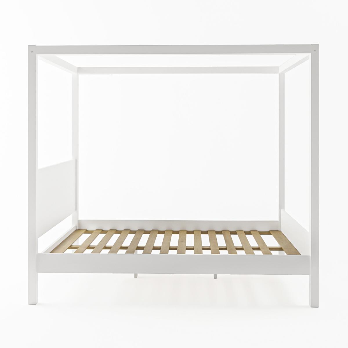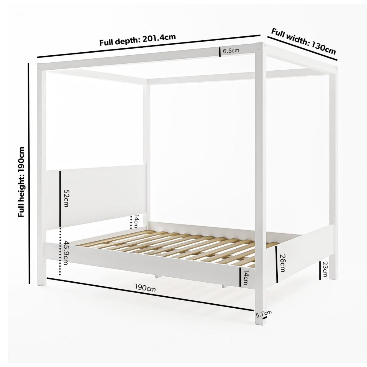 The classic four-poster design is updated with a fresh white finish, making it a perfect statement piece for modern bedrooms. Made from solid pine wood with a sturdy slatted base, the Victoria bed is built to last, offering long-term support and stability. The crisp white paint adds a touch of sophistication and complements any colour scheme or decor style. The integrated headboard offers comfortable support for sitting up in bed, effortlessly combining functionality with stylish design. The raised floor design provides generous space beneath the bed, ideal for storing boxes, bedding, or other essentials, perfect for keeping your bedroom tidy and organised. Elevate your bedroom with the Victoria Four Poster Bed, where classic style meets modern comfort. With its crisp white finish, built-in headboard, and practical underbed storage, it’s a statement piece that’s as functional as it is beautiful. It fits a UK standard small double size mattress, which isn't included, giving you the freedom to choose one that's perfect for you. You can find these in our package deals.