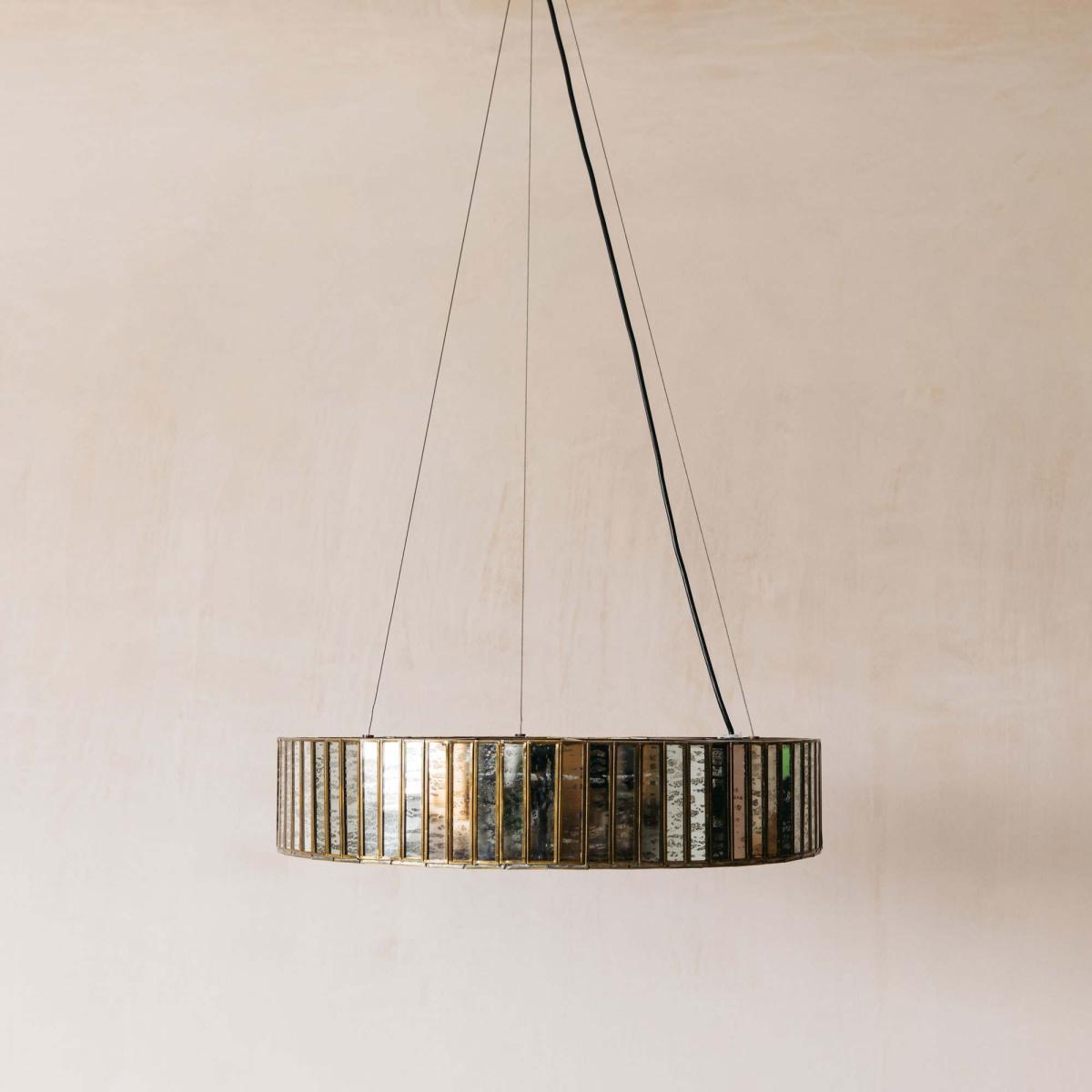 An art deco-inspired chandelier, handcrafted from strips of mottled glass held together in an iron and brass frame with an antiqued copper finish. Available in two sizes.