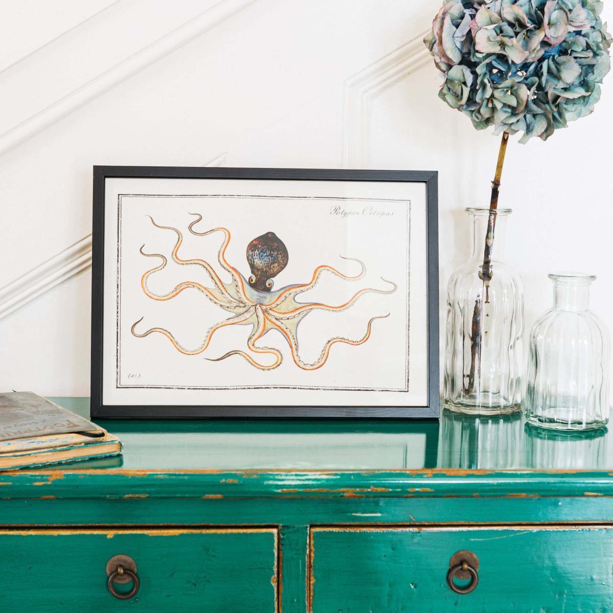 I love this piece because it adds a touch of maritime charm and whimsy without overwhelming a space. The small octopus print works well in a variety of interiors, especially those with coastal, boho, or eclectic schemes. It’s perfect as a focal point on a sideboard, mantle, or in a gallery wall alongside other seaside-inspired artwork. For styling tips, consider pairing it with natural textures like rattan or linen, or placing it near coral or shells for a cohesive nautical look. Its size makes it versatile for smaller walls or to complement larger art installations, making it an easy way to introduce a fun yet refined undersea theme.
