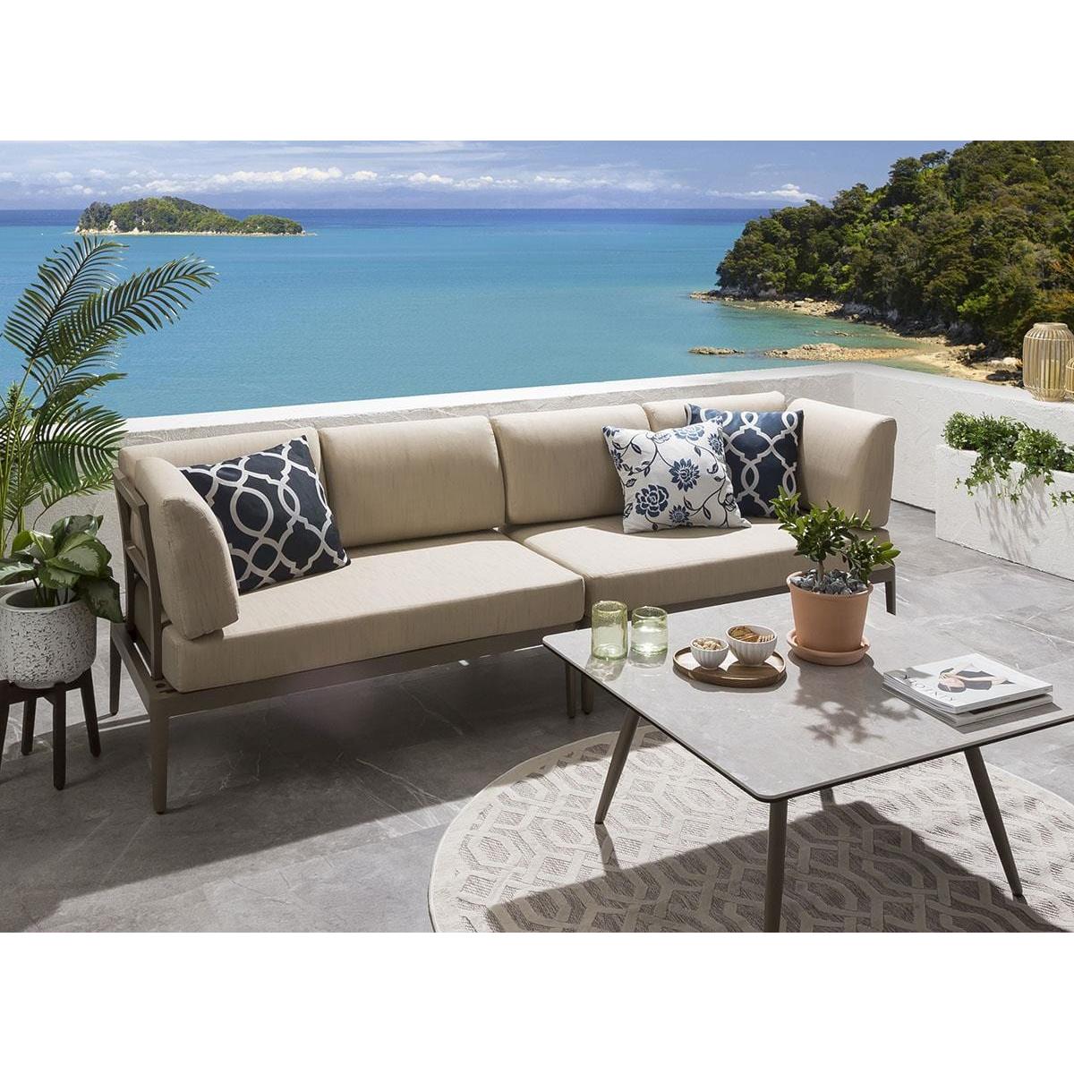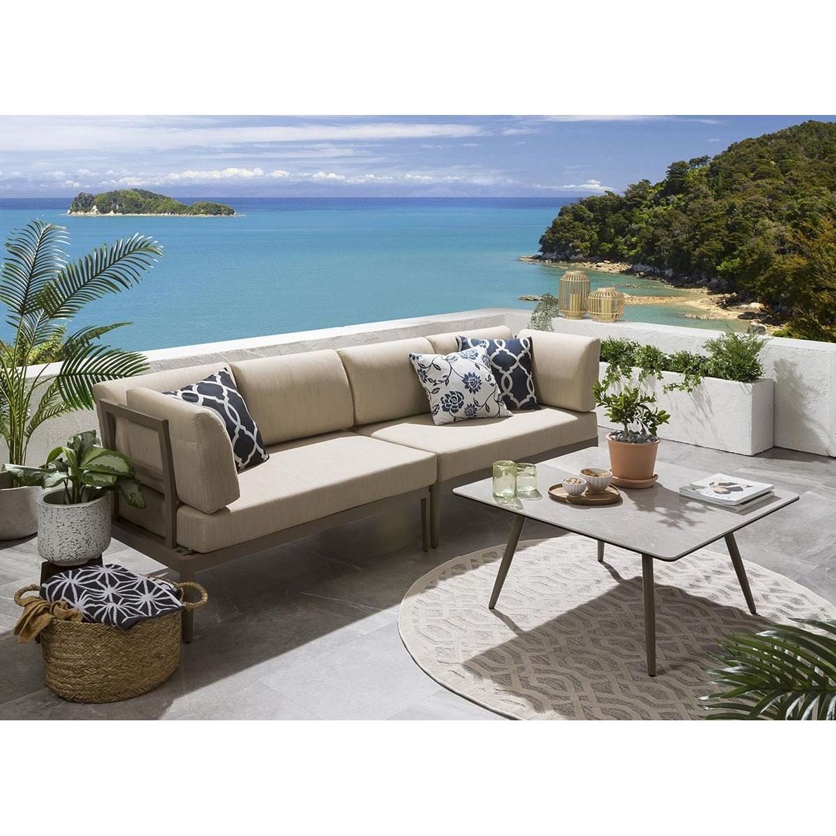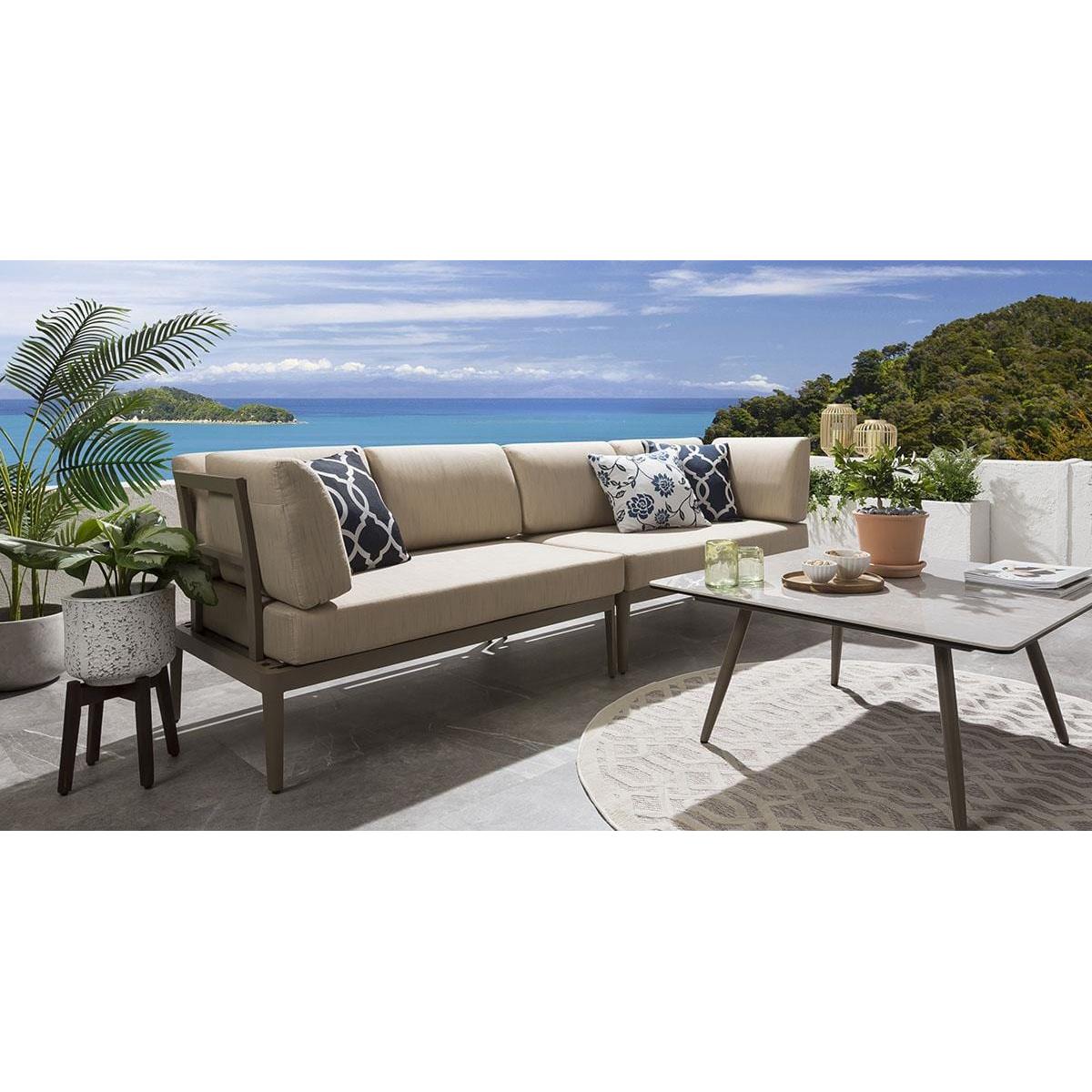 It is the perfect compact beige garden sofa for smaller gardens - including two simple sections that come together to form a luxury 4 seater garden sofa that can be configured in a straight, left or right-hand layout depending on your space. This set also comes with a ceramic coffee table. Our clever Ada Modular Corner Sofa will make a stunning addition to your outdoor seating area or patio. The small garden corner sofa comes complete with our signature luxuriously thick cushioning that offers unbeatable comfort, topped off with rich Beige high-end marine fabric which has amazing resilience to colour fading and damage caused by extreme weather conditions and also a free winter cover. Expertly crafted aluminium frames are highly durable, complemented by clean lines that lend contemporary style. It is robust and weather-resistant for outdoor use & the firm-cushioned seating offers comfortable support that's shower-resistant, but we advise that cushions are stored when not in use. If you need more information about this product, use the Live Chat service to speak to the team or send us a message. Spread the cost our with interest-free finance options. Minimum spend applies. W250cm D200cm H81cm 4-Seater Beige Garden Sofa - Modular Design For Your Outdoor Space Set includes 2 reversible sofa sections & a coffee table
